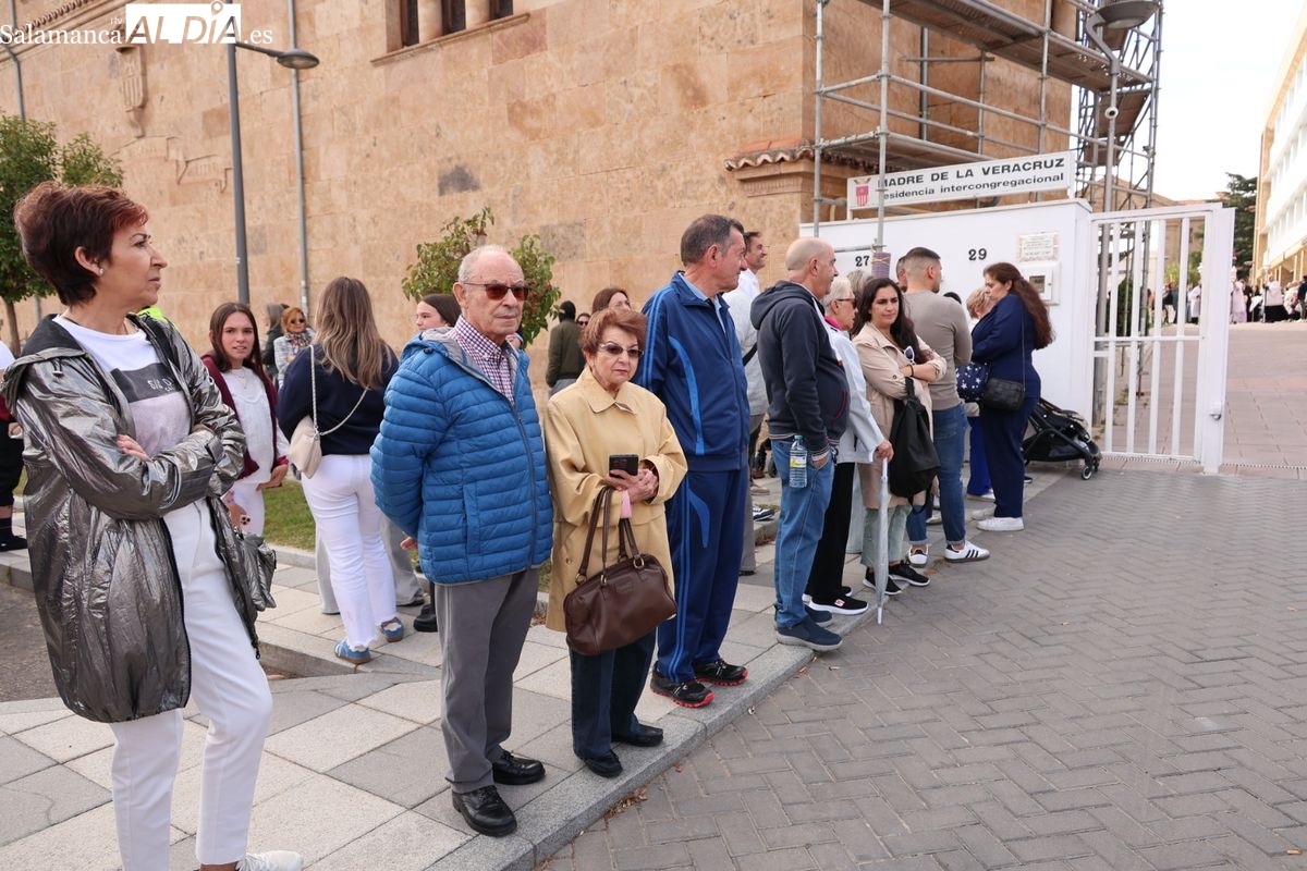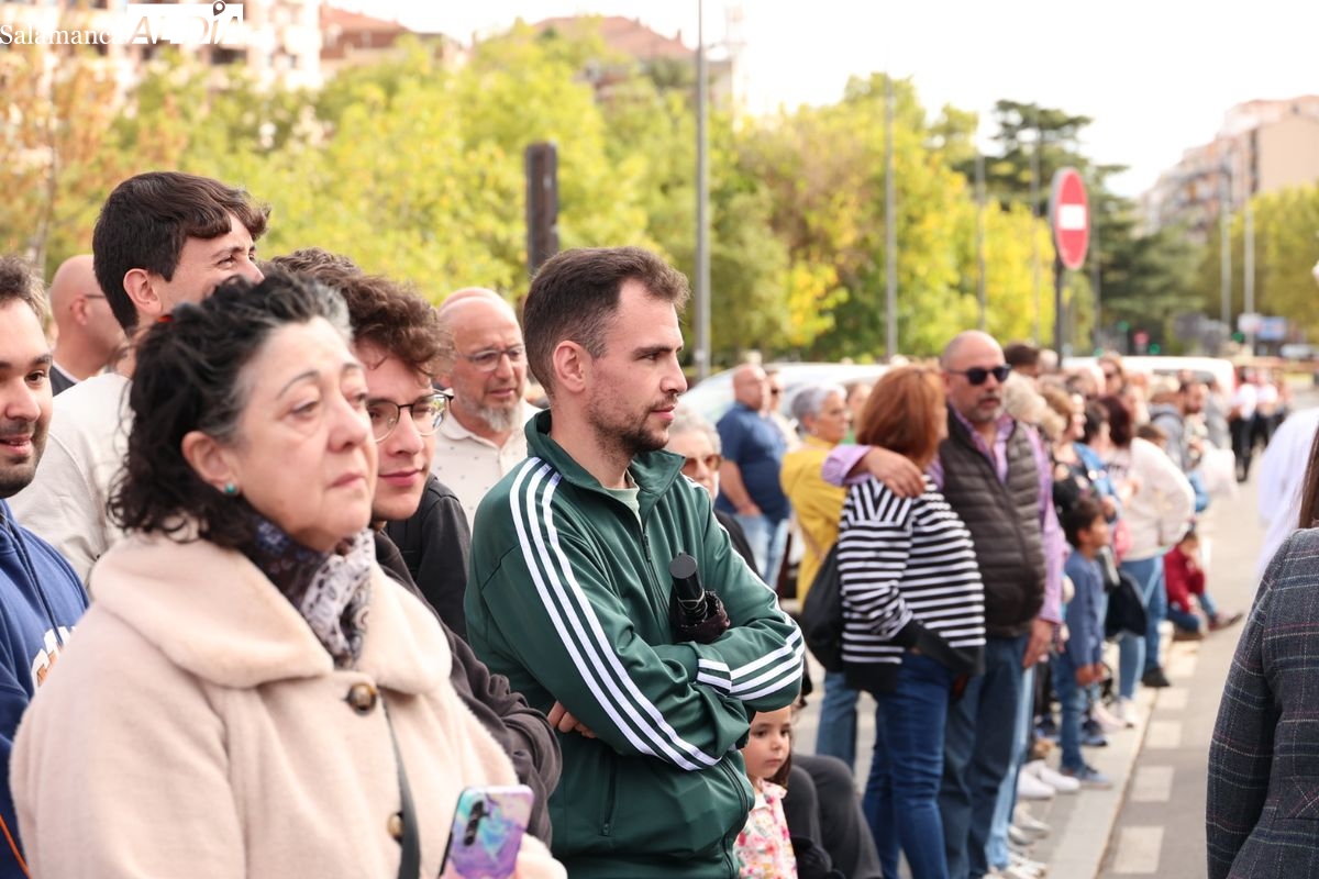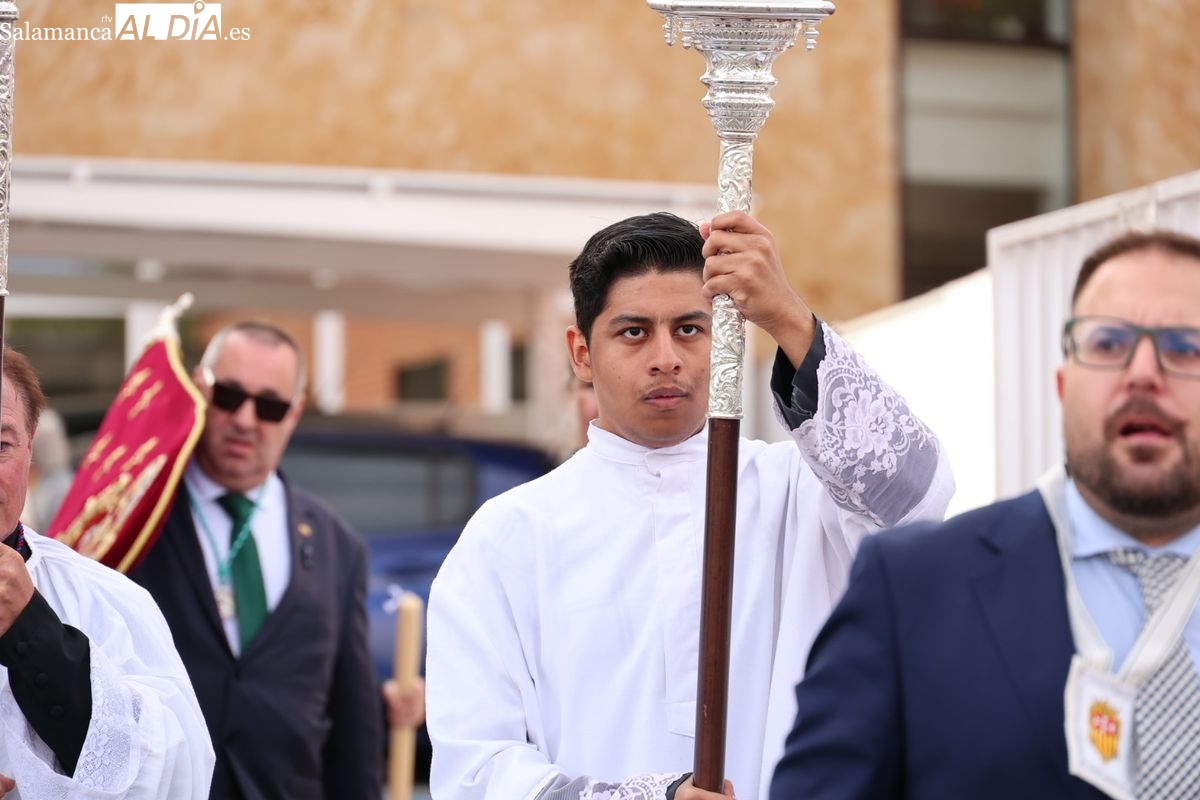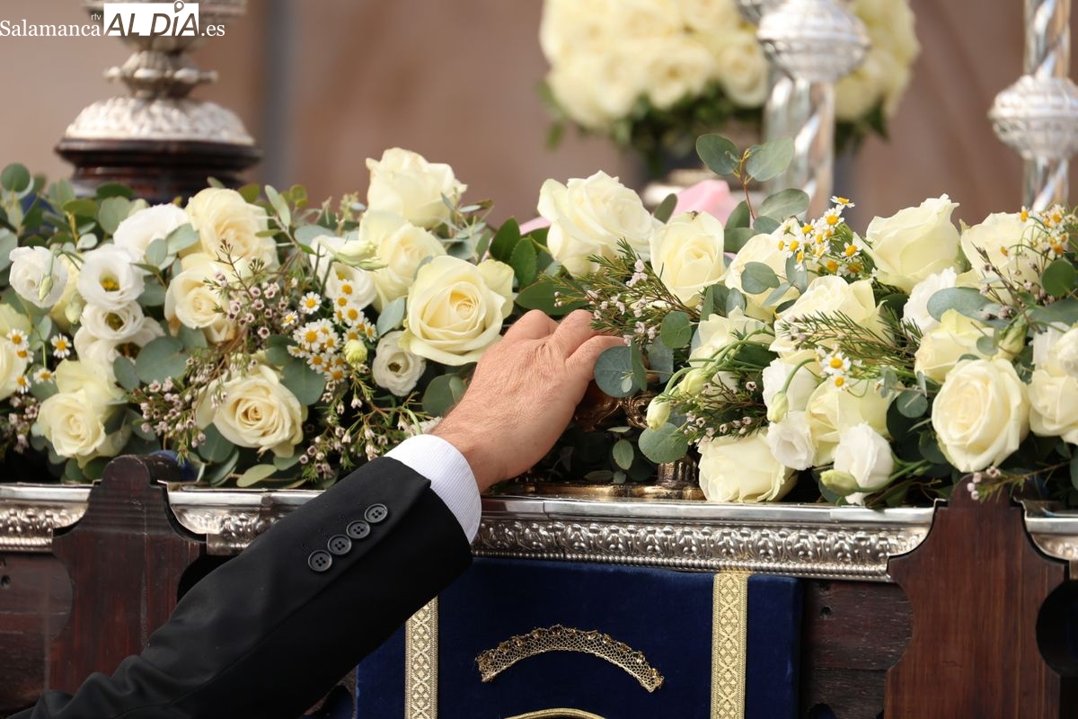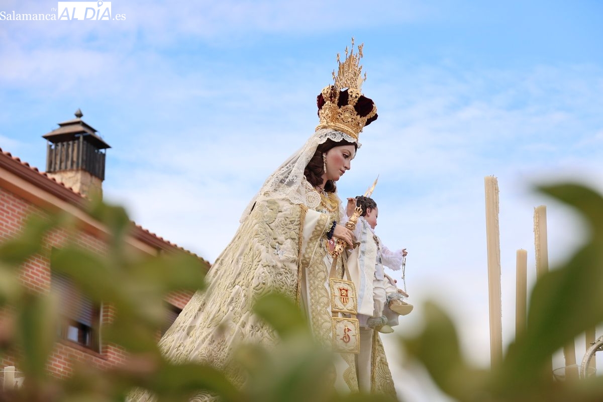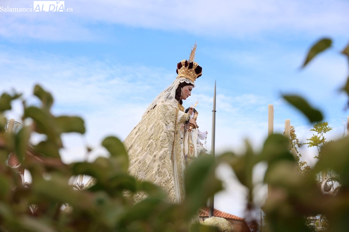 El recorrido ha llevado a la patrona de Salesas y Labradores por la avenida de la Merced, la glorieta de Santiago Martín ‘El Viti’ y el paseo del Doctor Torres Villarroel, para realizar una primera parada con un emotivo acto en la puerta principal del Acuartelamiento General Arroquia. La procesión ha continuado hacia la parroquia de María Mediadora, donde se ha rezado una oración en su entrada, para seguir por las calles Van Dyck, Salesas, Pizarro, Fernando de Rojas, Alonso de Ojeda, Arroyo de la Lastra, Norte, de nuevo Fernando de Rojas, Alfonso VI y la avenida de San Agustín hasta alcanzar la plaza de Toros de La Glorieta. Desde este punto, el cortejo ha emprendido el camino de regreso por la avenida de la Merced hasta su punto de partida en la residencia de Mayores Madre de la Veracruz.