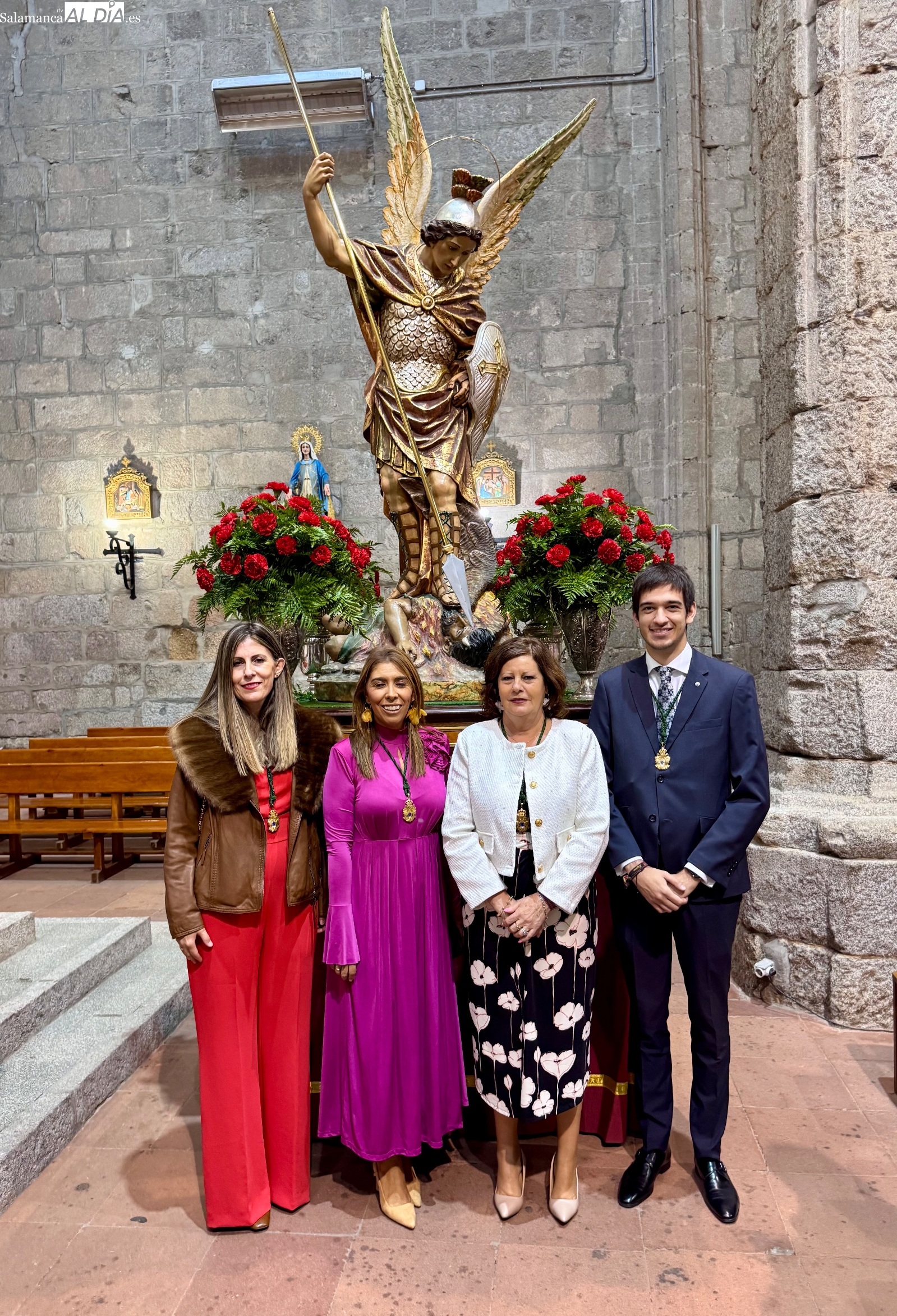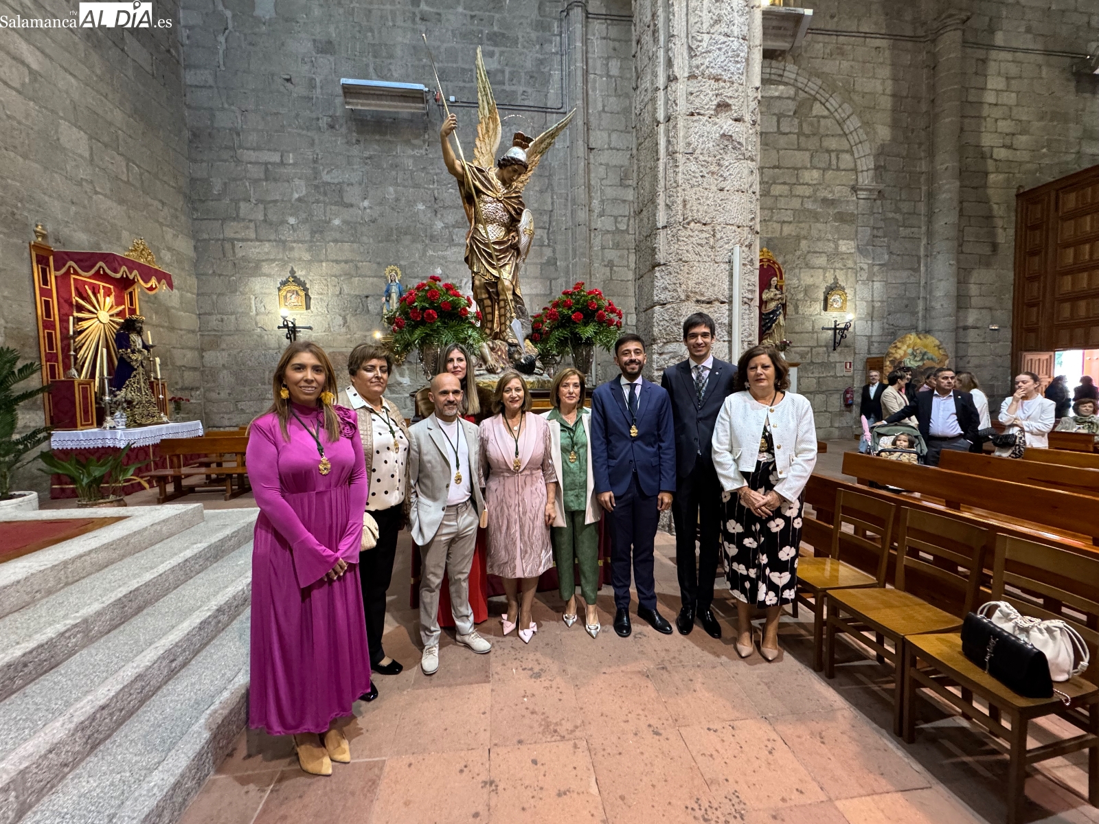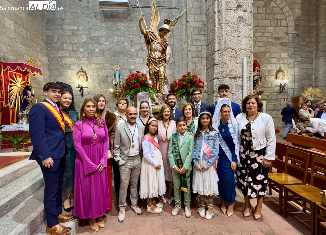 Ya de regreso al templo, los asistentes aprovecharon para tomarse las tradicionales fotografías de familia junto a la histórica talla del Arcángel, en un gesto que se ha convertido en costumbre entre cofrades y vecinos.