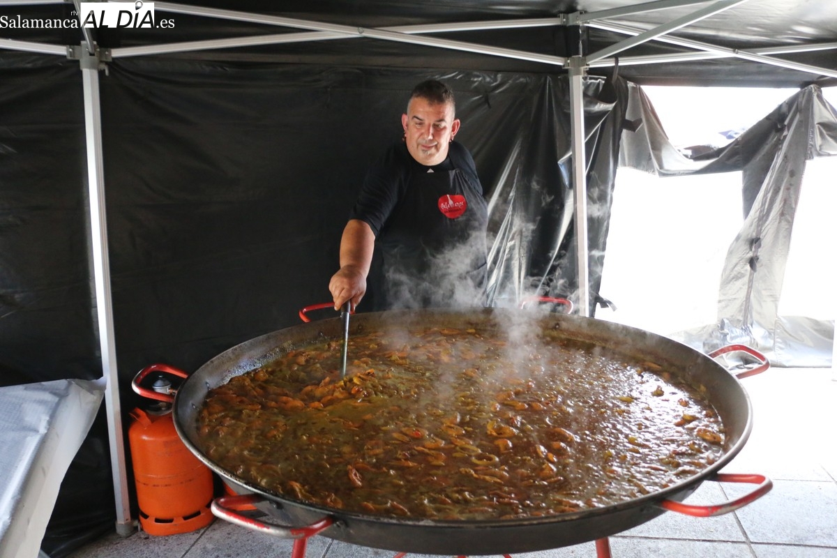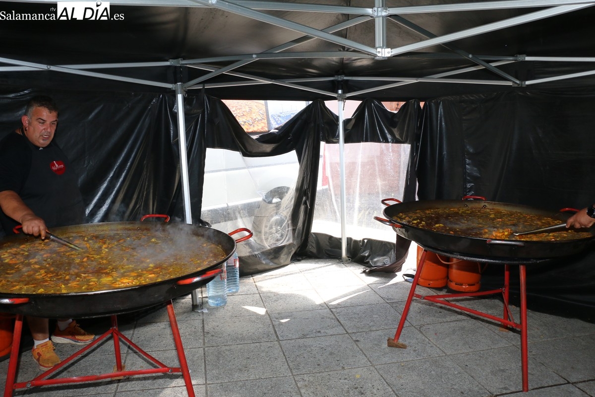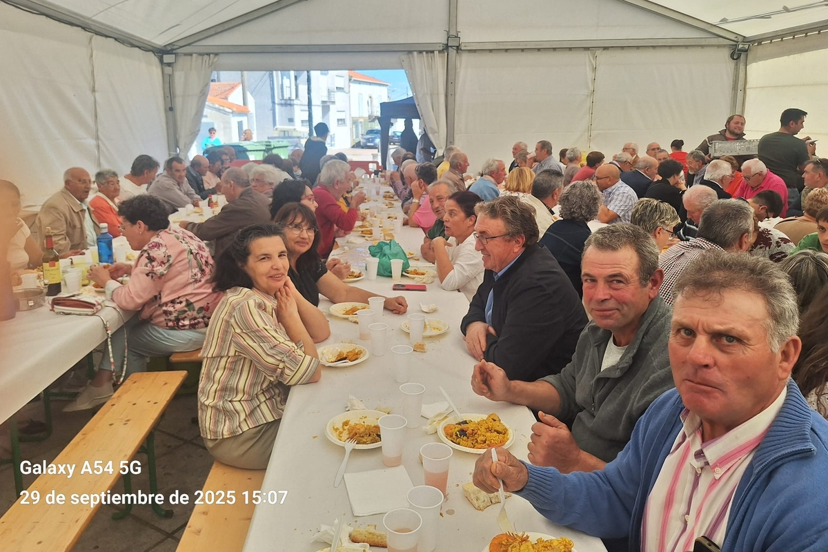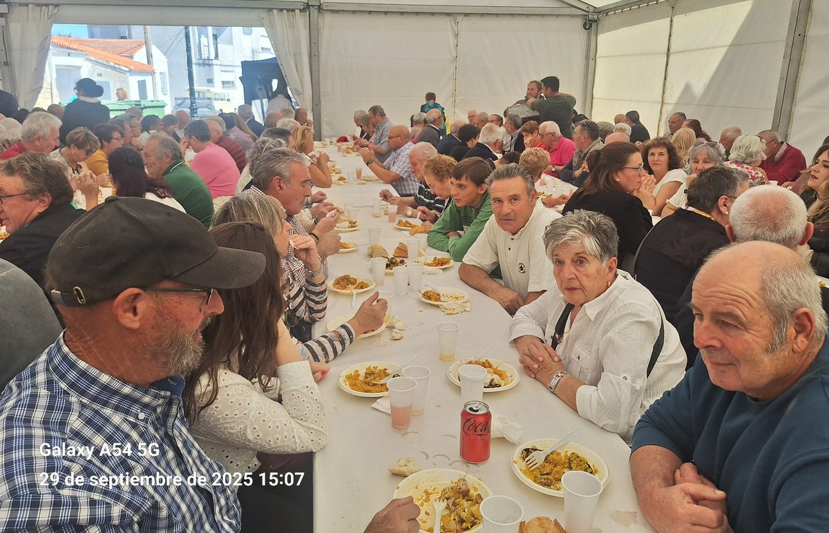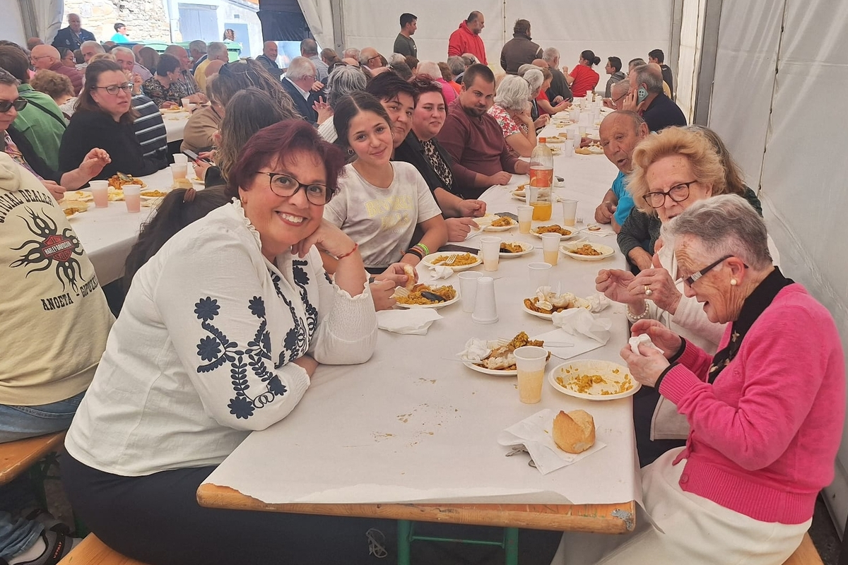 Tras los actos religiosos, la celebración se trasladó al ámbito gastronómico con una gran paella popular. La comida, preparada por Paellas Gigantes David, congregó a unos 180 vecinos y visitantes que compartieron mesa y mantel en un ambiente festivo.