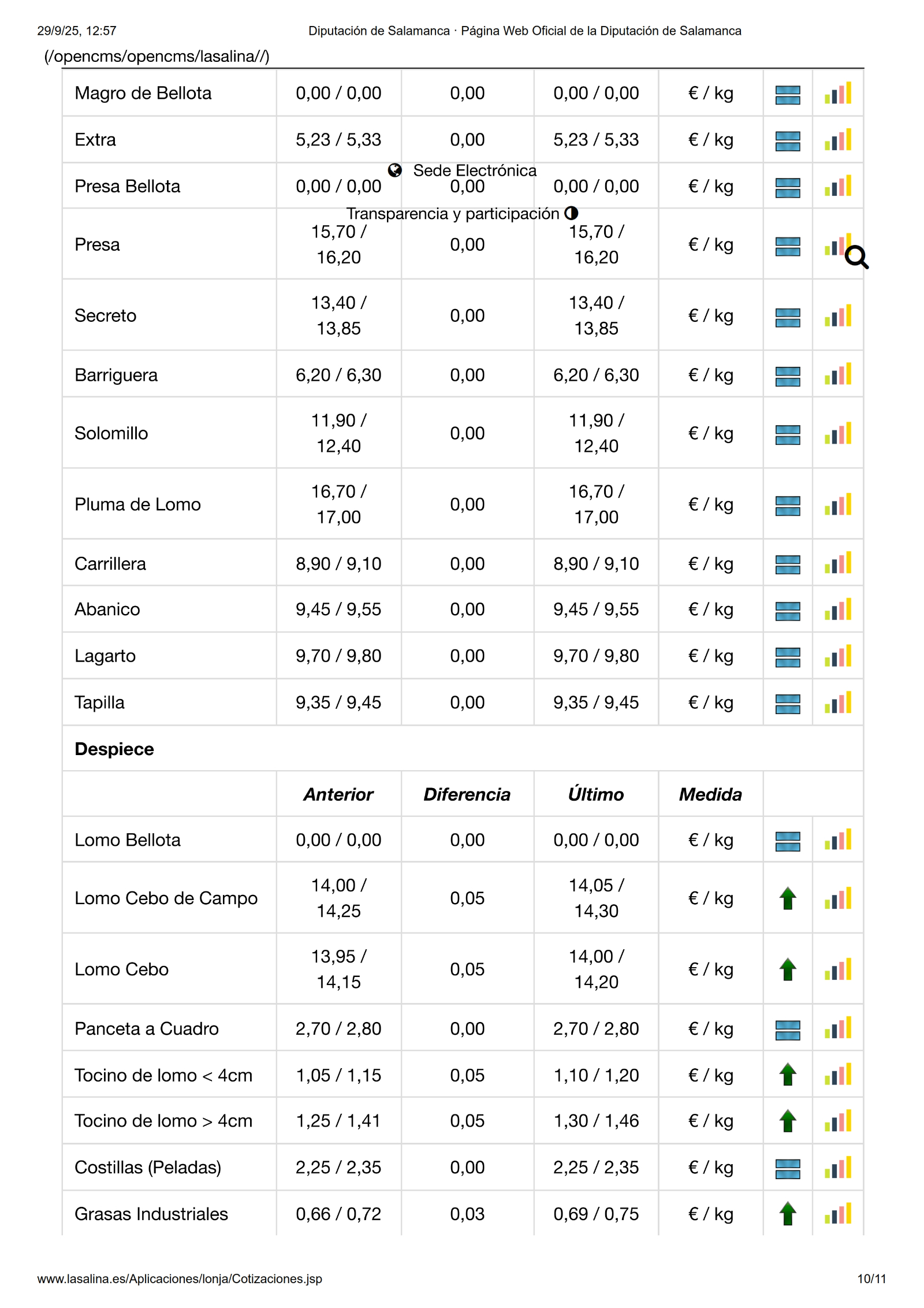 En la Mesa de Despiece de Ibérico las paletas en sangre de cebo de campo y de cebo suben 0,01 €/kg, mientras que el lomo de sendas categorías, y el tocino, suben 0,05 €/kg. Las grasas industriales también suben 0,03 €/kg.