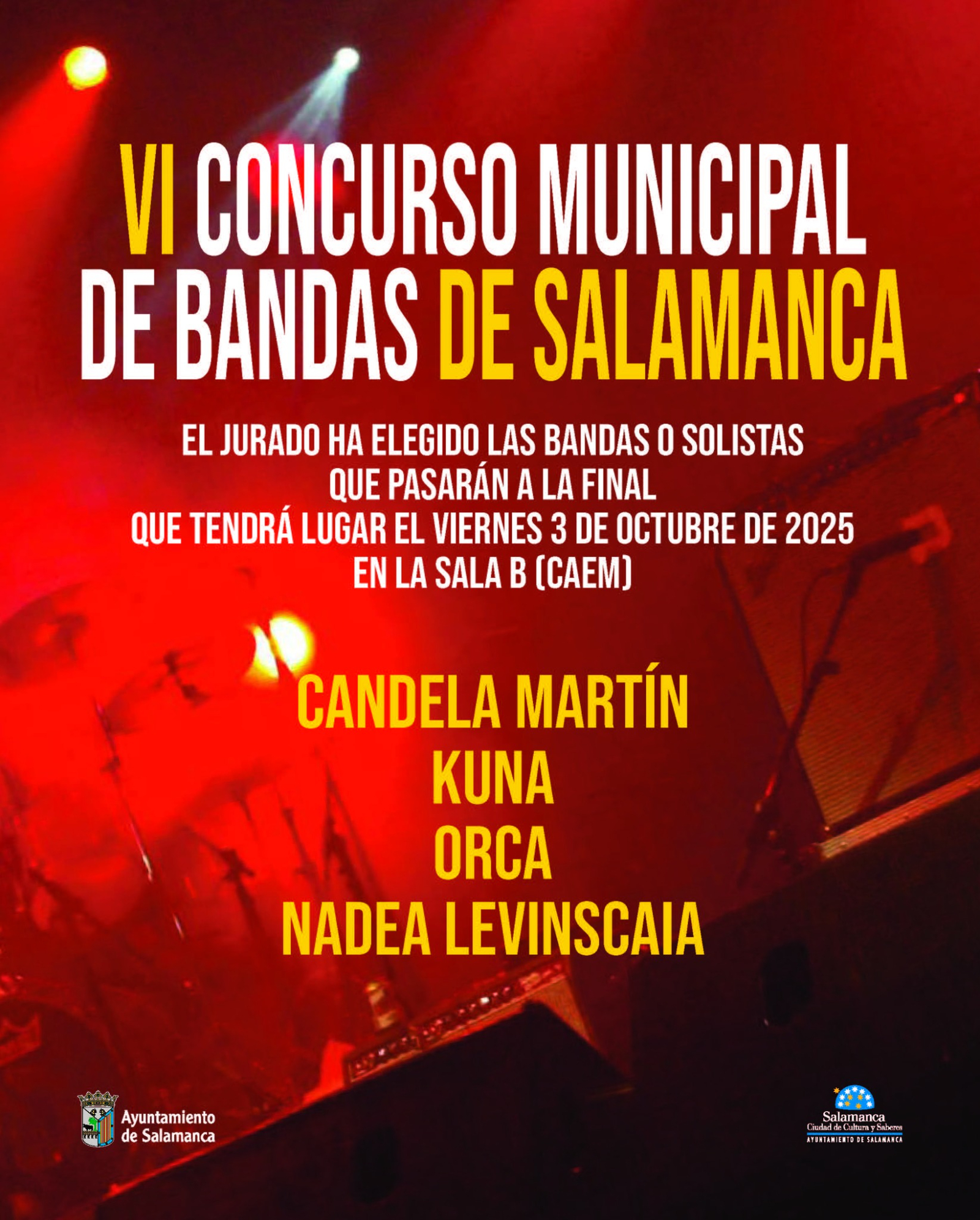 La Sala B acogerá la gran final del concurso de bandas organizado por el Ayuntamiento de Salamanca. Las bandas finalistas de esta edición son: Orca, Kuna, Candela Martín y Nadea Levinscaia.