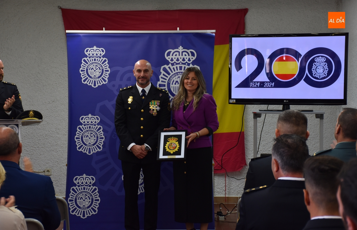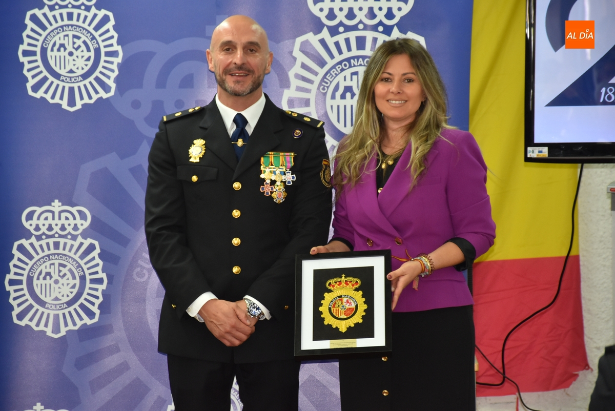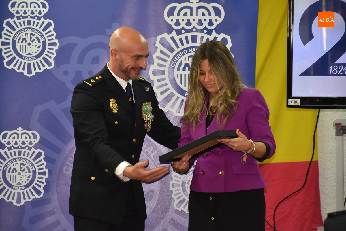 Por otro lado, se entregó una metopa al Ayuntamiento de Fuentes de Oñoro (fue recogida por Laura Vicente), con la que se refleja la colaboración que mantiene la Policía Nacional con el Ayuntamiento oñorense, al igual que hacen con otras instituciones como la Guardia Civil, la Policía Local de Ciudad Rodrigo o con los ciudadanos.