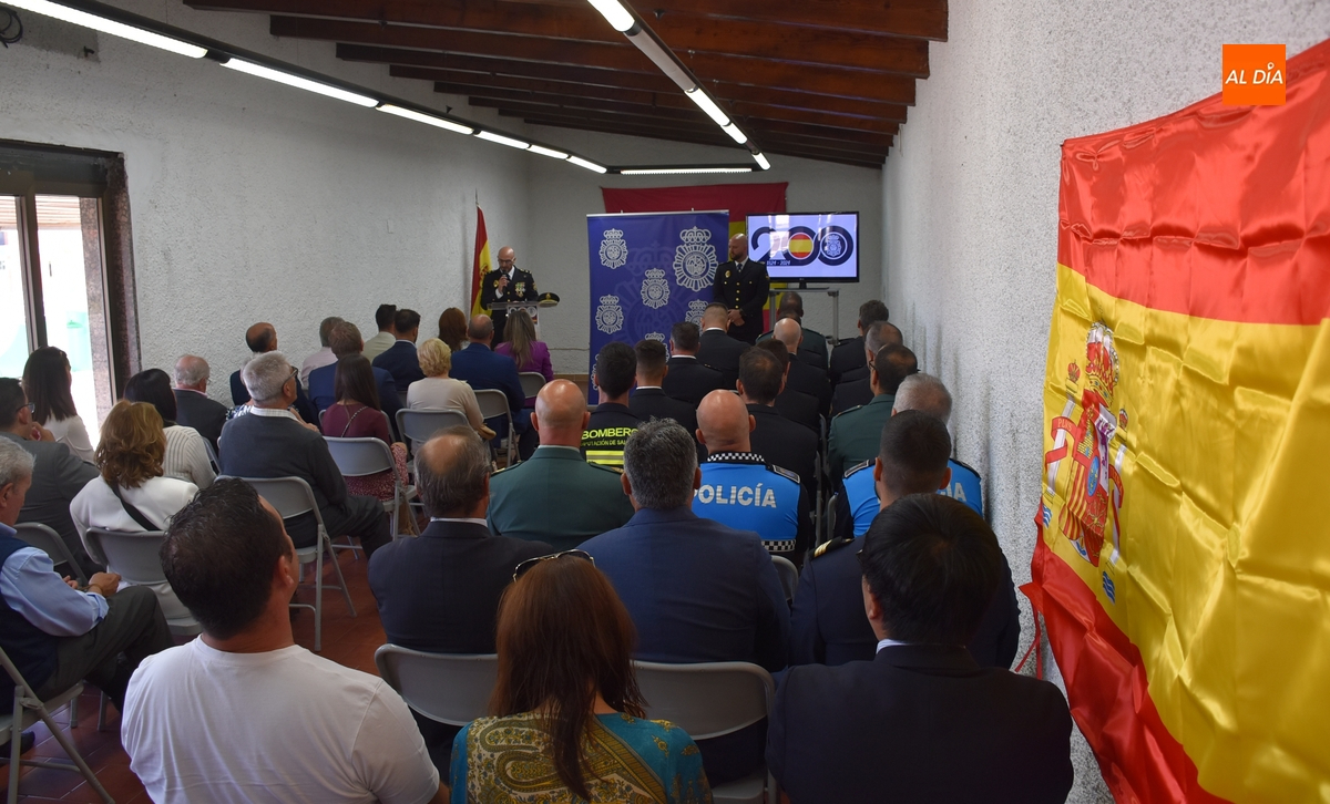 Tras varias fotos de familia en las escaleras del altar del templo, todos los presentes se desplazaron al local de un antiguo establecimiento hostelero de Fuentes de Oñoro para llevar a cabo el acto oficial conmemorativo de la jornada, que se abrió con la proyección de un vídeo sobre la Policía Nacional. Este acto tuvo tres partes principales.