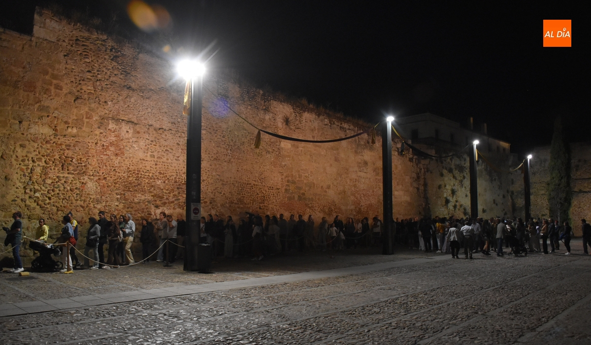 La hora fijada para el inicio de la representación era las 21.30 horas, pero justo una hora antes ya había una larguísima cola en el Registro (iba desde el Cuerpo de Guardia hasta la Puerta del Conde). Esa cola fue creciendo y creciendo durante la hora siguiente, lo que acabó provocando que el espectáculo comenzase con algo de retraso hasta que accedió a la zona todo el público, buena parte del cual tuvo que quedarse de pie (al estar las gradas ya llenas), en una velada en la que se levantó un molesto viento que acabó desapareciendo al final de la representación.