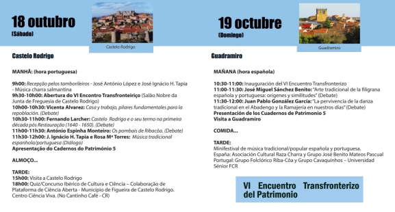 Respecto al encuentro transfronterizo compartido entre Castelo Rodrigo y Guadramiro, se iniciará el sábado 18 de octubre a las 10:00 horas (9:00 en hora portuguesa) en Castelo Rodrigo con la recepción a cargo de los tamborileros José Antonio López y José Ignacio H. Tapia, a la que seguirá media hora después la apertura formal del encuentro transfronterizo en el Salón Noble de la Junta de Freguesía de Castelo Rodrigo, tras lo cual, a las 11:00 en hora española se iniciarán las conferencias proyectadas a cargo de Vicenta Álvarez, Fernando Larcher y António Espinha, a cuya finalización habrá más música tradicional de ambos lados de la Raya y la presentación de los Cuadernos de Patrimonio del encuentro celebrado el año pasado en Almofala y Saldeana.
