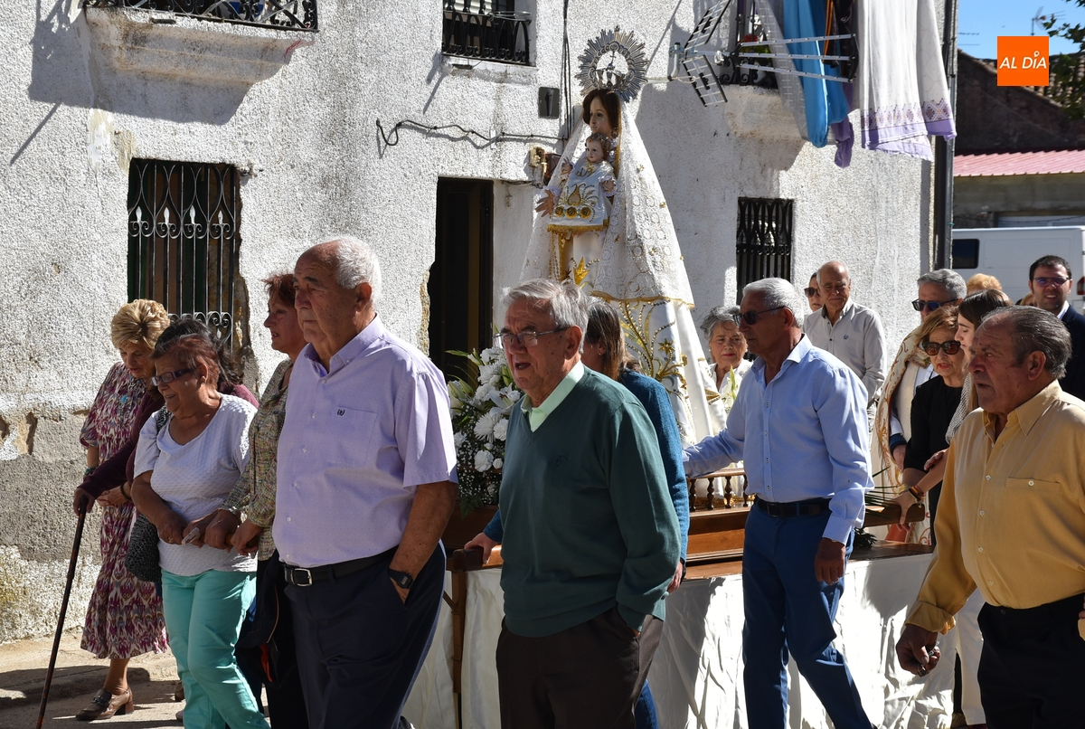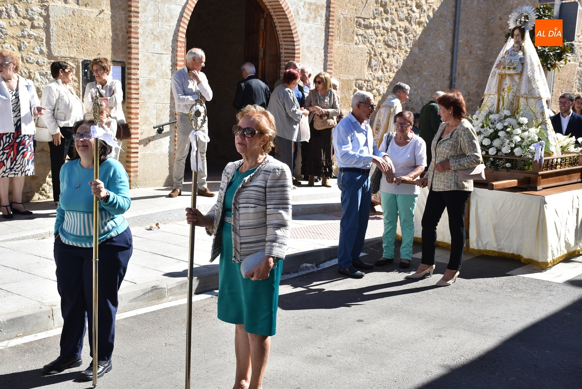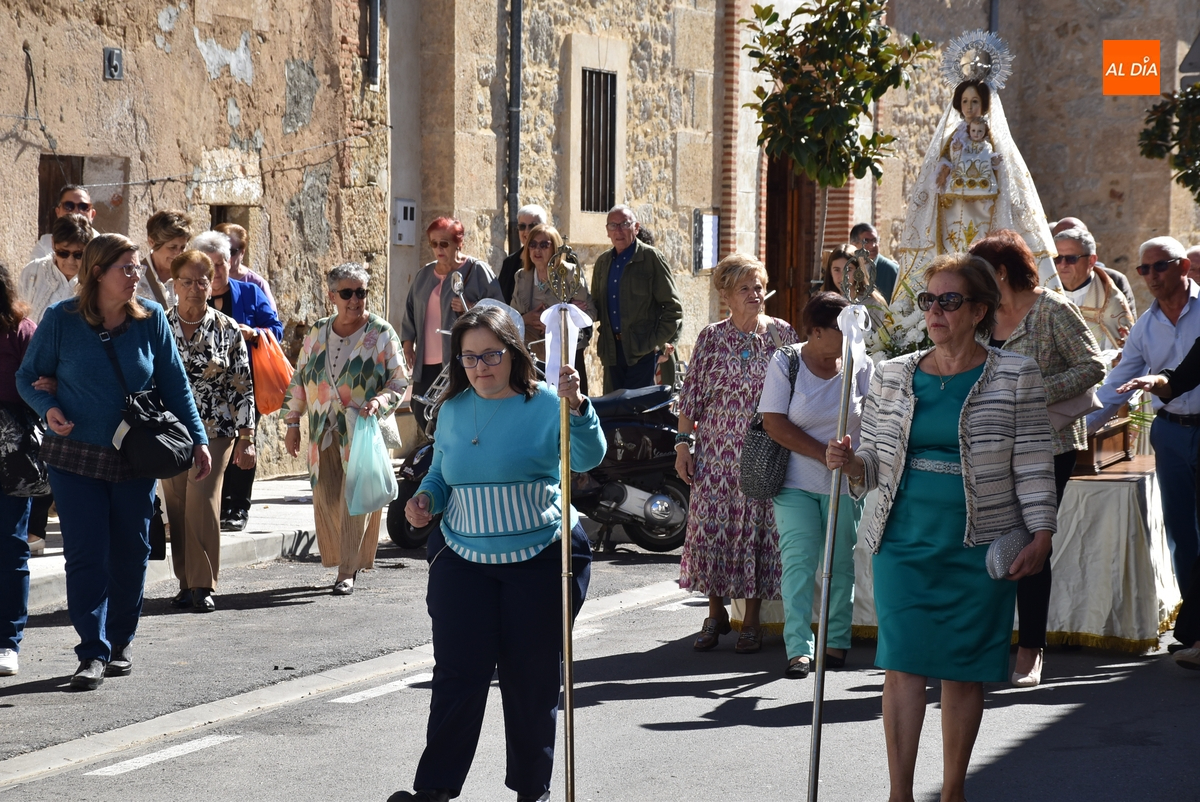 Como publicamos en la jornada sabatina, este año la Mayordomía ha sido ejercida por la Junta Directiva de la Cofradía de la Virgen, encargándose de portar las varas durante la procesión Auxi Benito y Manoli Román, que marcharon delante de la imagen. Tras la misma iba el párroco, los ediles Ramón Sastre, José Manuel Jerez, Rodrigo Toribio y Belén Barco, y el resto de fieles, que fueron interpretando cánticos.