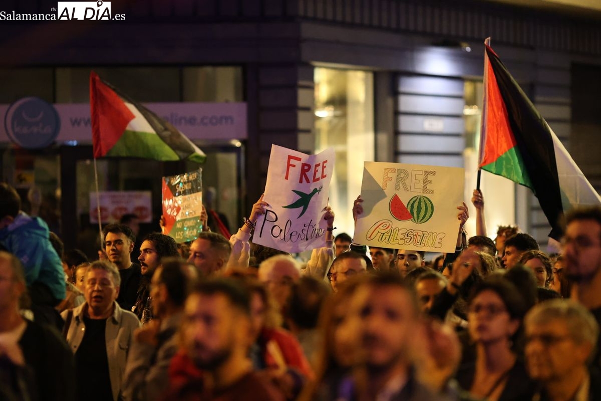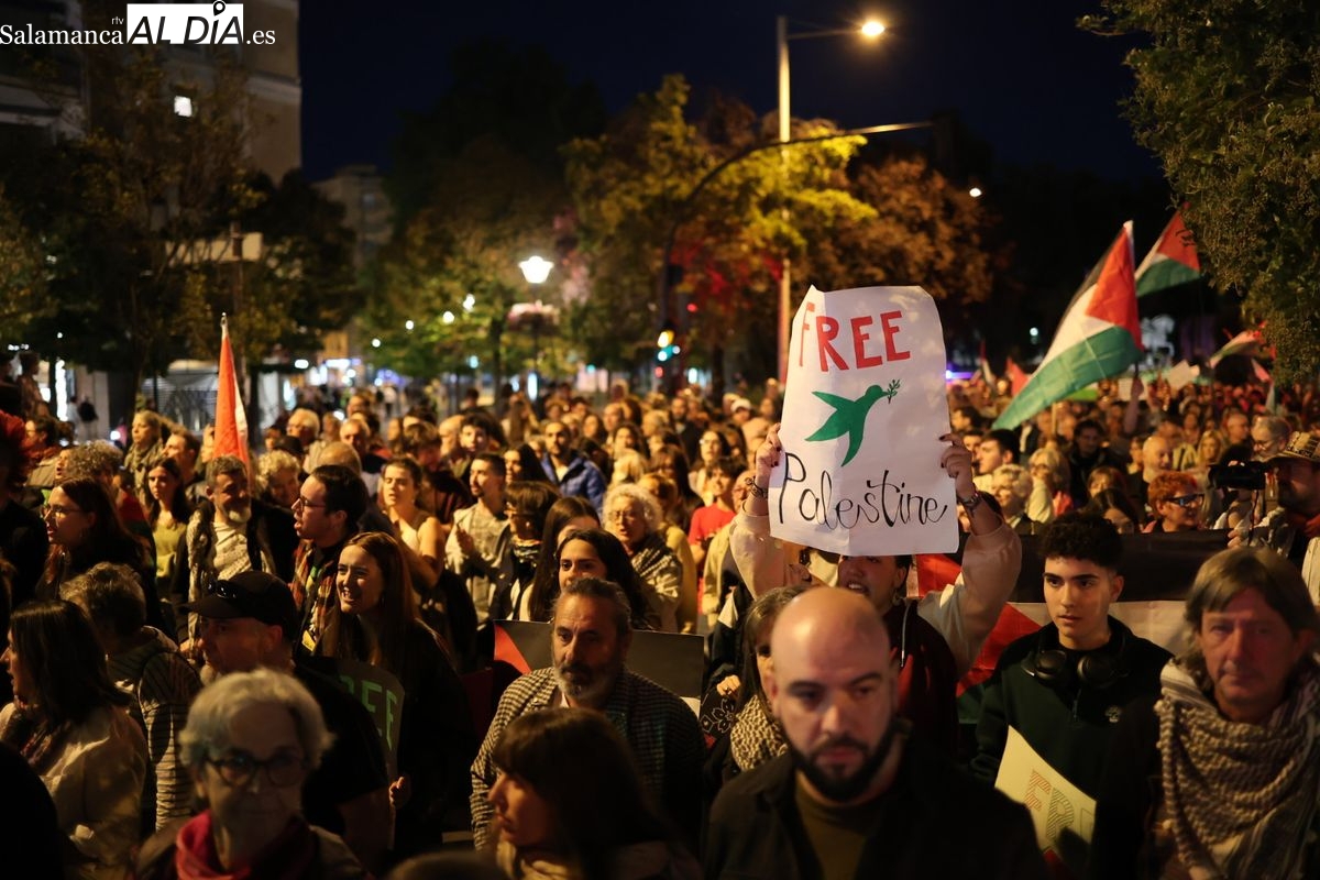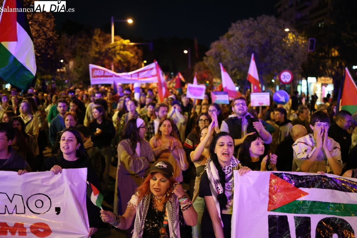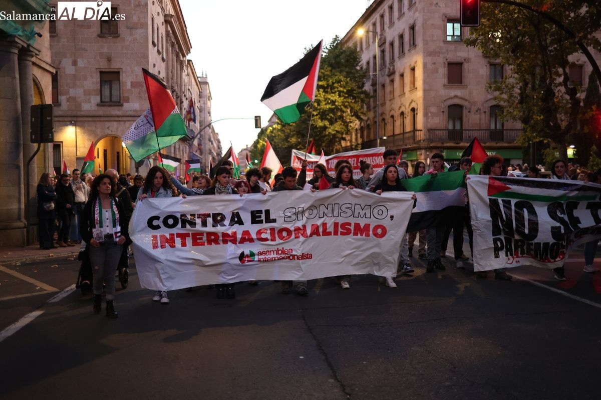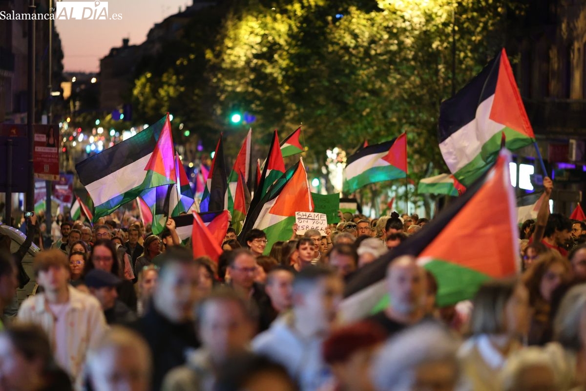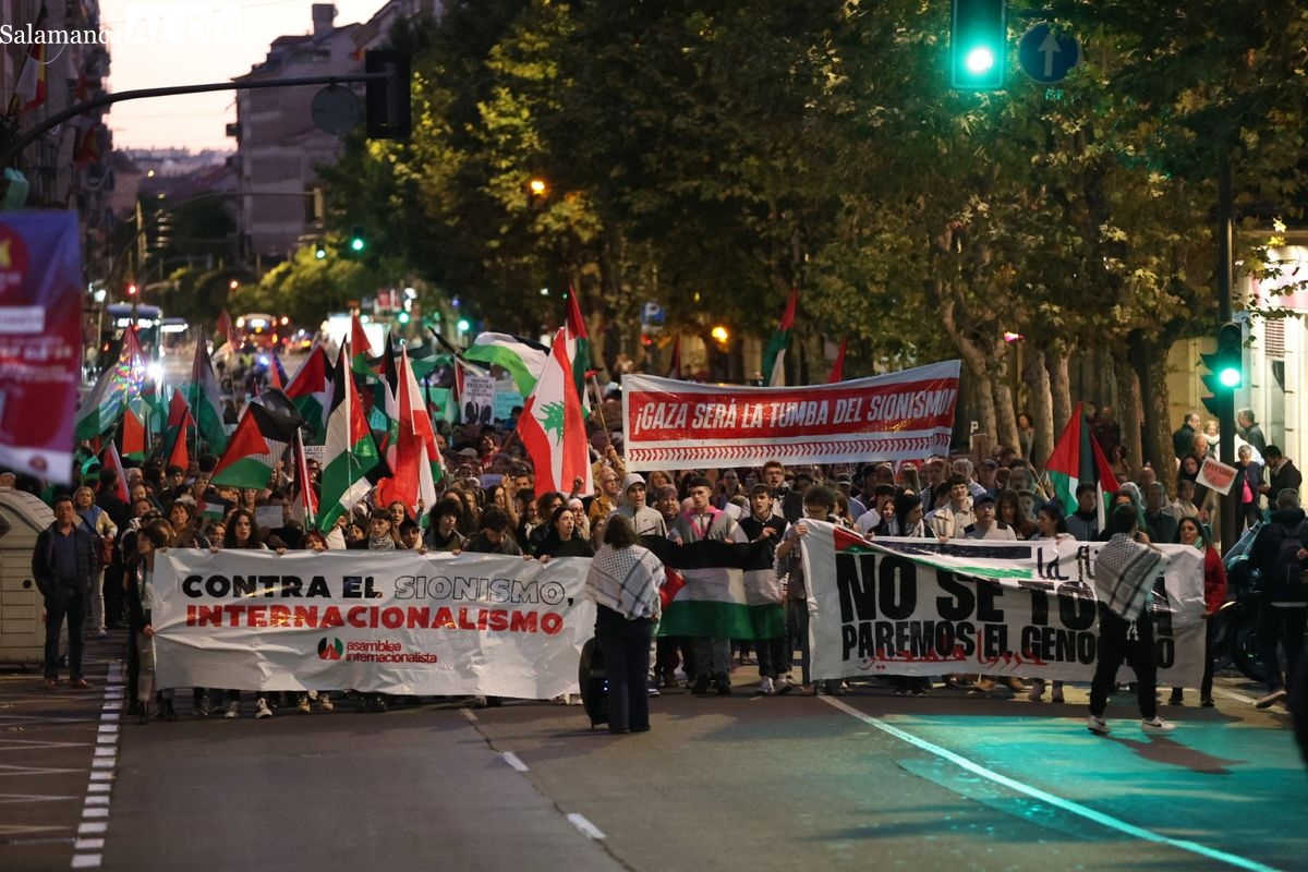 Las calles del centro de Salamanca han vuelto a ser el escenario de una contundente movilización en apoyo al pueblo palestino en la tarde de este domingo, 5 de octubre. La marcha, convocada por la Asamblea Internacionalista de Salamanca, ha destacado por su carácter masivo y diverso, congregando a familias, jóvenes y personas de todas las edades y condición. La afluencia ha ido aumentanto a lo largo del recorrido congregando a cientos de personas.