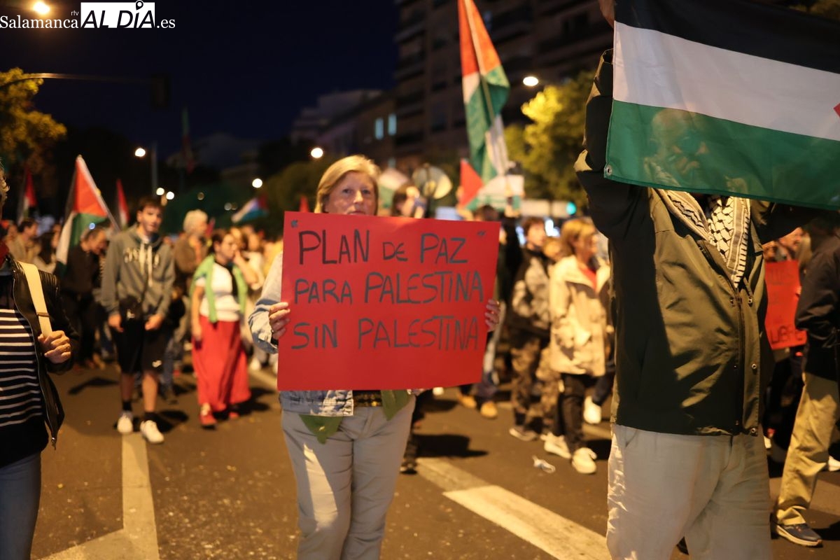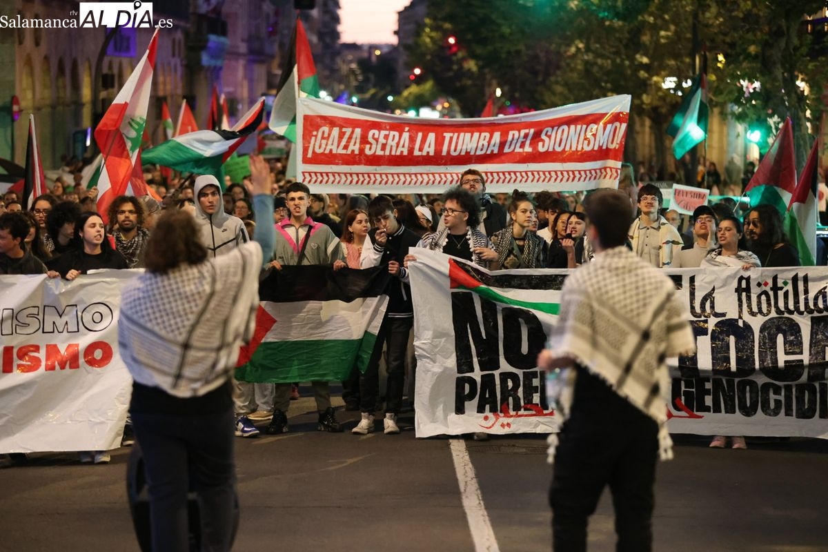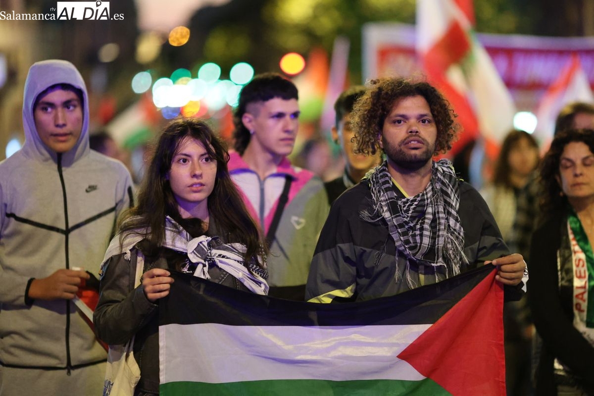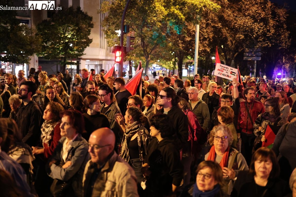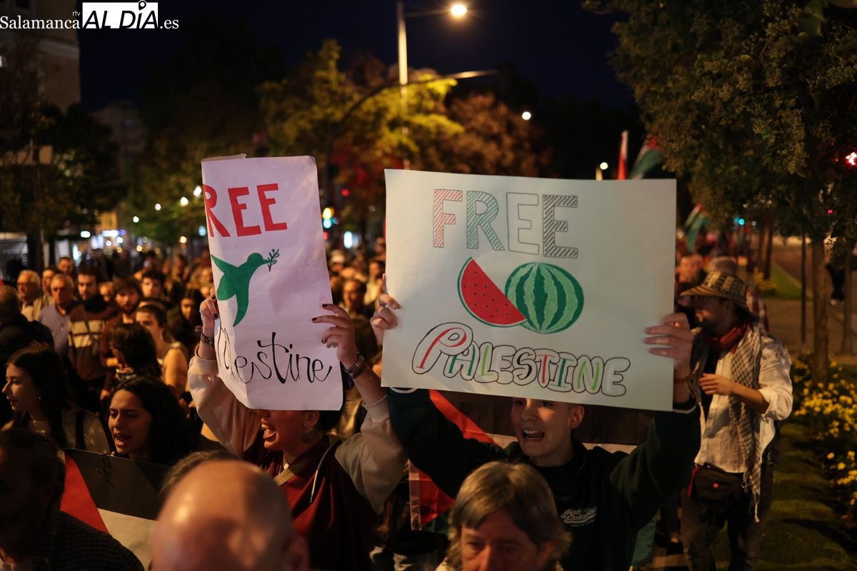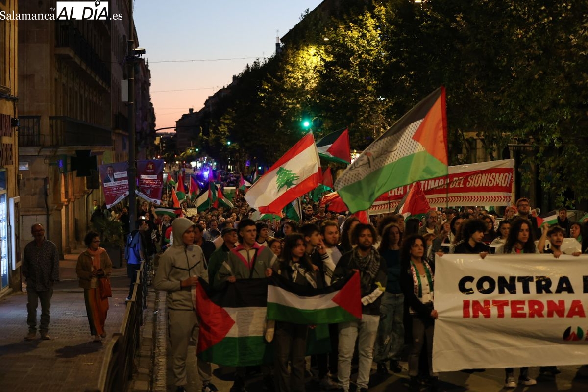 Las calles del centro de Salamanca han vuelto a ser el escenario de una contundente movilización en apoyo al pueblo palestino en la tarde de este domingo, 5 de octubre. La marcha, convocada por la Asamblea Internacionalista de Salamanca, ha destacado por su carácter masivo y diverso, congregando a familias, jóvenes y personas de todas las edades y condición. La afluencia ha ido aumentanto a lo largo del recorrido congregando a cientos de personas.