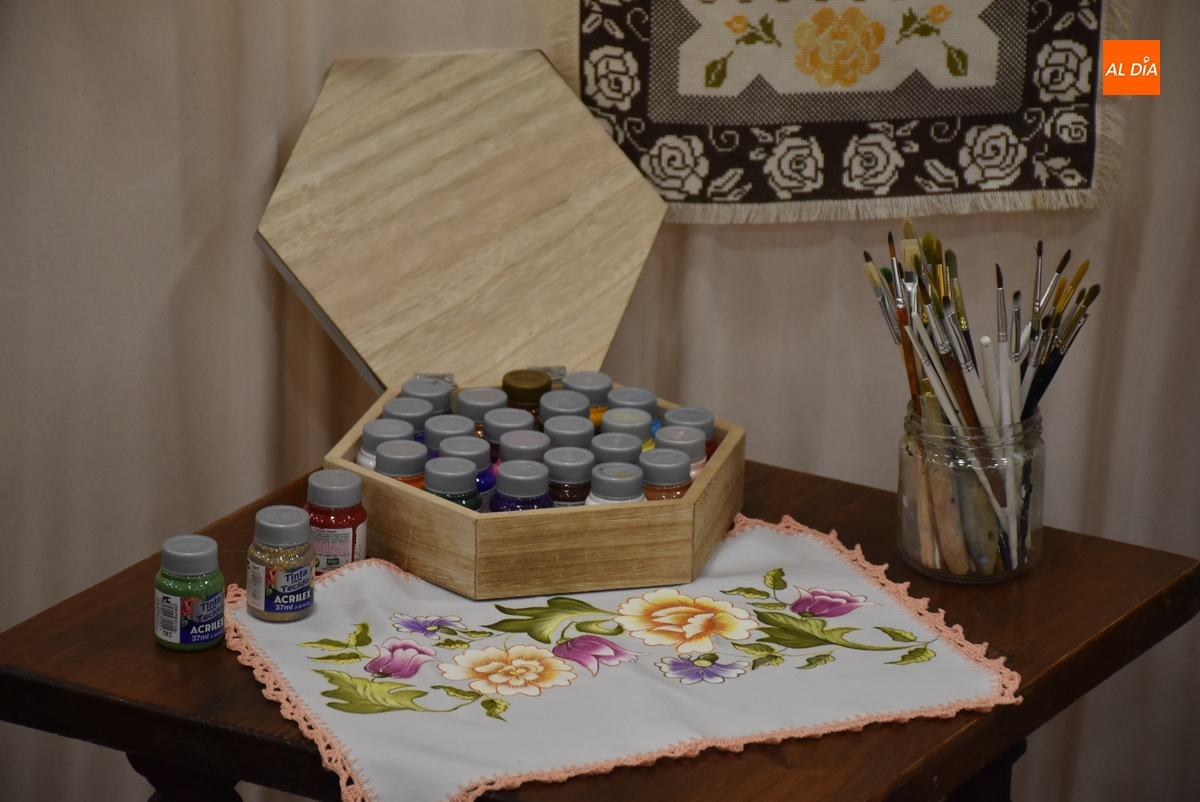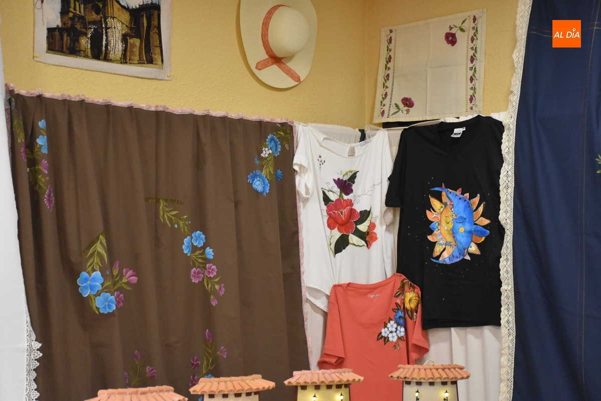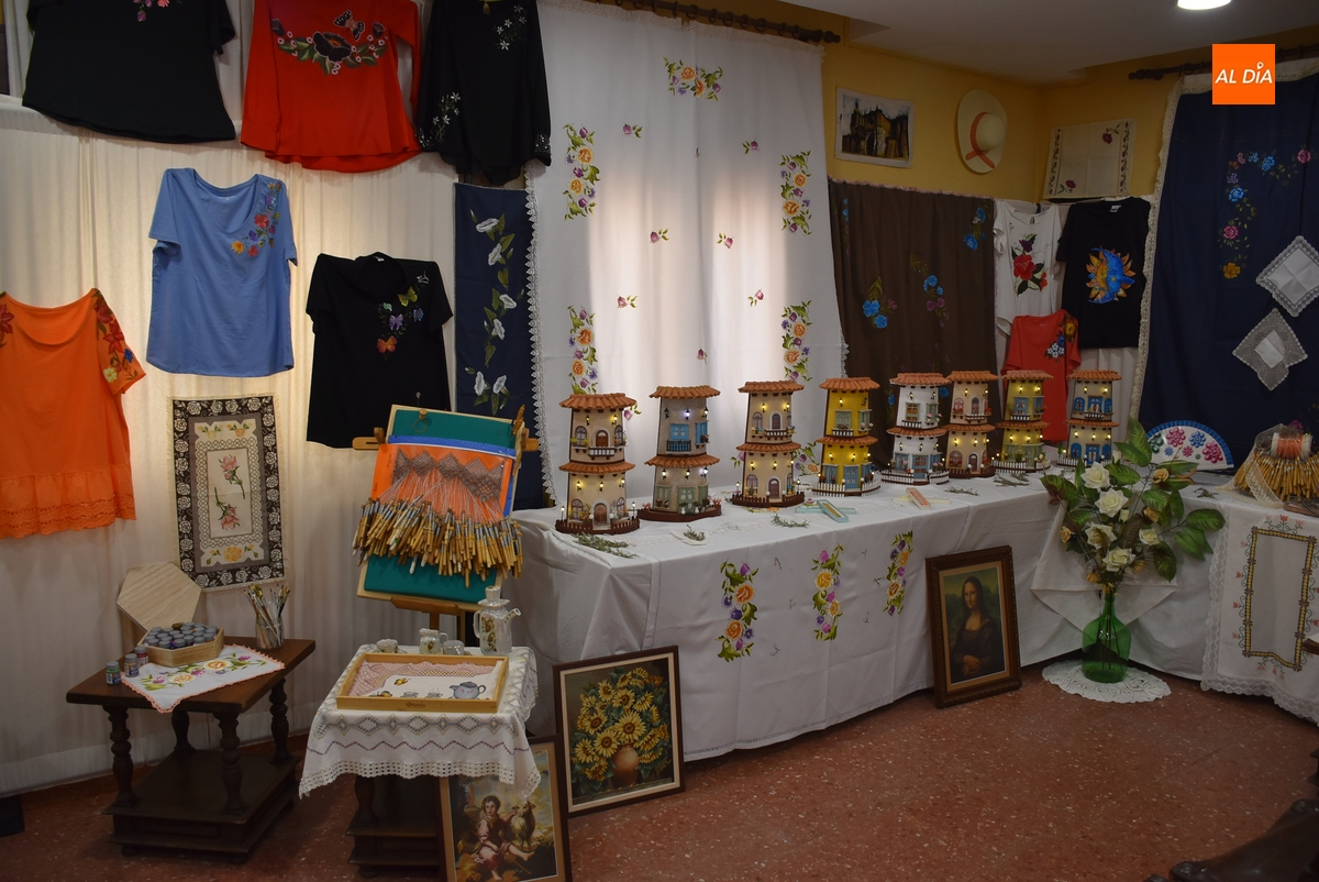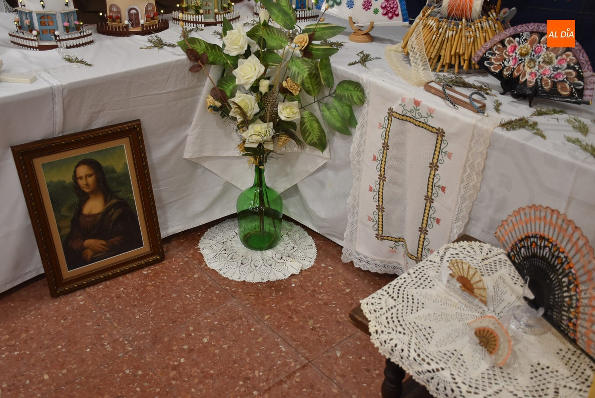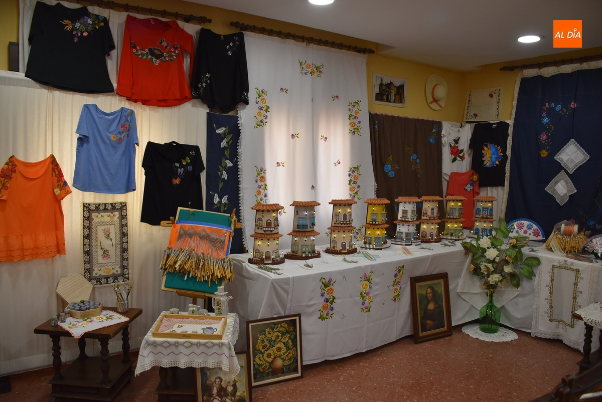 En concreto, en esta exposición se cuenta con trabajos de bolillos (como pañuelos, pulseras y abanicos, además de almohadillas con puntillas a medio hacer para que se vea cómo es esta disciplina), pintura en tela (figuran unas cuantas prendas colgadas en las que se han pintado motivos) y manualidades (contándose con tejas decoradas).