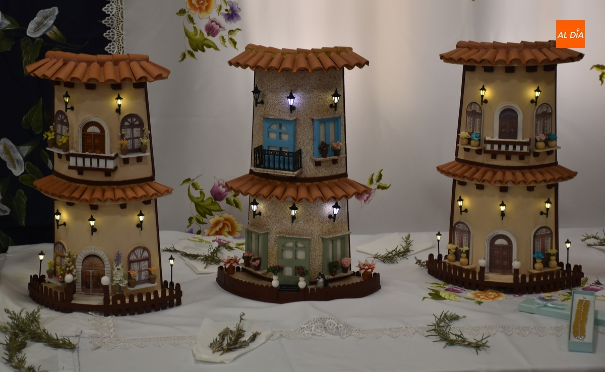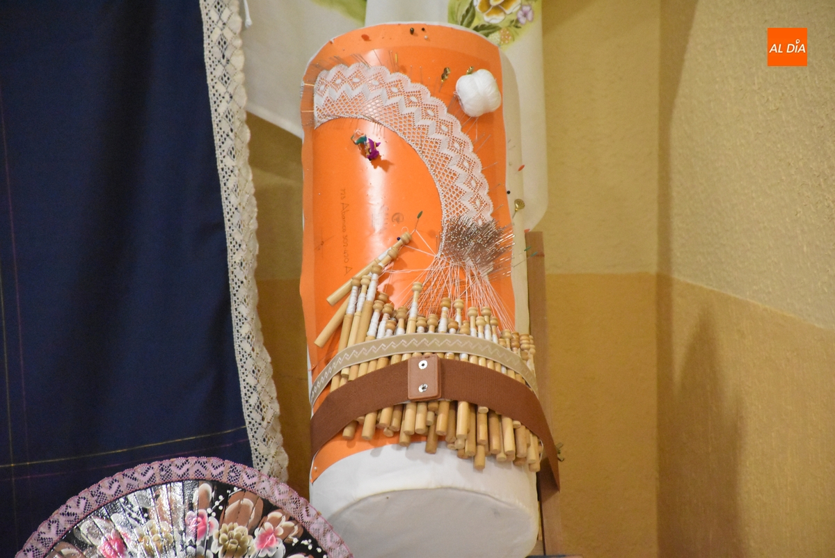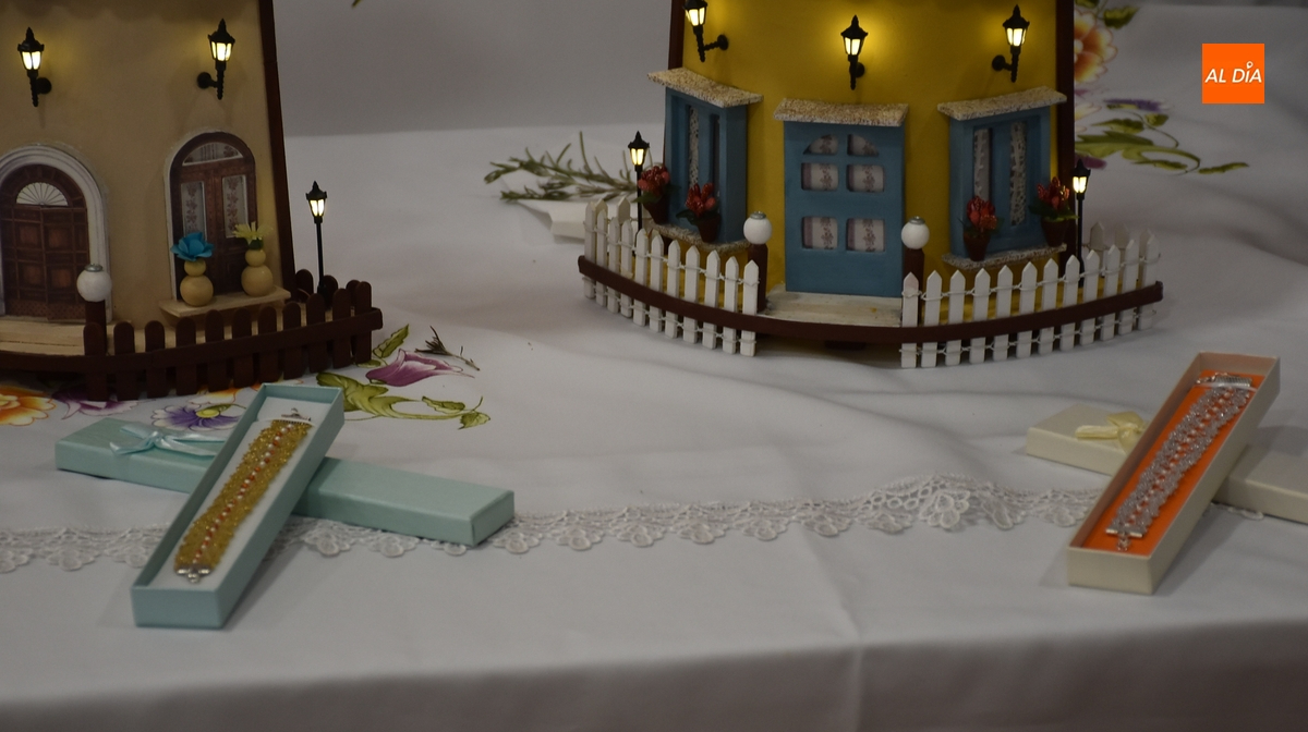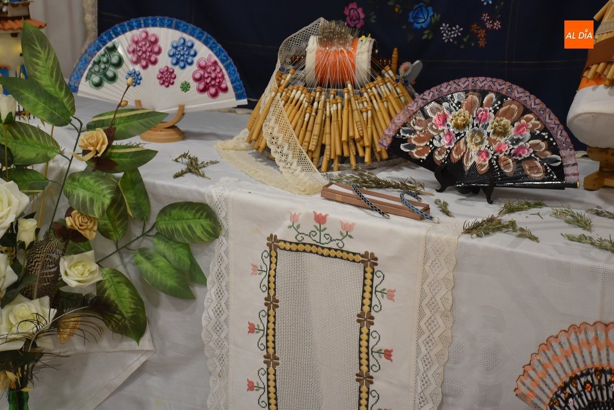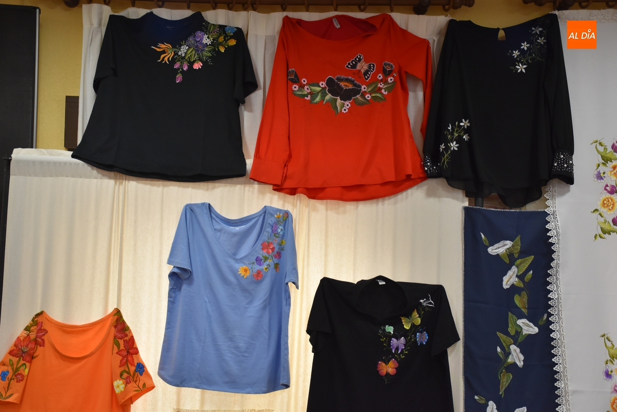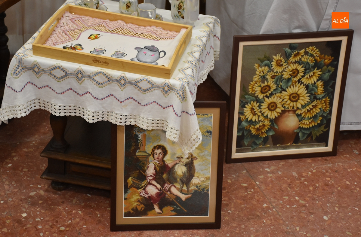 En concreto, en esta exposición se cuenta con trabajos de bolillos (como pañuelos, pulseras y abanicos, además de almohadillas con puntillas a medio hacer para que se vea cómo es esta disciplina), pintura en tela (figuran unas cuantas prendas colgadas en las que se han pintado motivos) y manualidades (contándose con tejas decoradas).