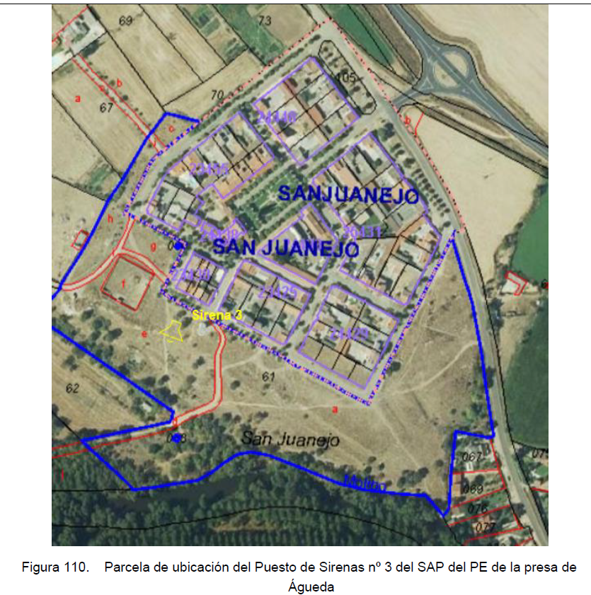 En lo que se refiere a las sirenas de aviso a la población aguas abajo, en el caso del pantano del Águeda se instalarán un total de 6, una dentro del término municipal de Zamarra y las otras 5 en el término municipal de Ciudad Rodrigo. La sirena de Zamarra se situará en un terreno de titularidad estatal (muy cerca del pantano), mientras que las 5 de Ciudad Rodrigo irán en terrenos del Ayuntamiento salvo una en un terreno de la Junta de Castilla y León. Como puntos concretos, una de las sirenas estará junto a Sanjuanejo y otra junto al Camping (los puntos están identificados en una de las imágenes como SIR AG0X).