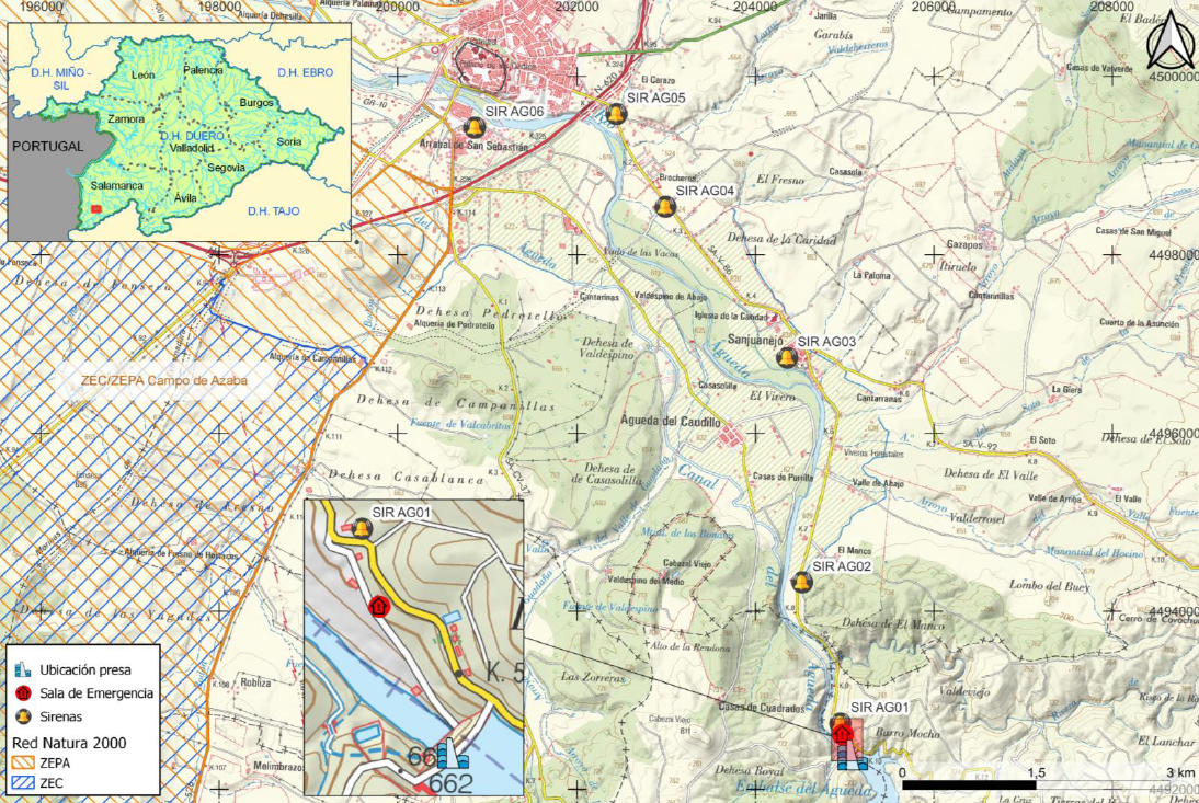 Por ejemplo, en lo que respecta al pantano del Águeda, no es necesaria ninguna nueva edificación donde habilitar la Sala de Emergencia, ubicándose en la actual Casa de la Administración. En este lugar se instalarán antenas, emisoras de radio, terminales, routers, y un largo etc. Como punto llamativo, se establece la instalación de un sistema (un repetidor de señal de telefonía móvil) para ampliar la cobertura de voz y datos en la zona del poblado y en el entorno exterior de cada presa.