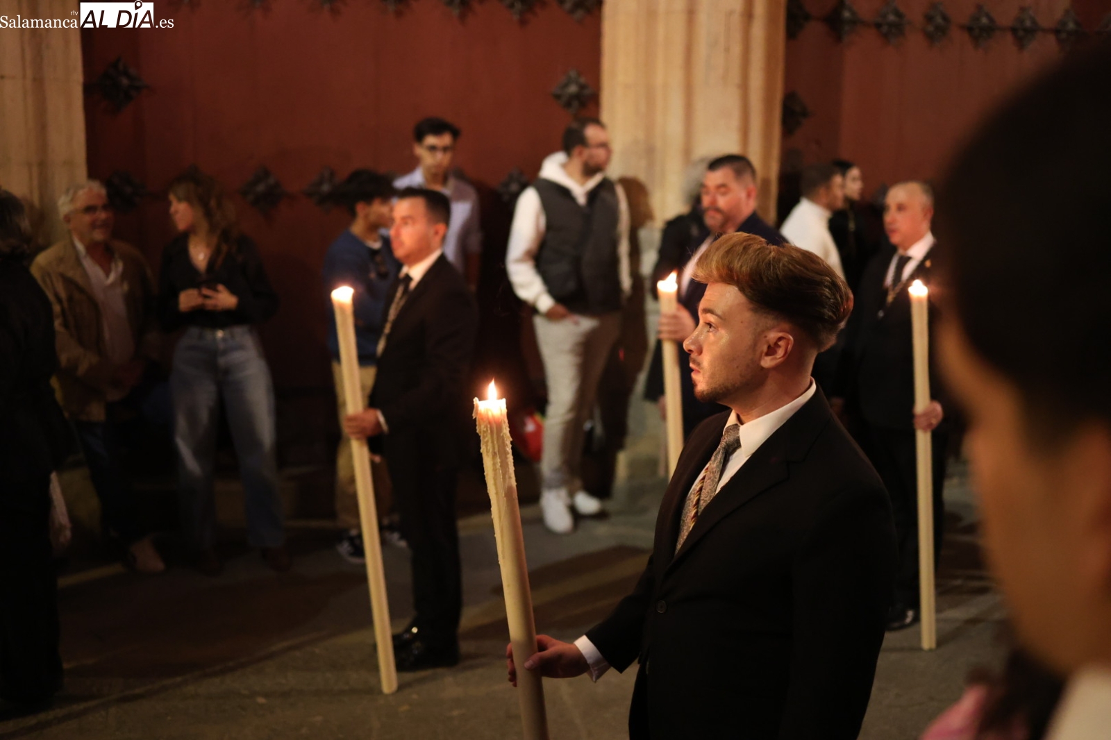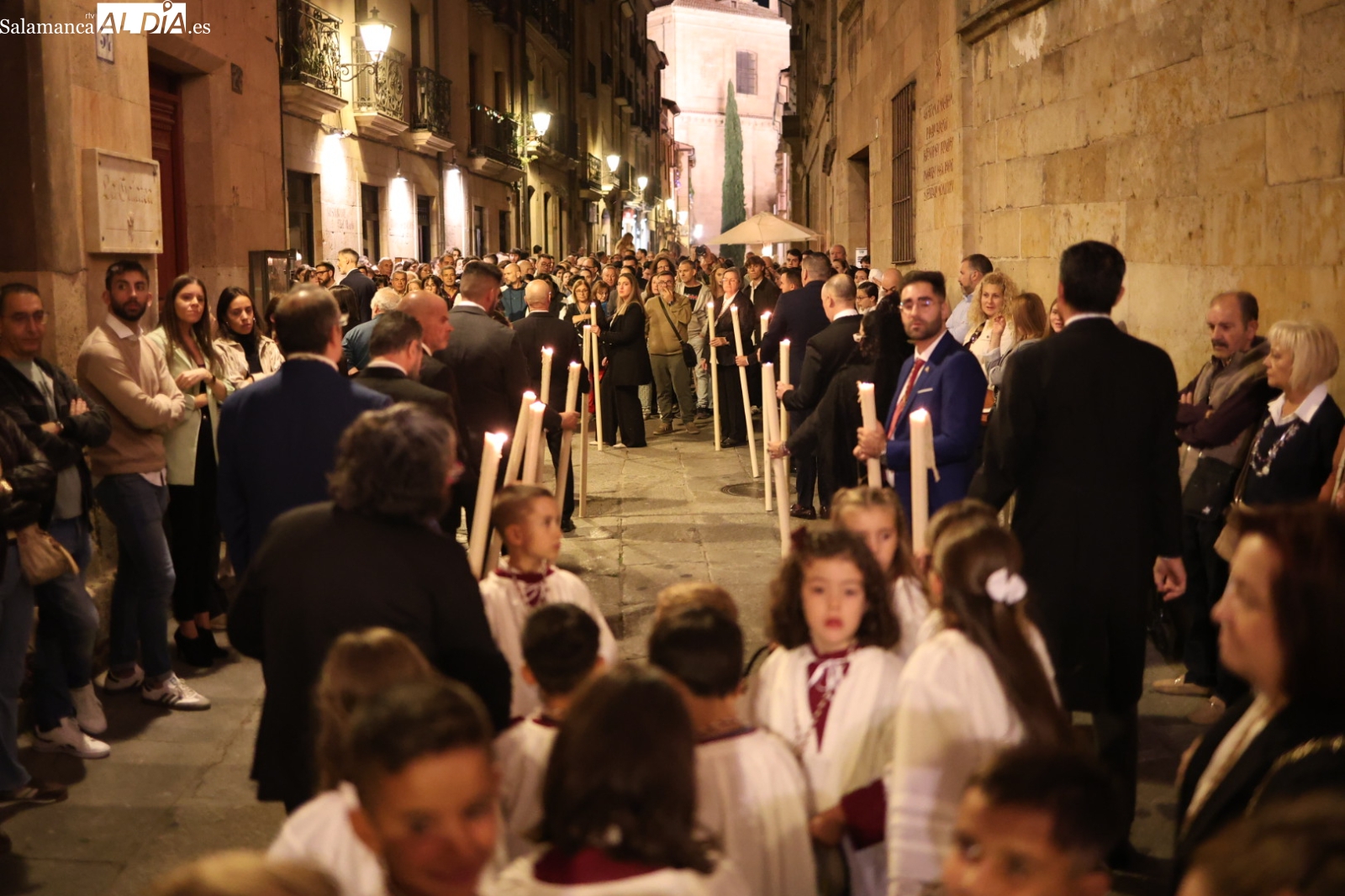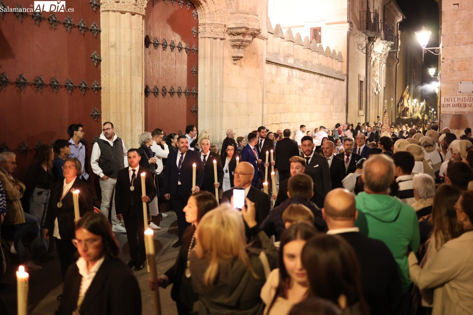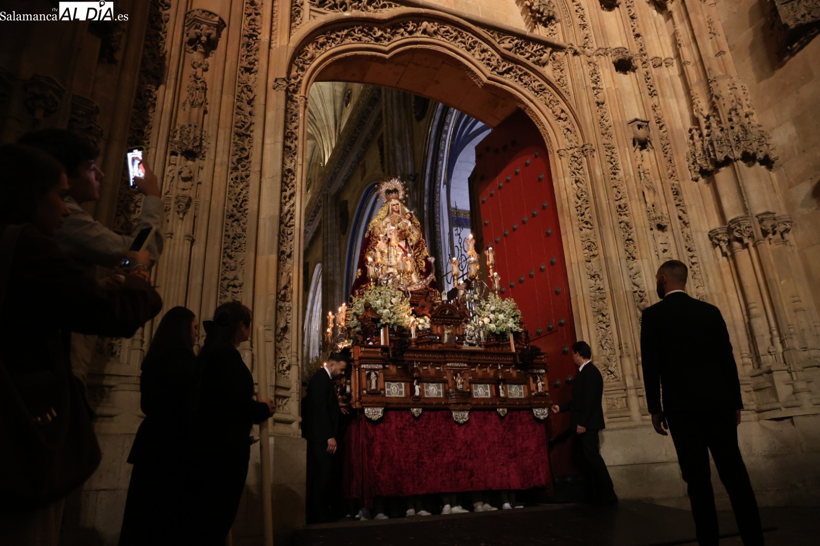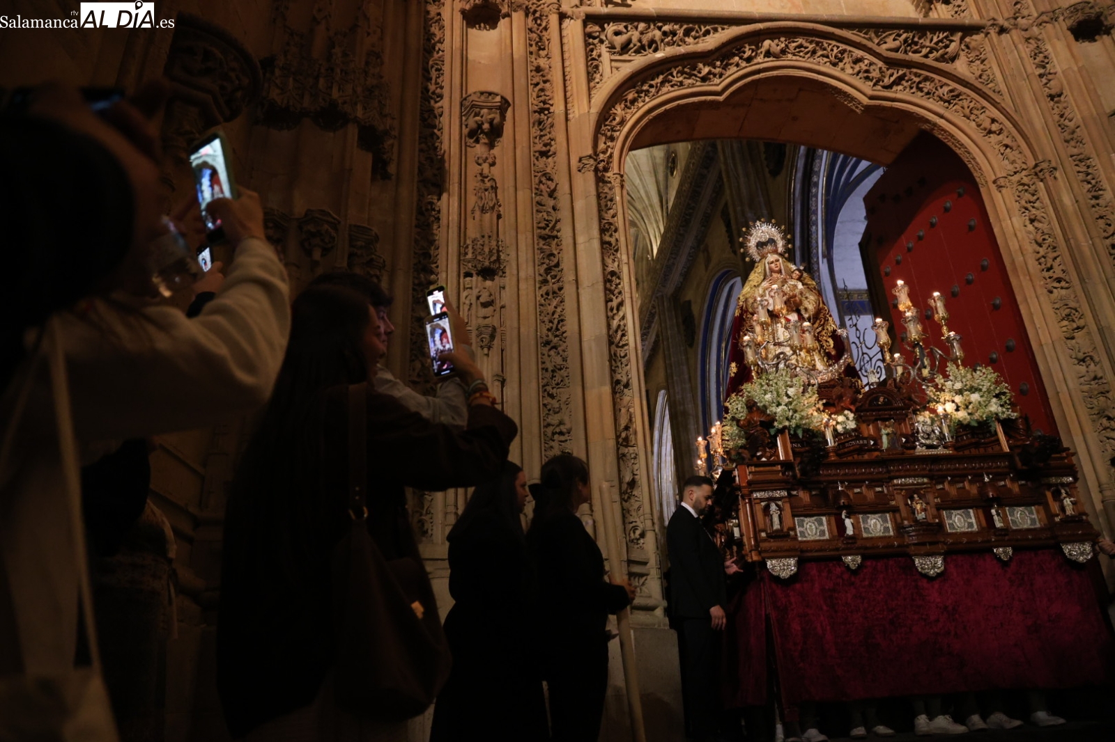Salamanca ha vuelto a demostrar su fervor religioso en la tarde de este sábado durante la solemne procesión de la Virgen del Rosario. El desfile, que congregó a una multitud de fieles y espectadores en el casco histórico, fue organizado por la Archicofradía del Rosario y partió puntualmente a las seis de la tarde desde el emblemático Convento de San Esteban (Dominicos), llenando de devoción el corazón de la ciudad. La salida fue un tanto accidentada ya que la corona de la imagen mariana golpeó contra el dintel del arco de la puerta de salida, quedando visiblemente torcida en su parte superior.