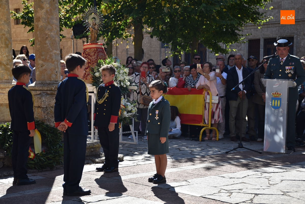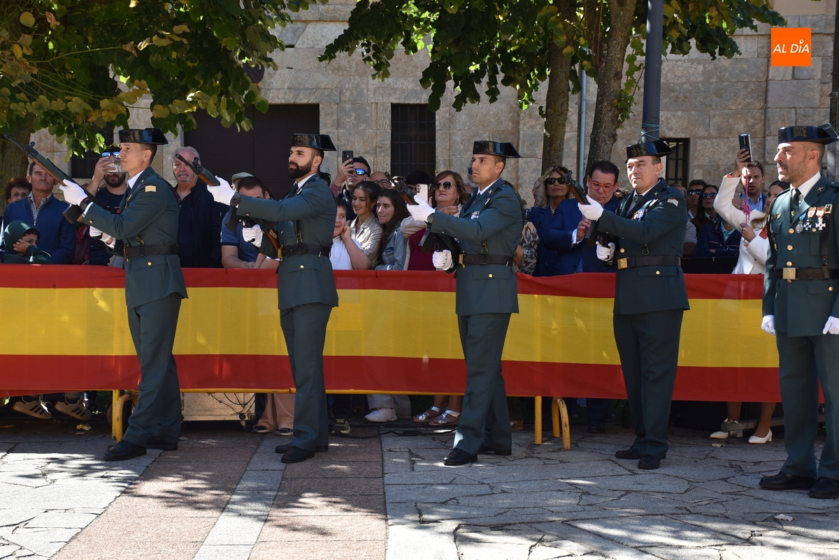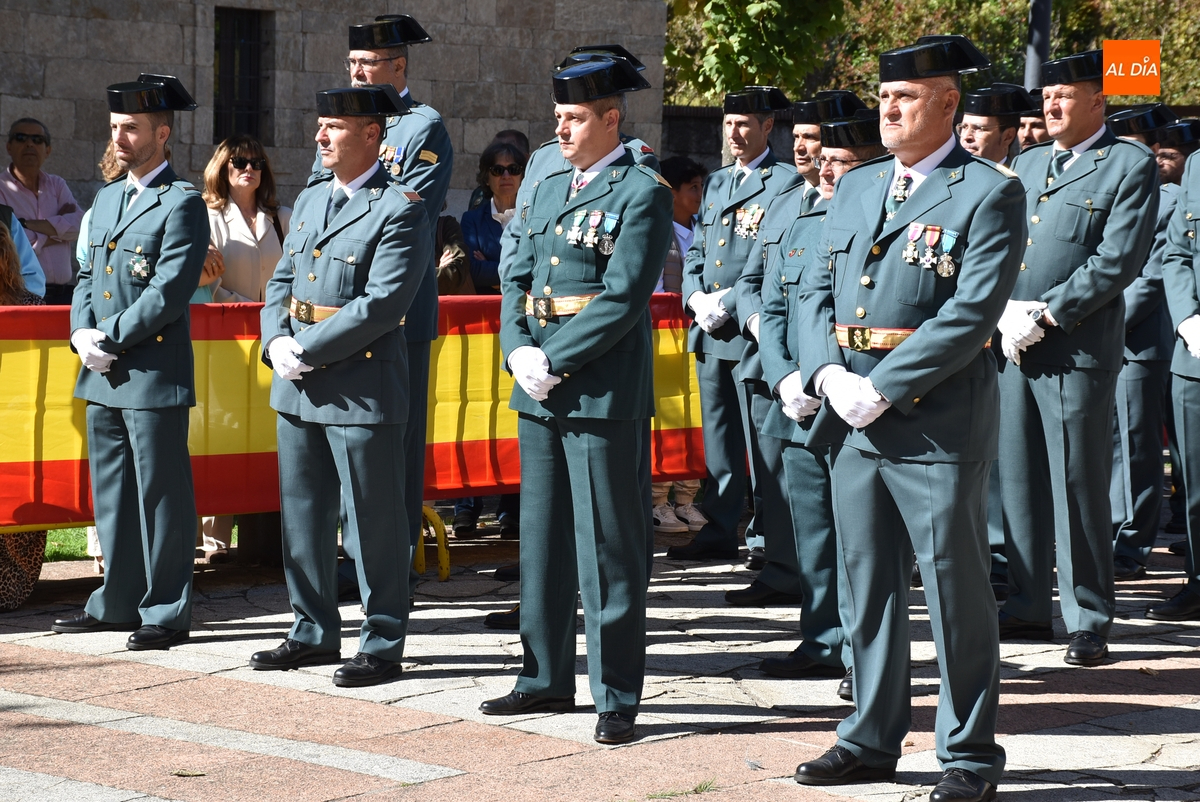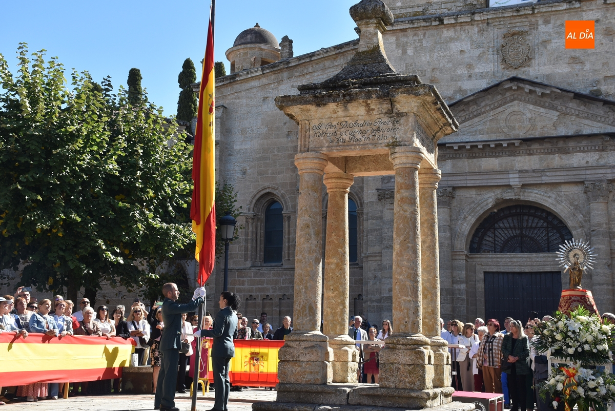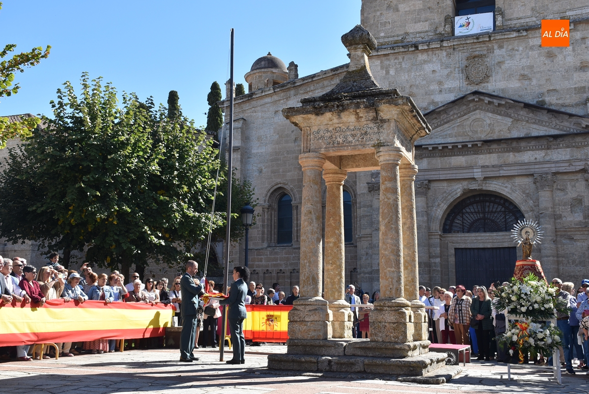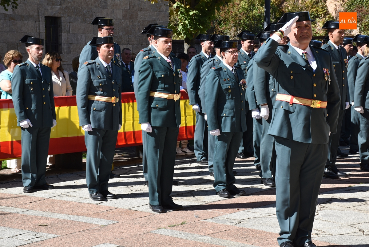 Finalizados los actos litúrgicos en honor a la Virgen del Pilar, la Plazuela de Herrasti fue también escenario en la mañana dominical de los actos institucionales de celebración por parte de la Compañía de Ciudad Rodrigo de la Guardia Civil de su patrona, aunque en el lateral opuesto del espacio, por donde se habían repartido vallas delimitadoras que lucían la bandera de España.