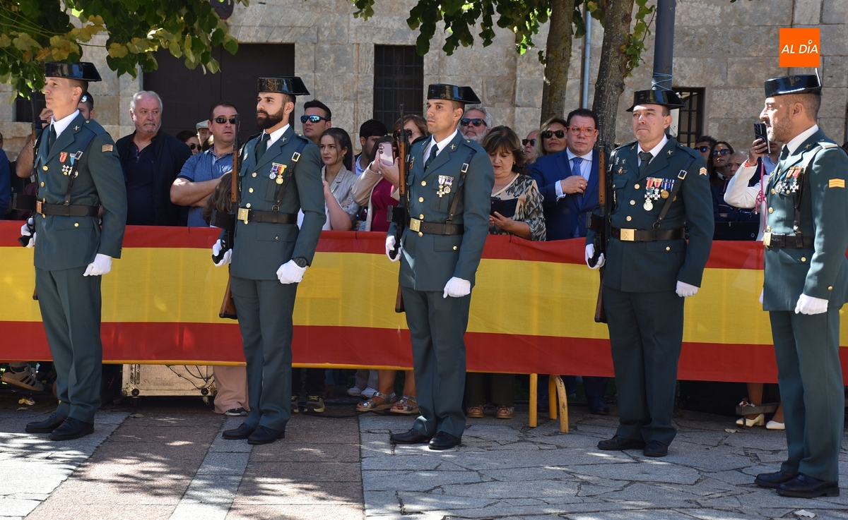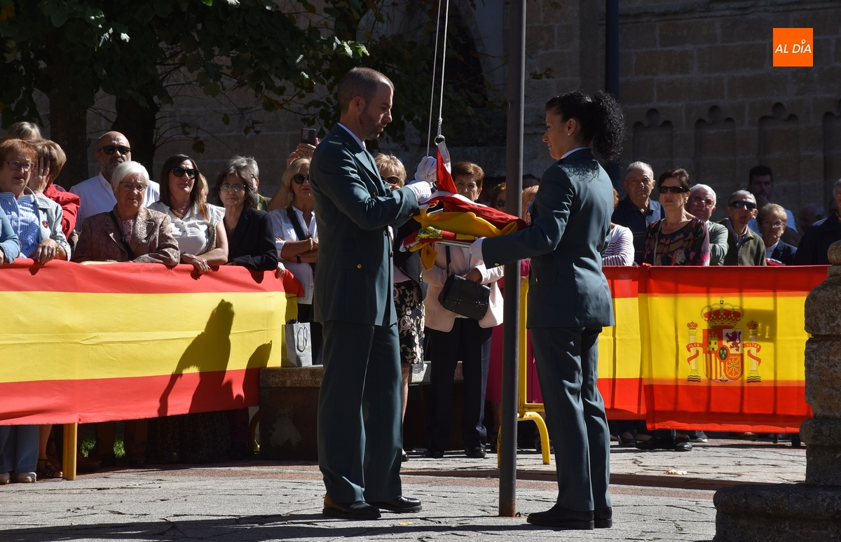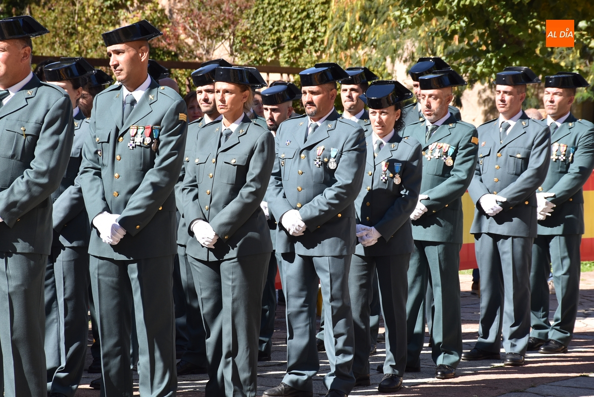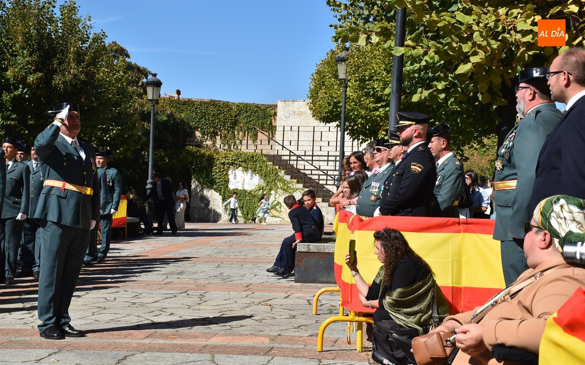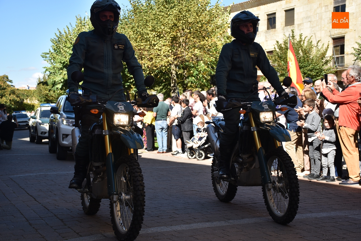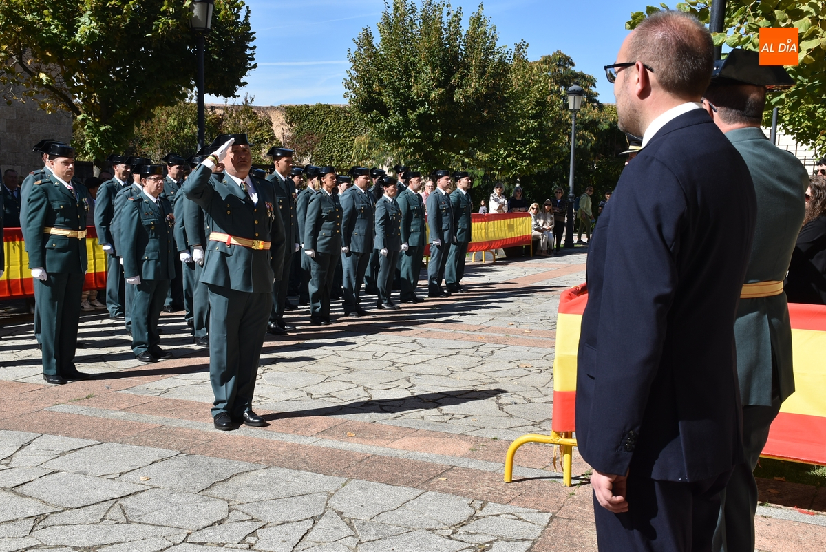 Finalizados los actos litúrgicos en honor a la Virgen del Pilar, la Plazuela de Herrasti fue también escenario en la mañana dominical de los actos institucionales de celebración por parte de la Compañía de Ciudad Rodrigo de la Guardia Civil de su patrona, aunque en el lateral opuesto del espacio, por donde se habían repartido vallas delimitadoras que lucían la bandera de España.