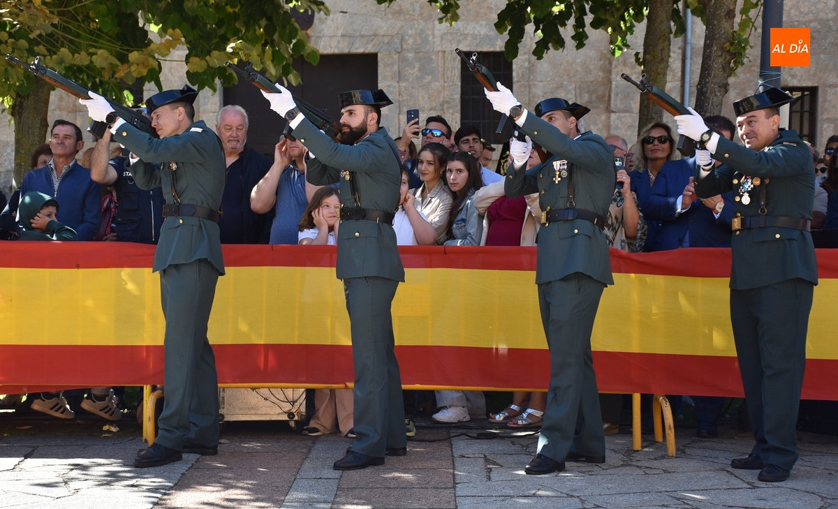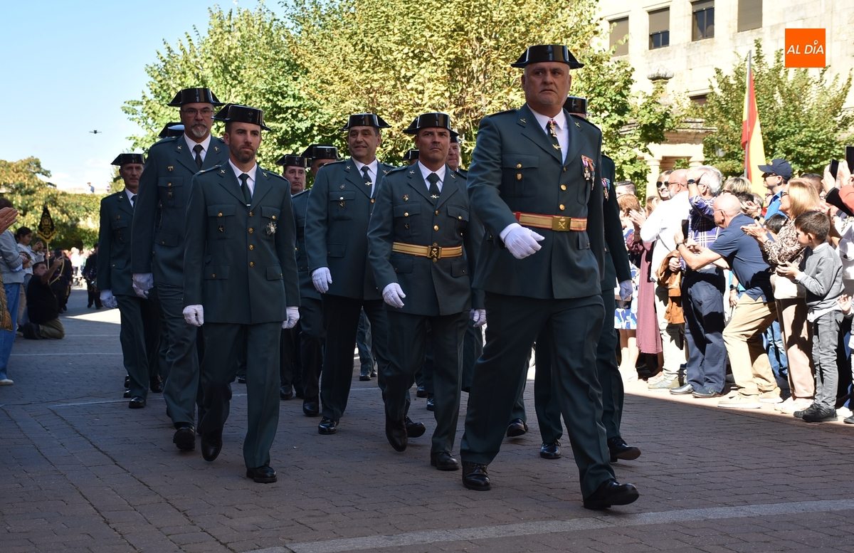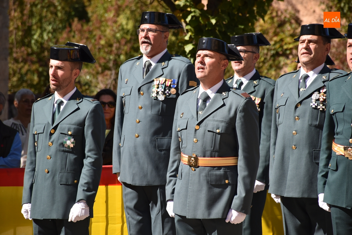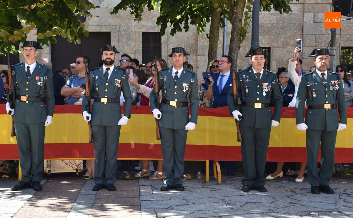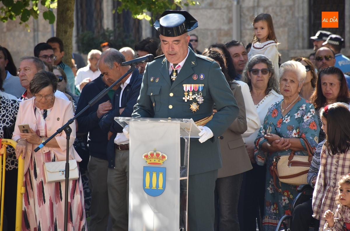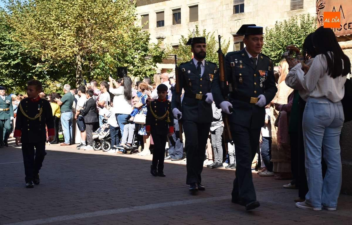 Finalizados los actos litúrgicos en honor a la Virgen del Pilar, la Plazuela de Herrasti fue también escenario en la mañana dominical de los actos institucionales de celebración por parte de la Compañía de Ciudad Rodrigo de la Guardia Civil de su patrona, aunque en el lateral opuesto del espacio, por donde se habían repartido vallas delimitadoras que lucían la bandera de España.