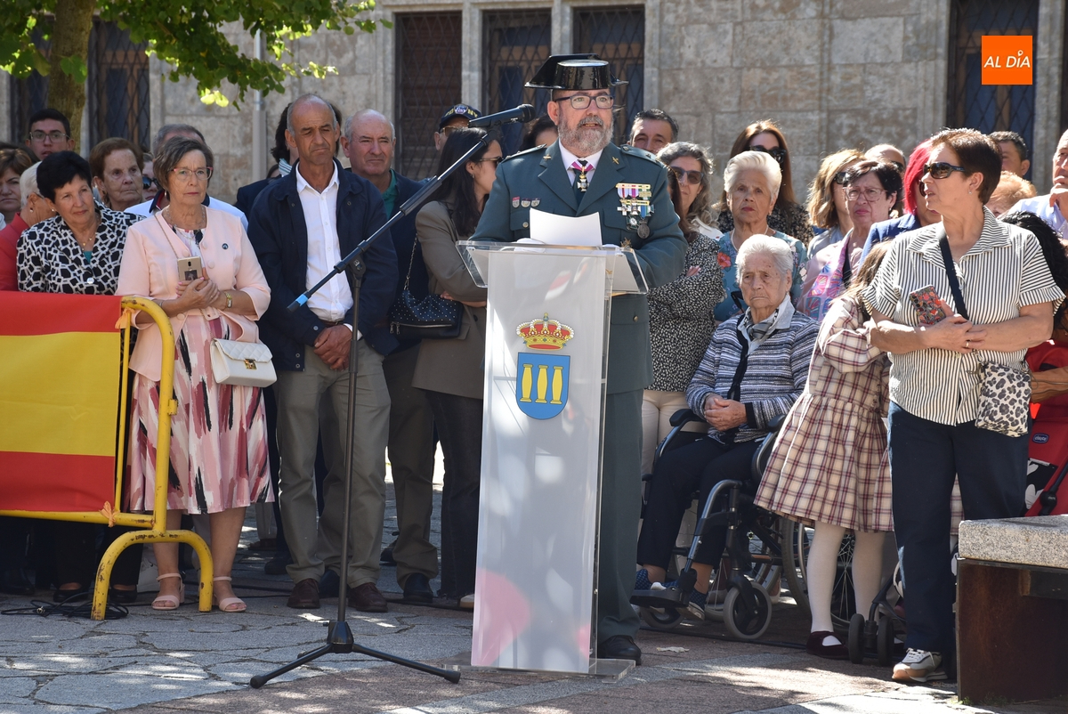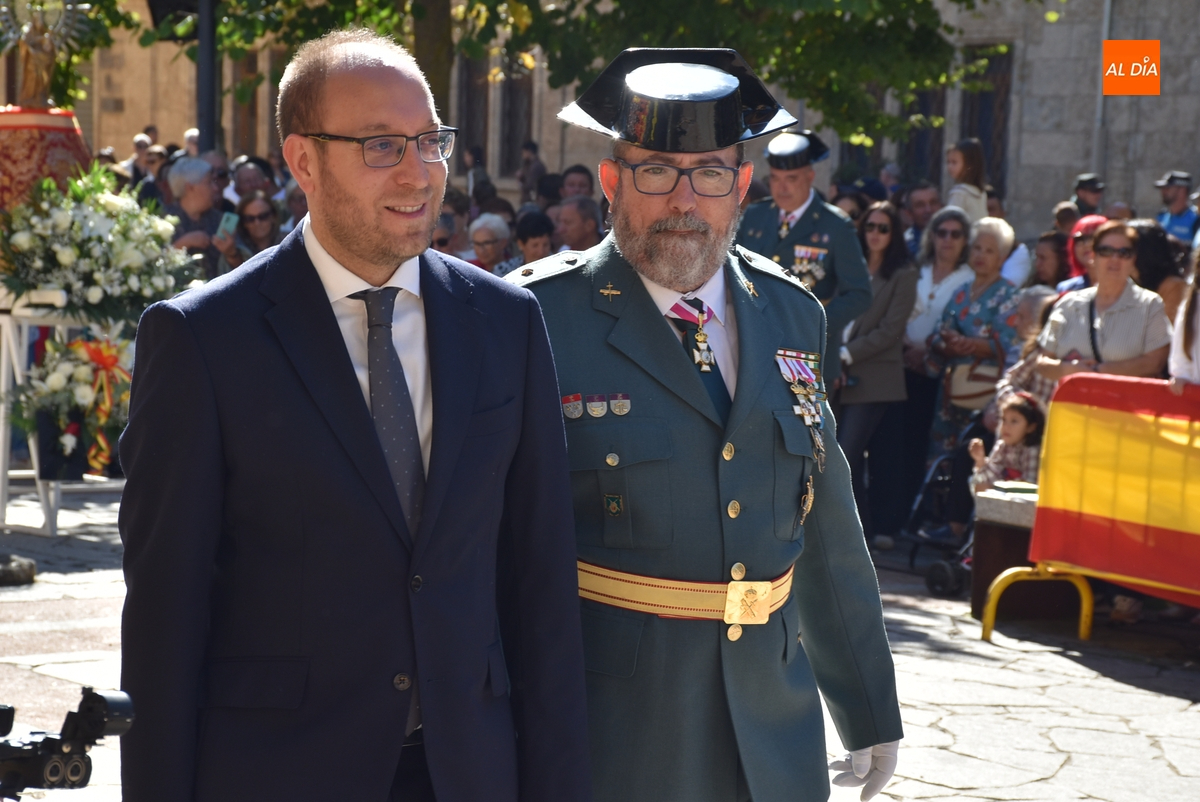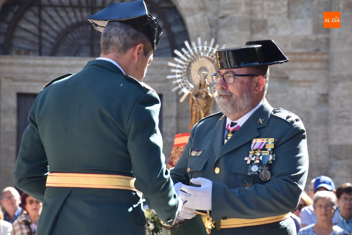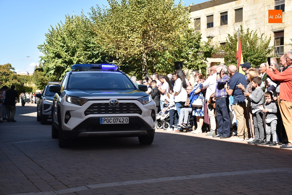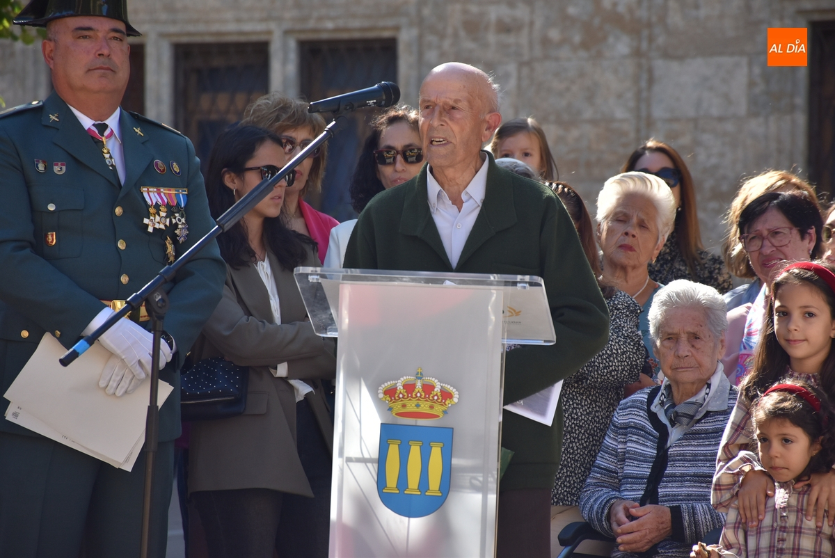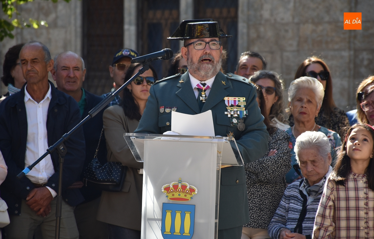Finalizados los actos litúrgicos en honor a la Virgen del Pilar, la Plazuela de Herrasti fue también escenario en la mañana dominical de los actos institucionales de celebración por parte de la Compañía de Ciudad Rodrigo de la Guardia Civil de su patrona, aunque en el lateral opuesto del espacio, por donde se habían repartido vallas delimitadoras que lucían la bandera de España.