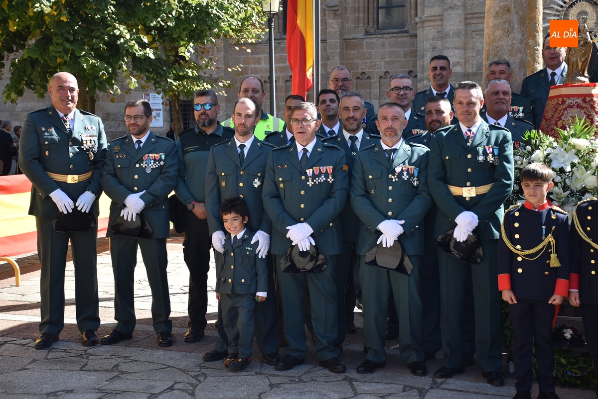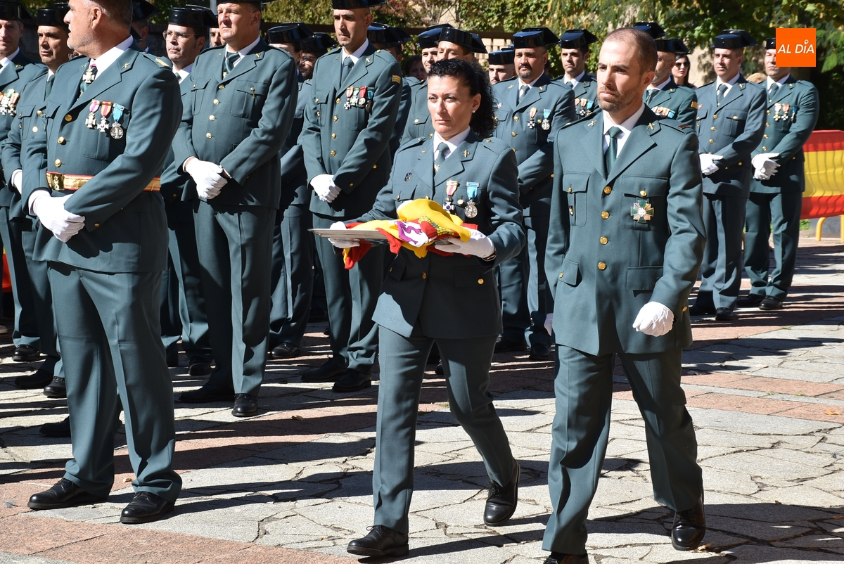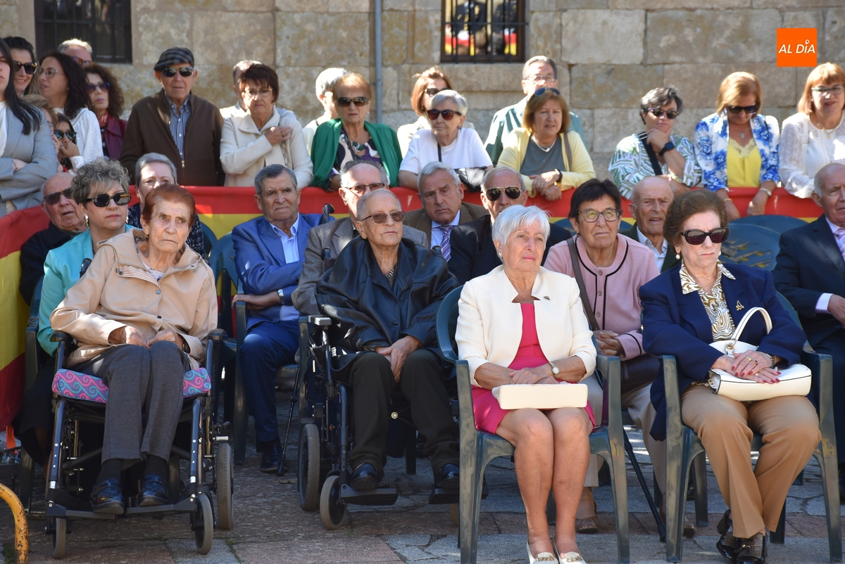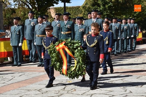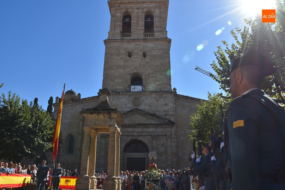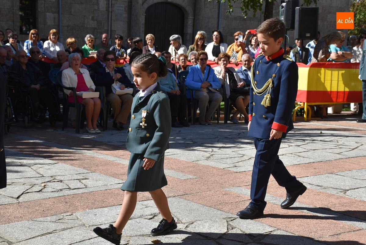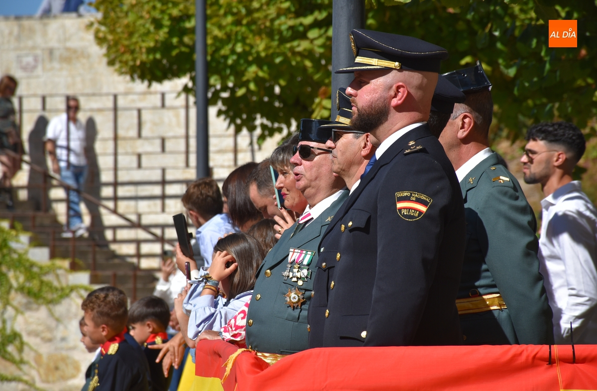 Finalizados los actos litúrgicos en honor a la Virgen del Pilar, la Plazuela de Herrasti fue también escenario en la mañana dominical de los actos institucionales de celebración por parte de la Compañía de Ciudad Rodrigo de la Guardia Civil de su patrona, aunque en el lateral opuesto del espacio, por donde se habían repartido vallas delimitadoras que lucían la bandera de España.