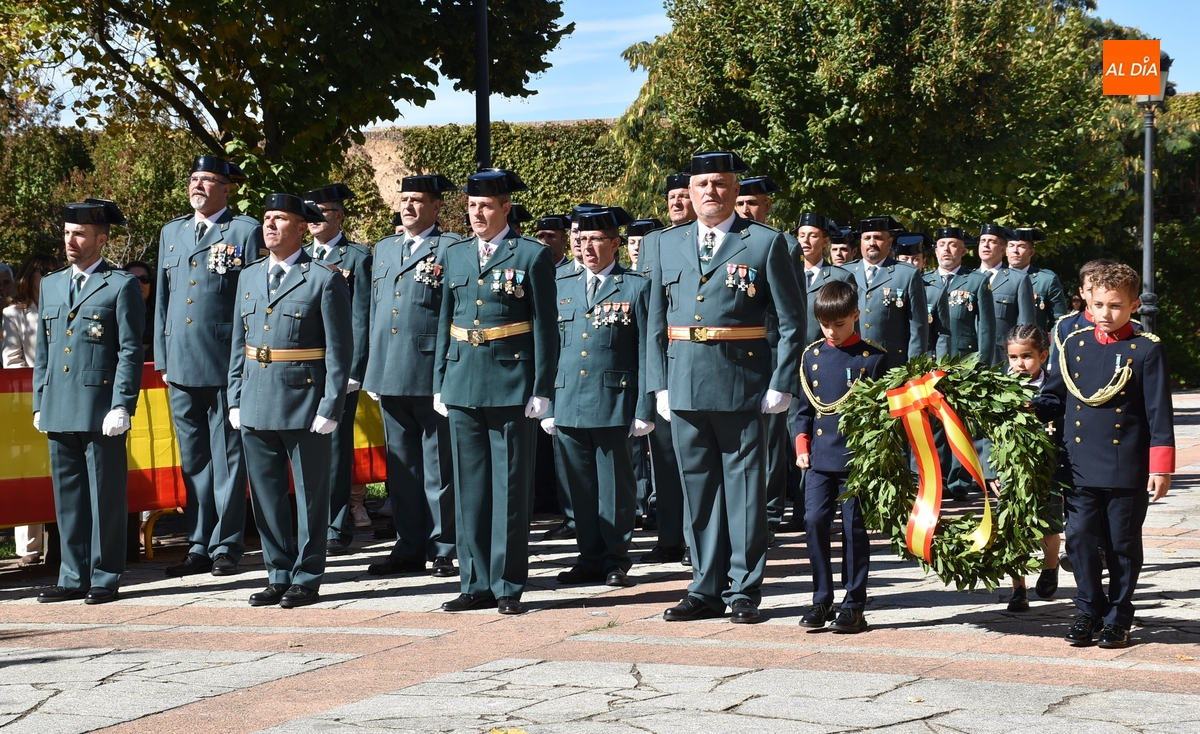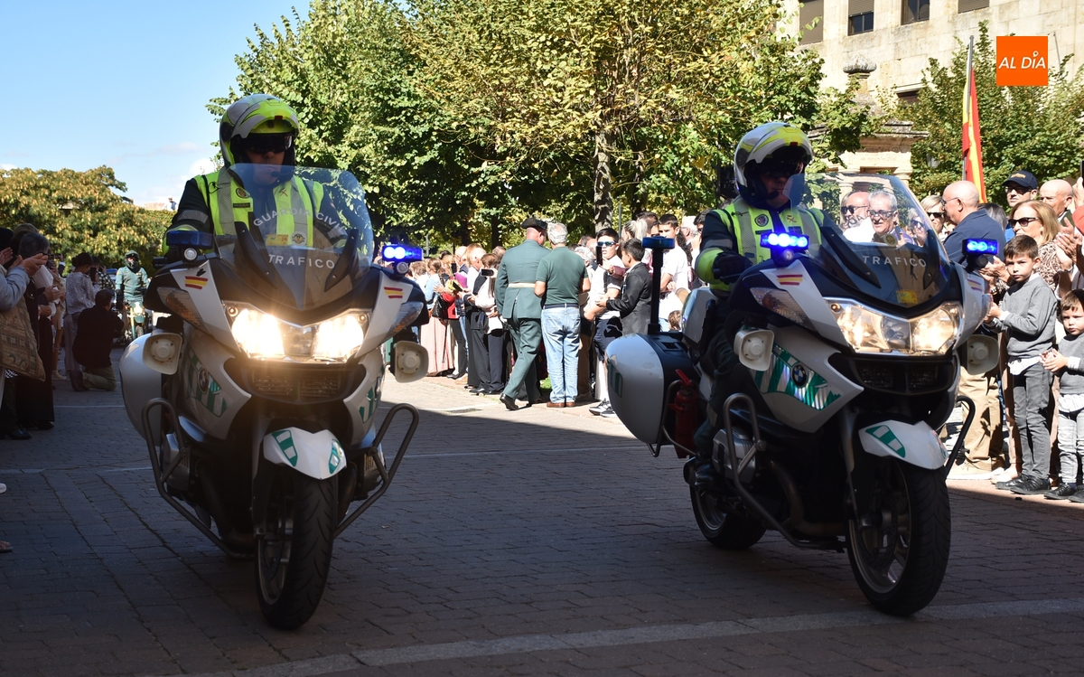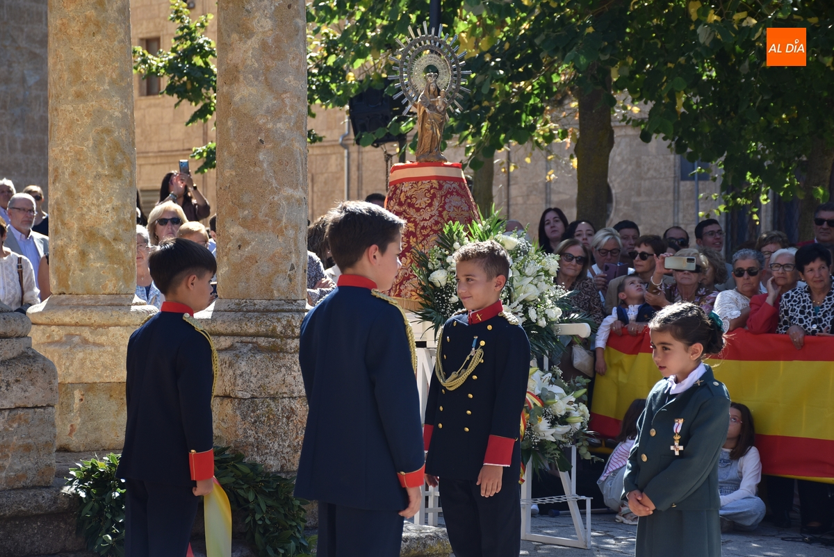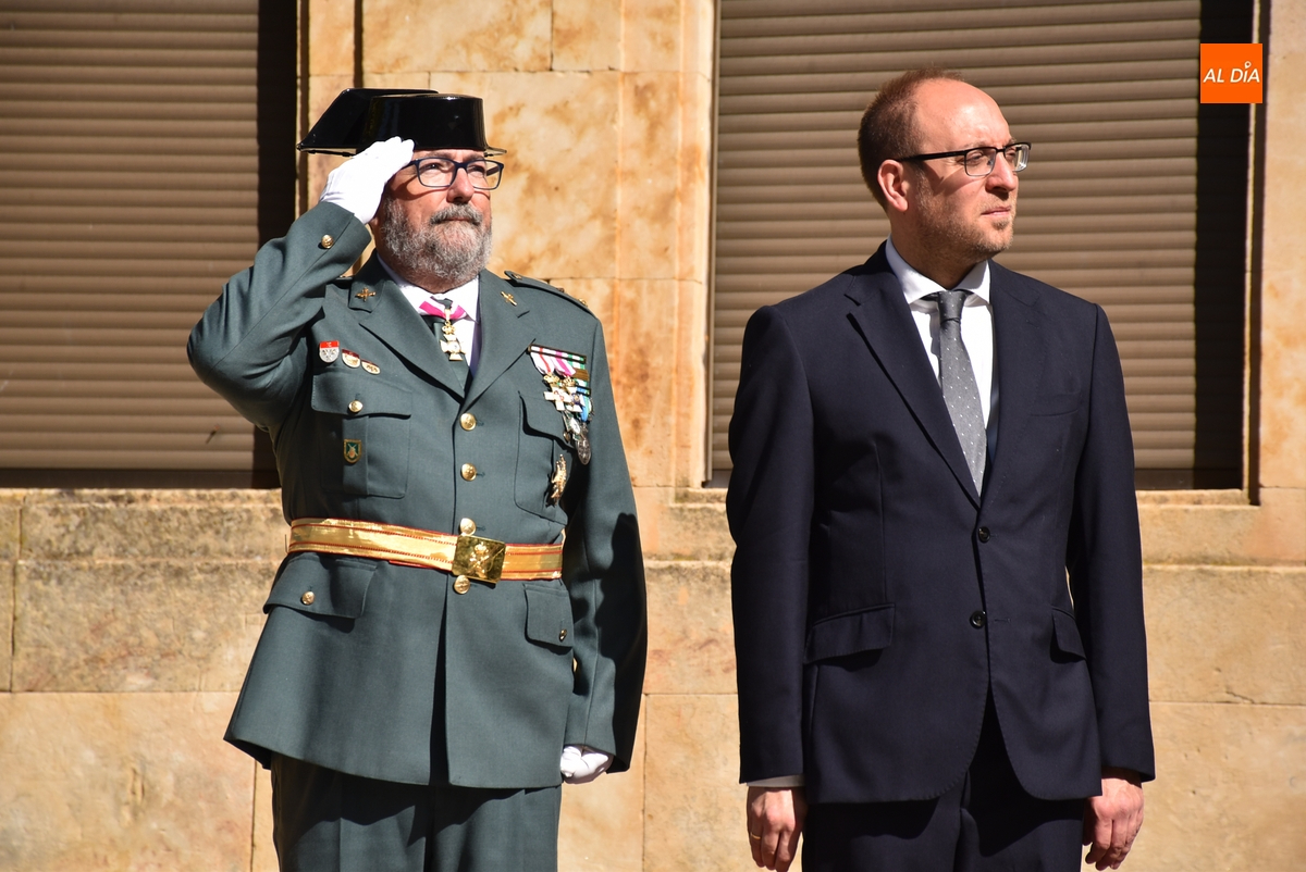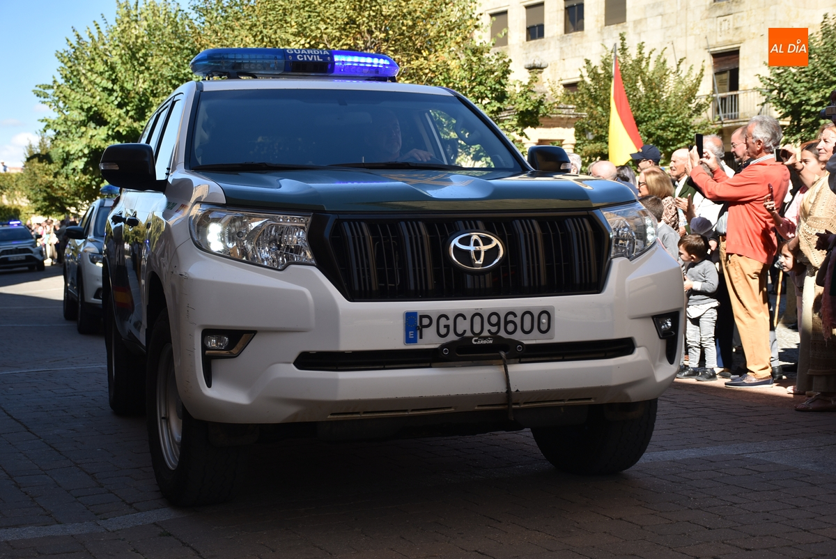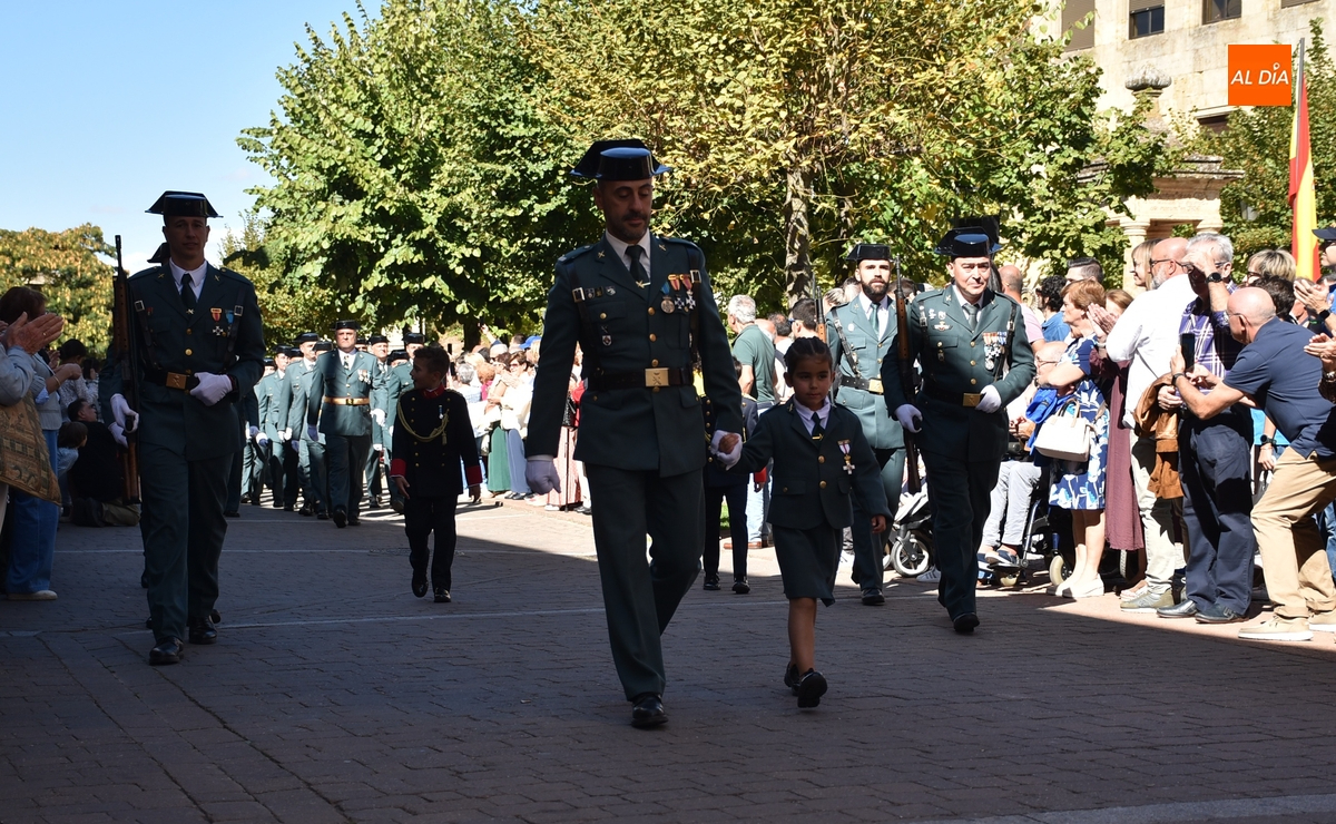 Finalizados los actos litúrgicos en honor a la Virgen del Pilar, la Plazuela de Herrasti fue también escenario en la mañana dominical de los actos institucionales de celebración por parte de la Compañía de Ciudad Rodrigo de la Guardia Civil de su patrona, aunque en el lateral opuesto del espacio, por donde se habían repartido vallas delimitadoras que lucían la bandera de España.