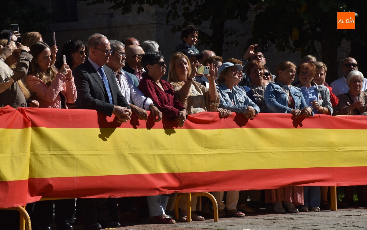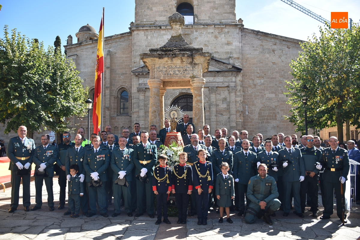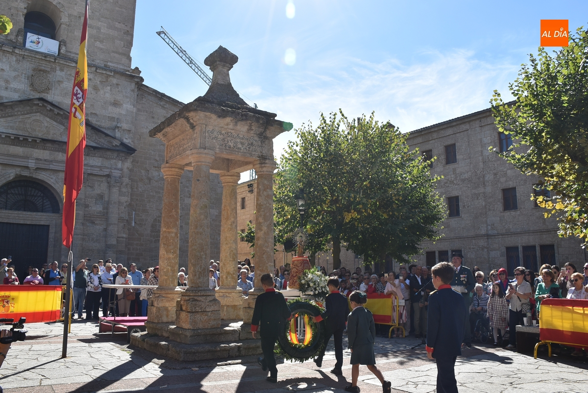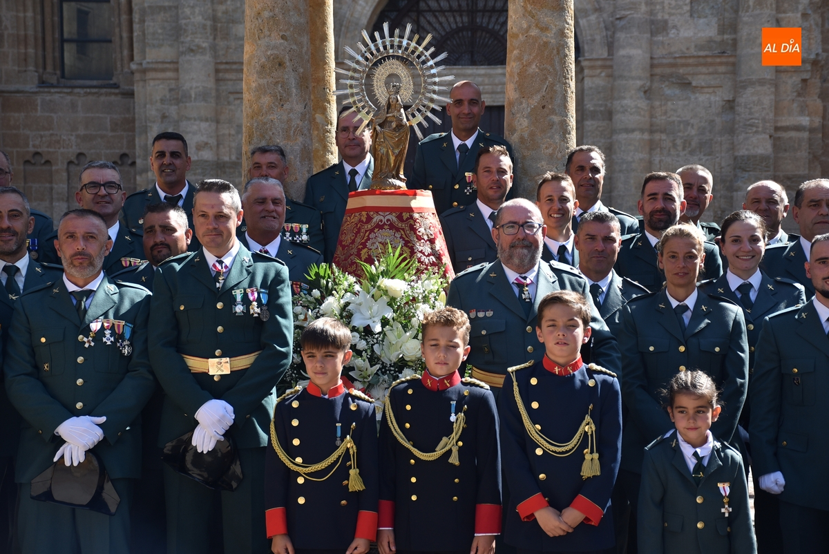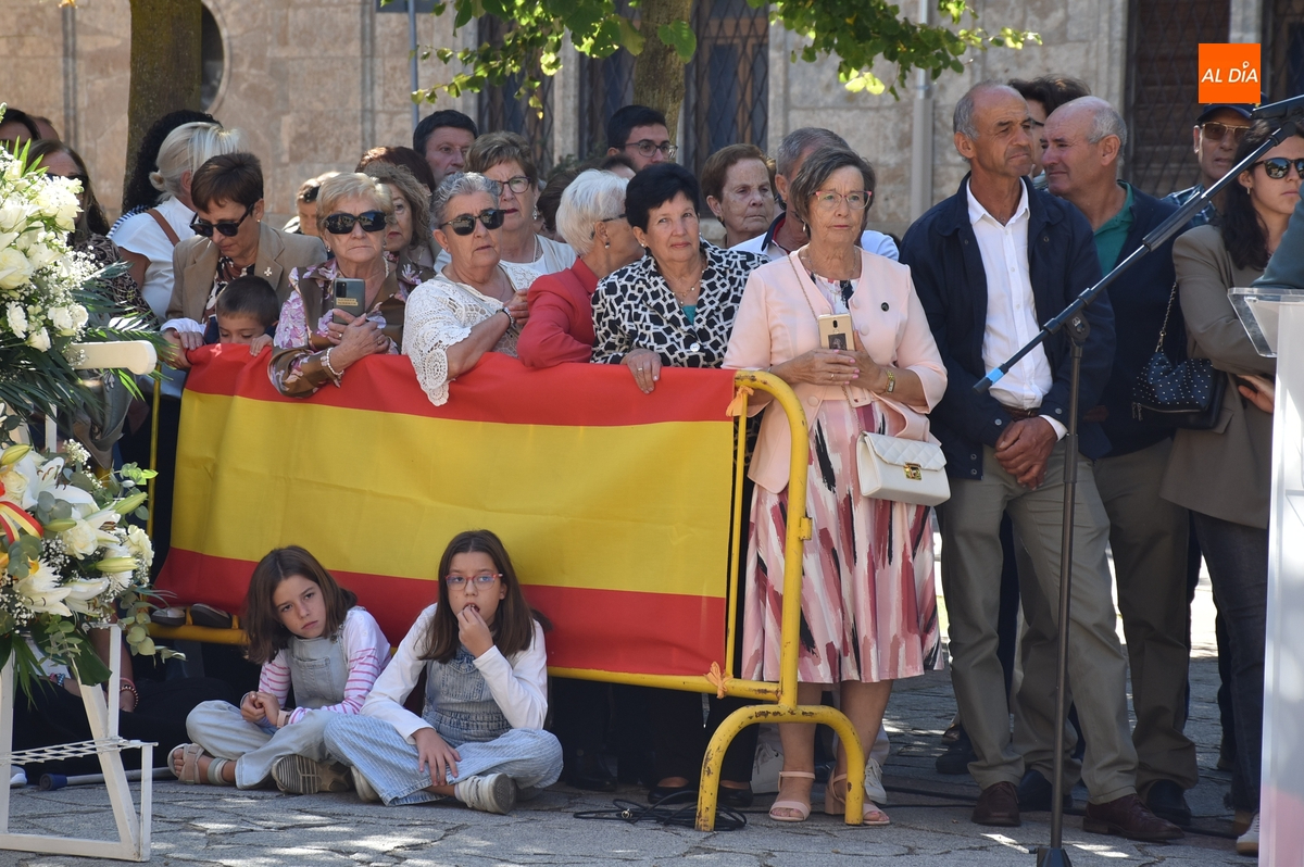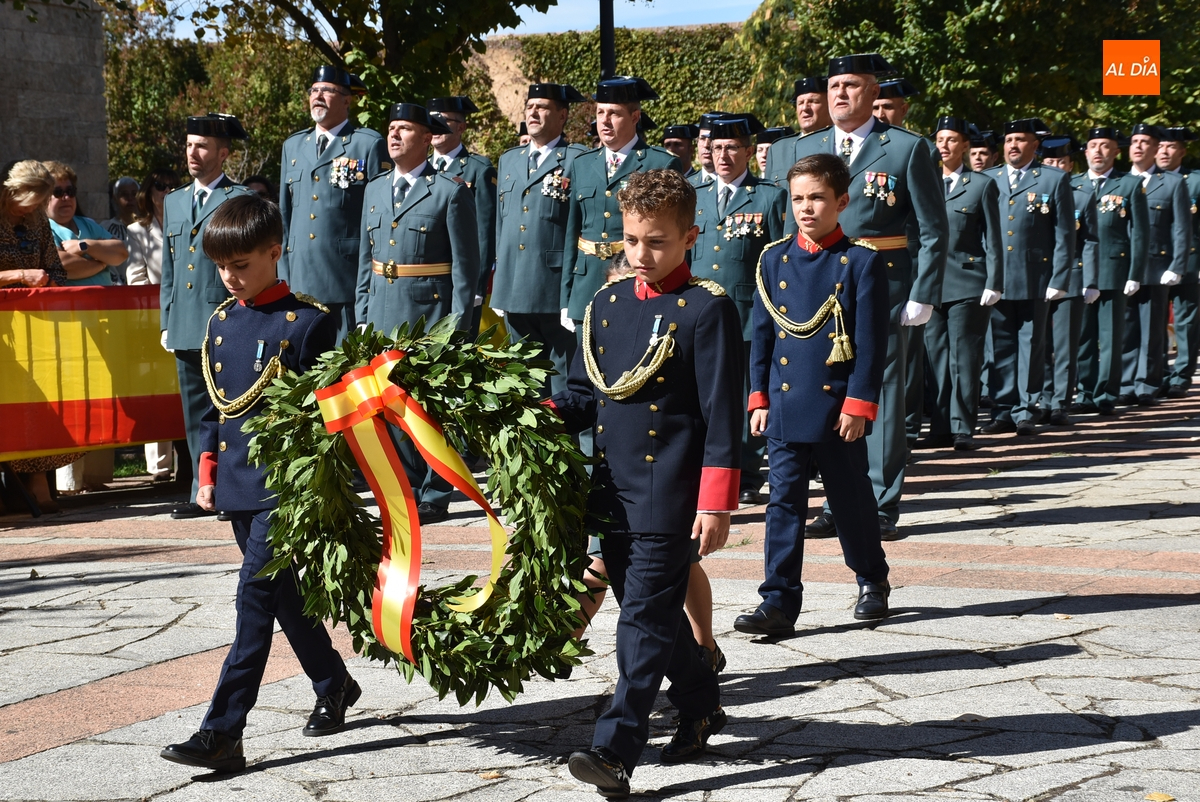 Finalizados los actos litúrgicos en honor a la Virgen del Pilar, la Plazuela de Herrasti fue también escenario en la mañana dominical de los actos institucionales de celebración por parte de la Compañía de Ciudad Rodrigo de la Guardia Civil de su patrona, aunque en el lateral opuesto del espacio, por donde se habían repartido vallas delimitadoras que lucían la bandera de España.