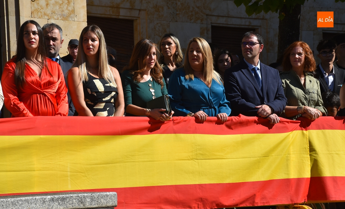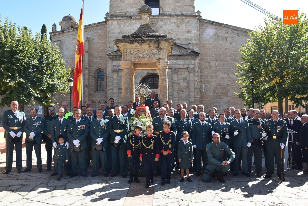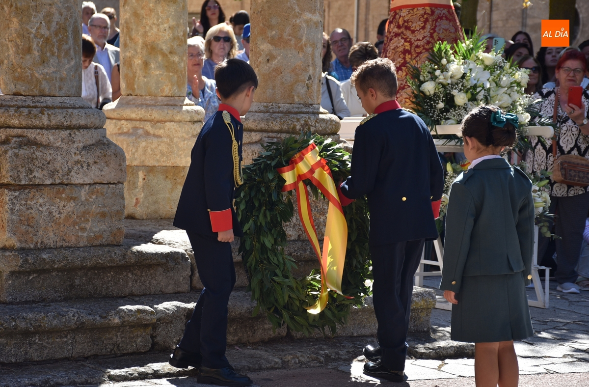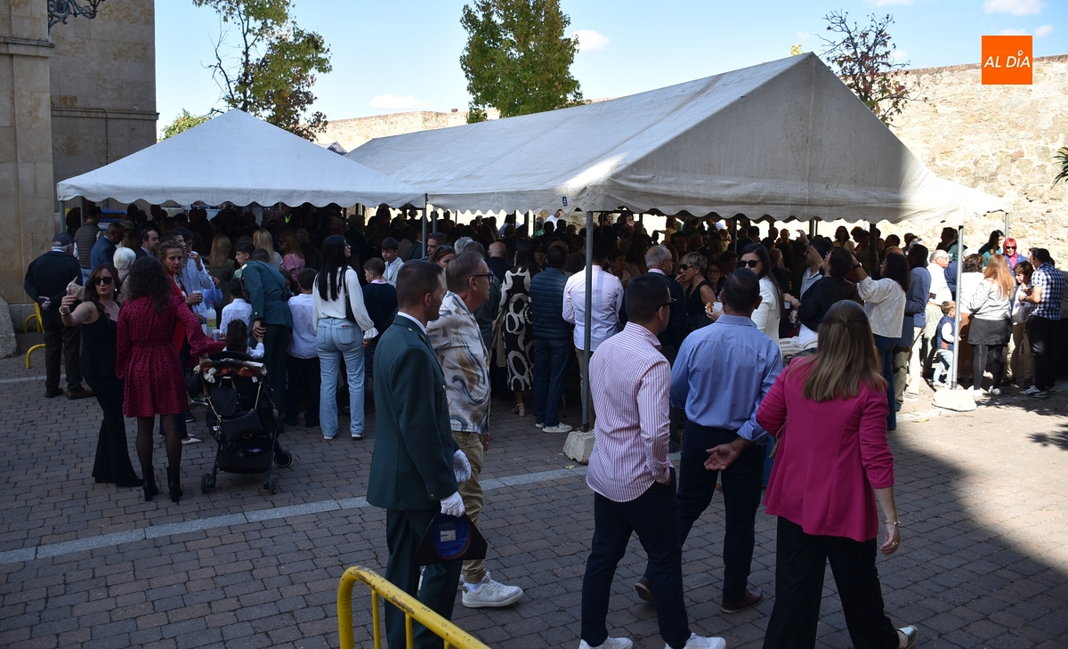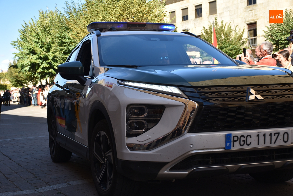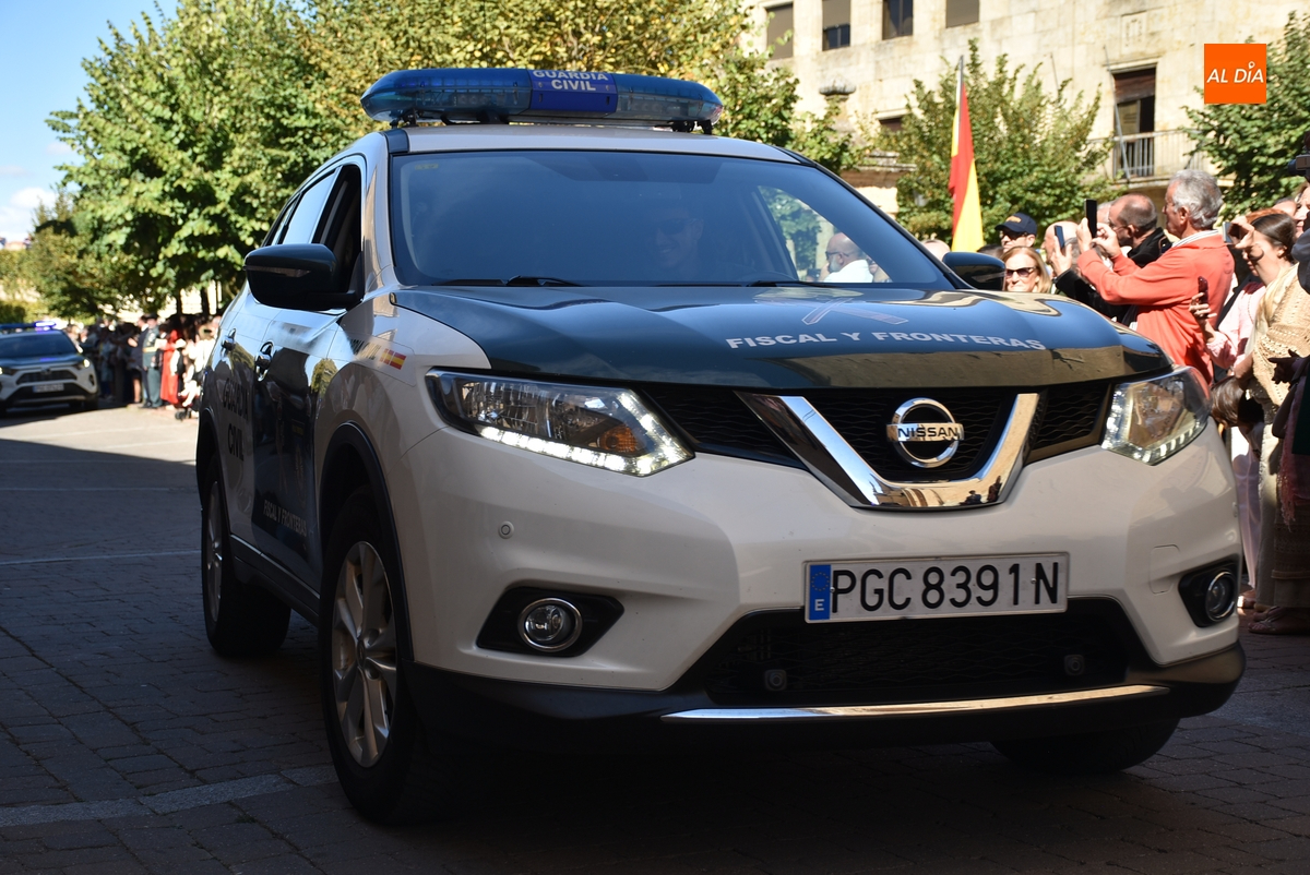 Finalizados los actos litúrgicos en honor a la Virgen del Pilar, la Plazuela de Herrasti fue también escenario en la mañana dominical de los actos institucionales de celebración por parte de la Compañía de Ciudad Rodrigo de la Guardia Civil de su patrona, aunque en el lateral opuesto del espacio, por donde se habían repartido vallas delimitadoras que lucían la bandera de España.