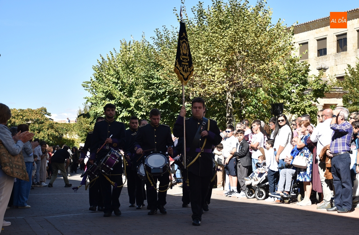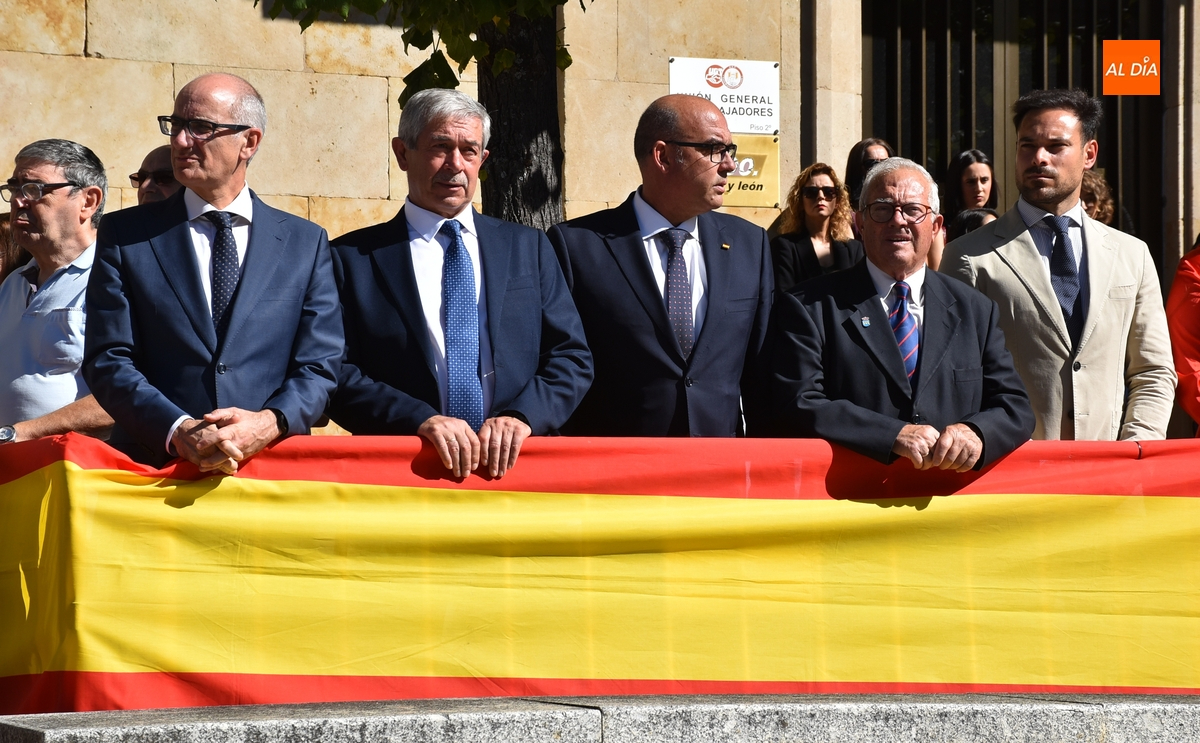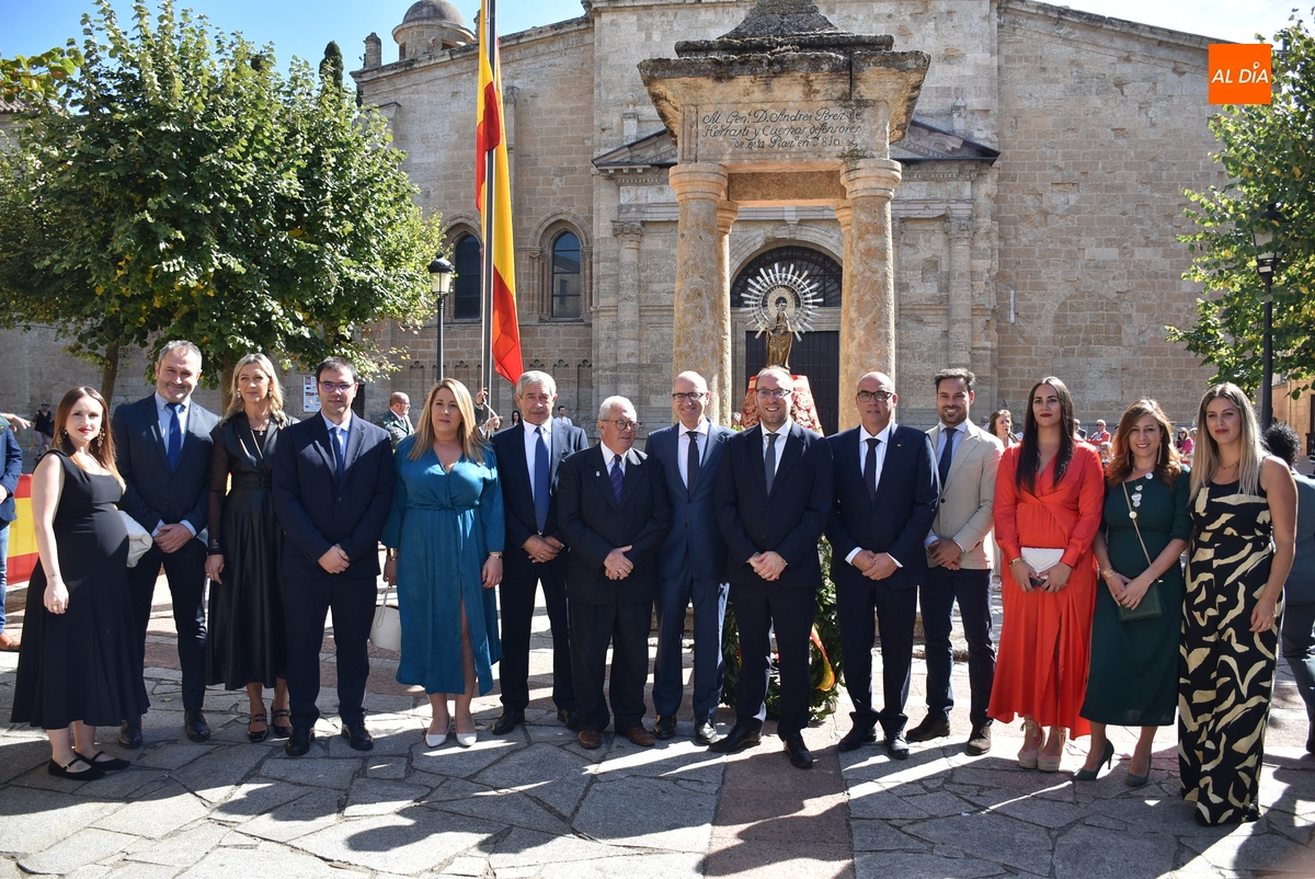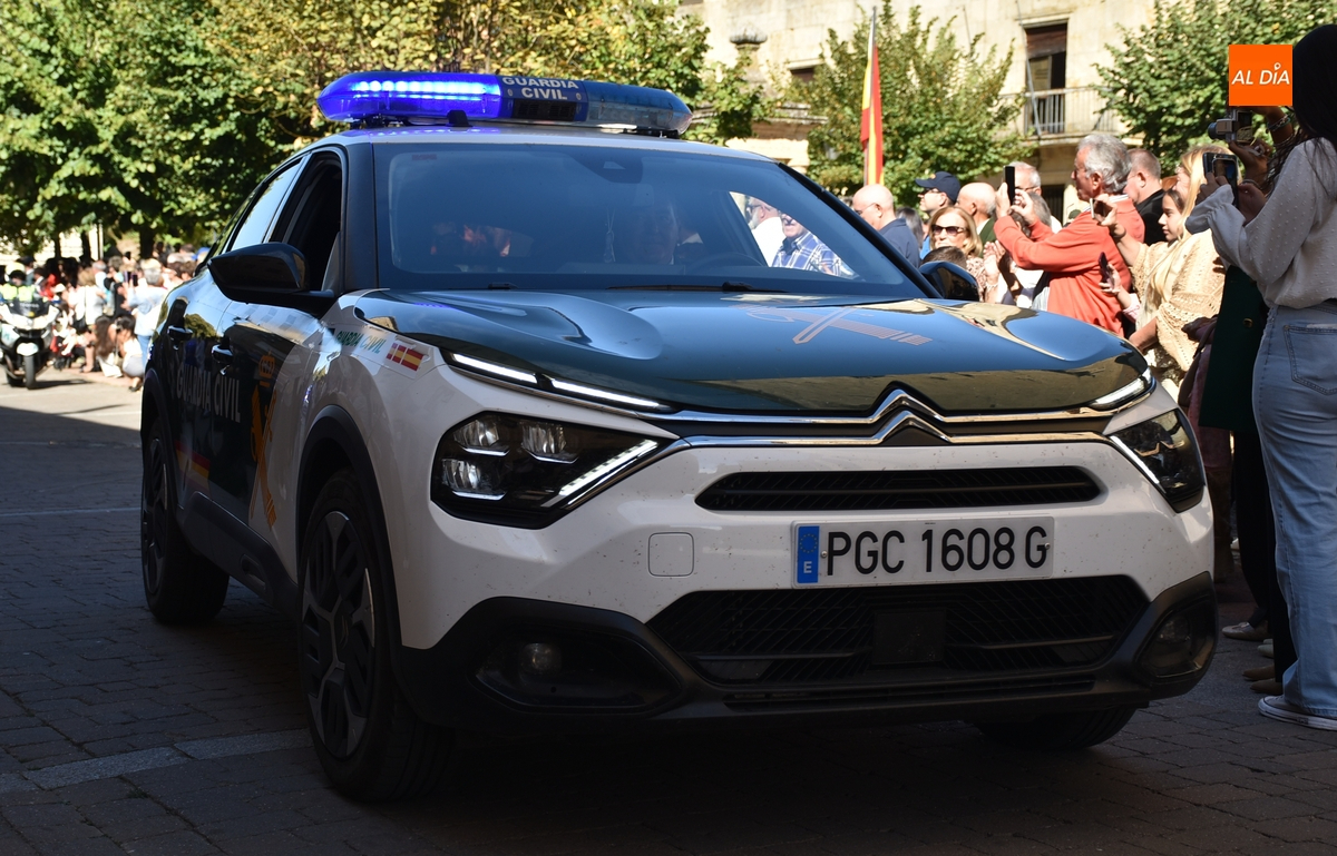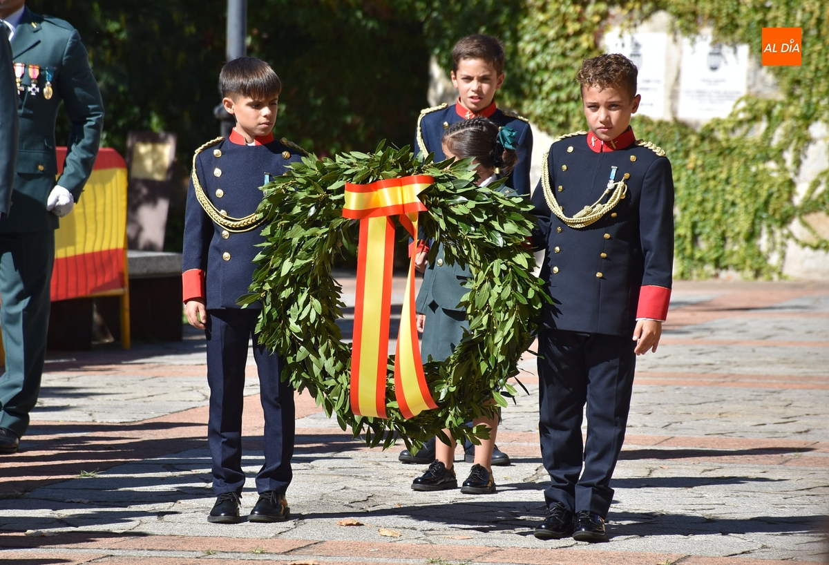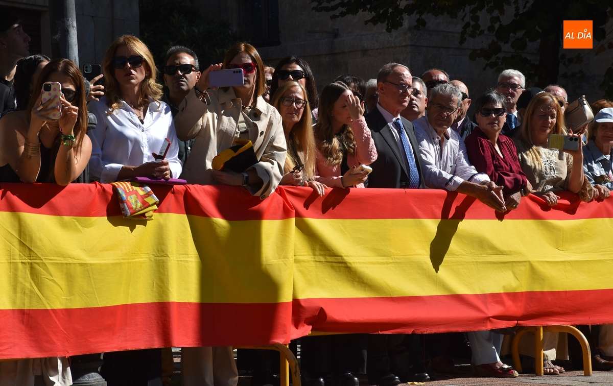 Finalizados los actos litúrgicos en honor a la Virgen del Pilar, la Plazuela de Herrasti fue también escenario en la mañana dominical de los actos institucionales de celebración por parte de la Compañía de Ciudad Rodrigo de la Guardia Civil de su patrona, aunque en el lateral opuesto del espacio, por donde se habían repartido vallas delimitadoras que lucían la bandera de España.