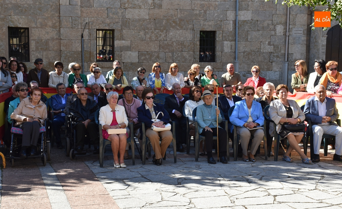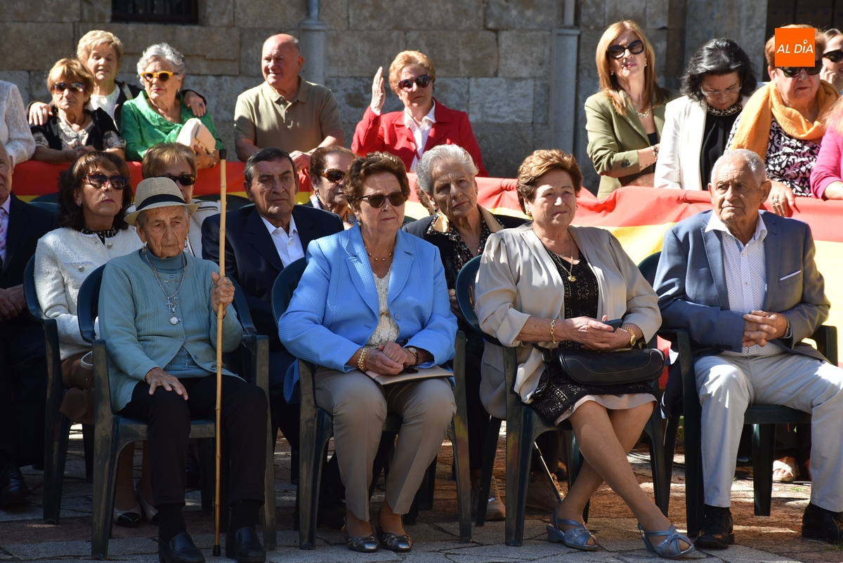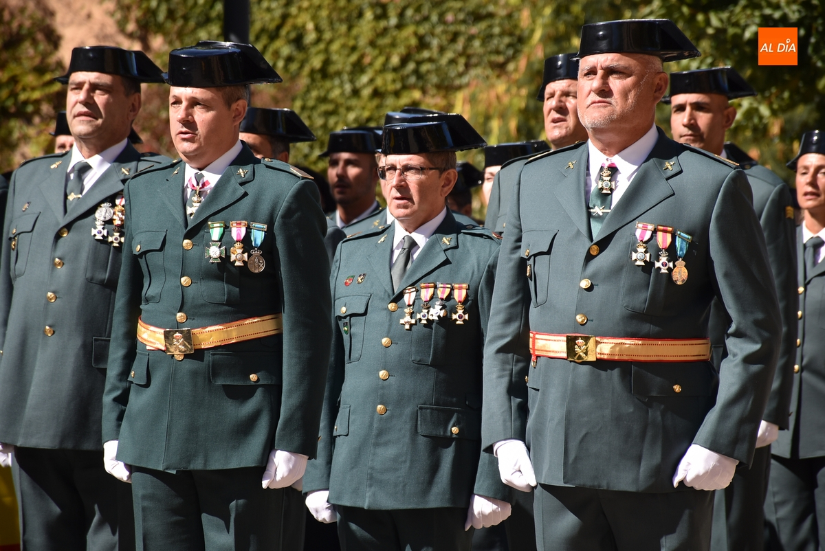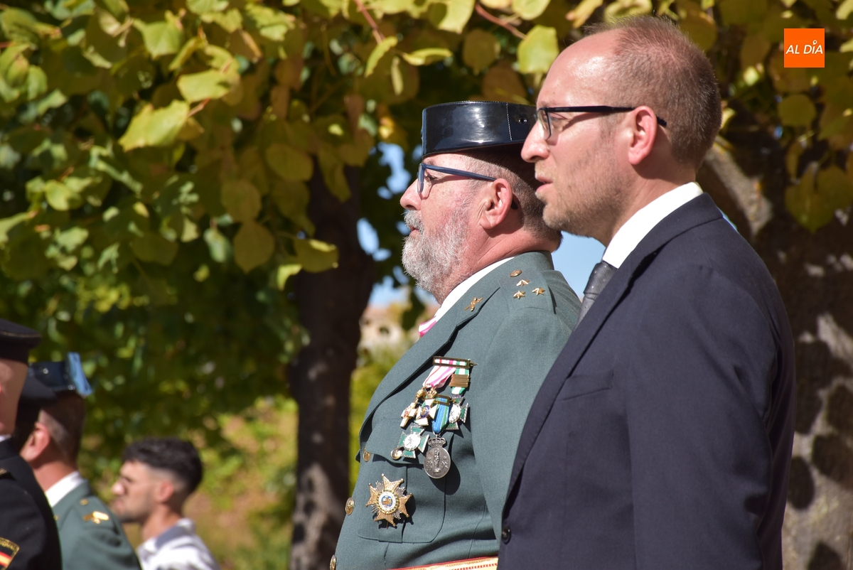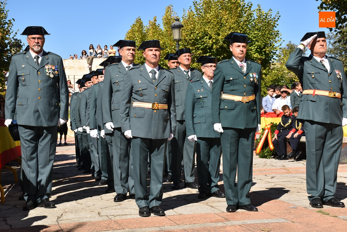 Dentro del recinto vallado únicamente estuvieron veteranos del Cuerpo –y familiares- sentados en unas sillas, los agentes de la Guardia Civil que asistieron a la conmemoración, así como quienes la presidieron desde una tarima, el capitán de la Benemérita mirobrigense, Pablo Javier Gatell Ruiz de Gordejuela, y el alcalde mirobrigense Marcos Iglesias (el resto de autoridades estuvieron también detrás de las vallas).