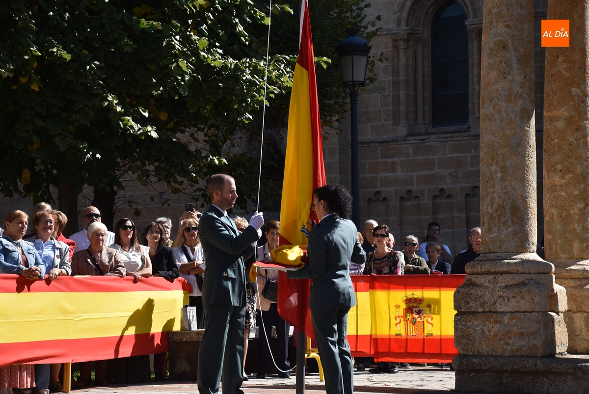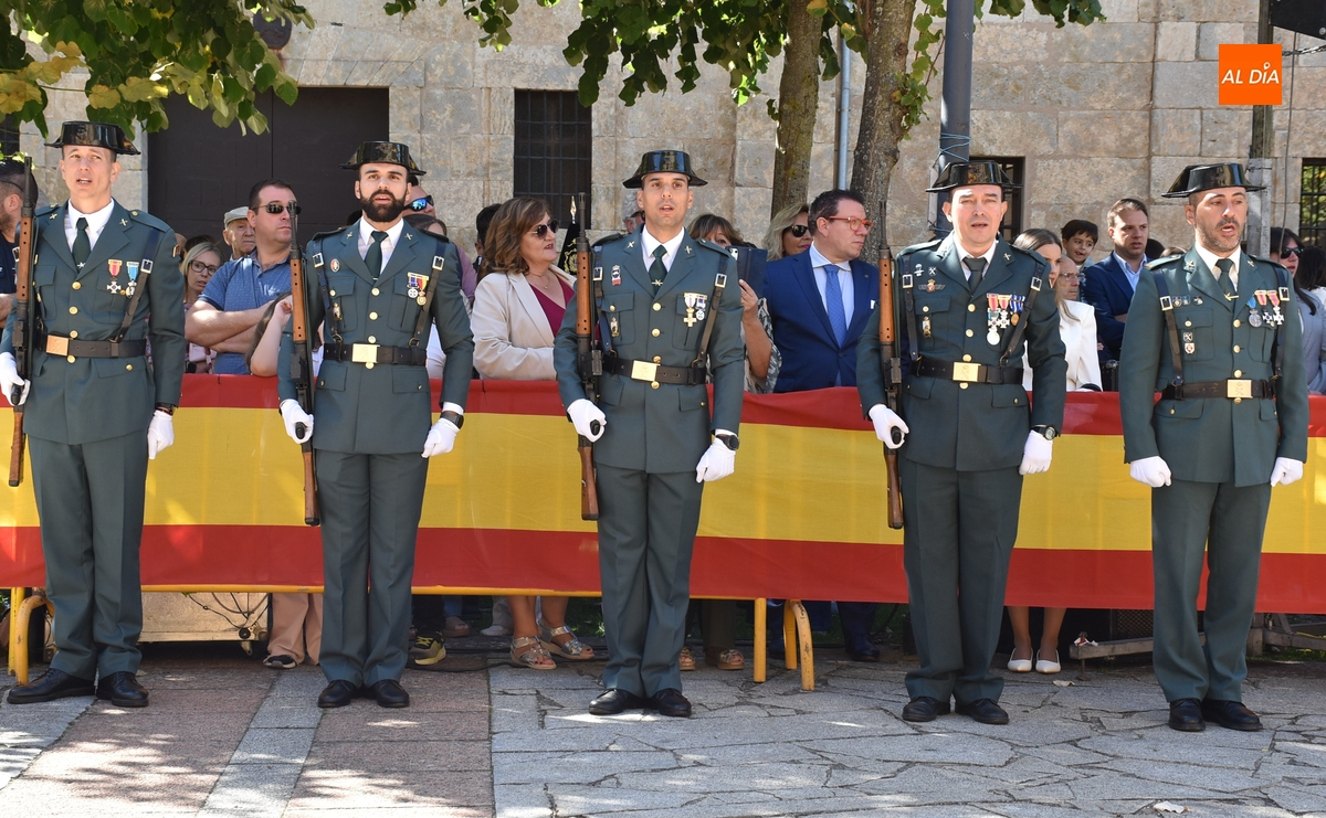 Como apertura del acto, dos agentes se encargaron –mientras sonaba el himno de España- de izar una enseña nacional de grandes dimensiones en el mástil que se había colocado junto al Monumento a Herrasti. El primer punto destacado del acto fueron una serie de reconocimientos. Por un lado, se impuso la Cruz con Distintivo Blanco de la Orden del Mérito de la Guardia Civil al agente de la Compañía de Ciudad Rodrigo Francisco José Bustillo Arroyo.