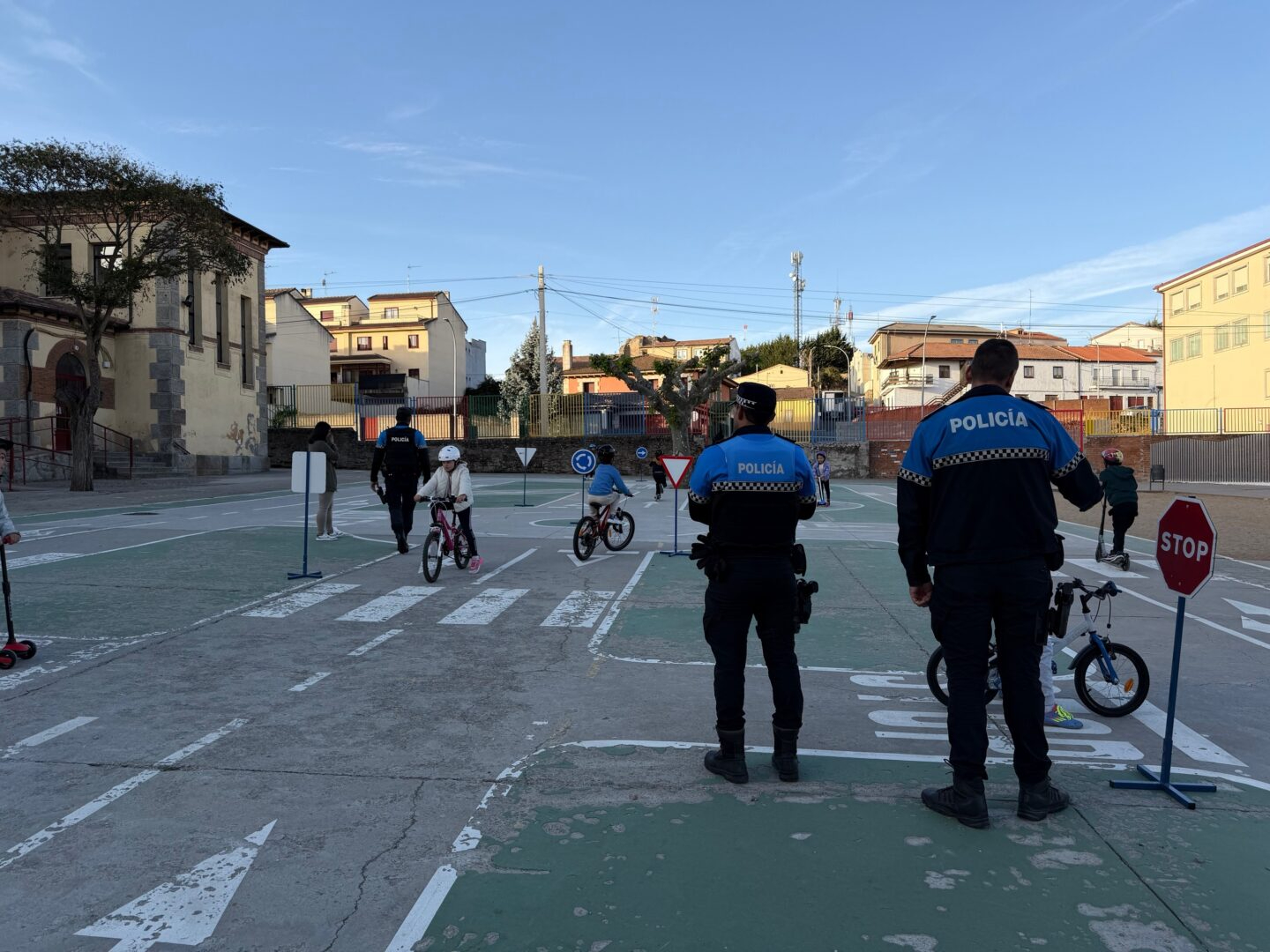 Desde primera hora de esta mañana, el patio del colegio Filiberto Villalobos se ha transformado en un circuito de tráfico en miniatura. En él, los estudiantes de Infantil y Primaria aprenden de forma práctica a respetar señales de Stop, mirar a ambos lados antes de cruzar o circular correctamente por una rotonda, aplicando los conceptos teóricos vistos previamente en el aula.