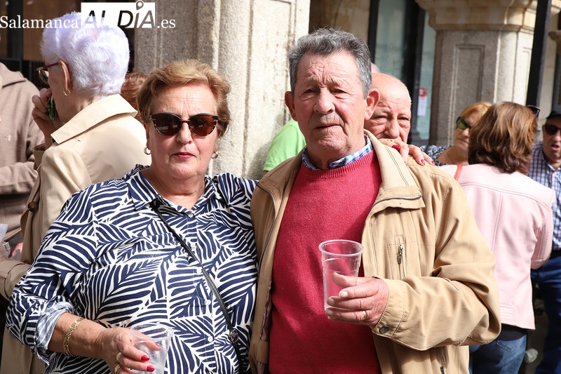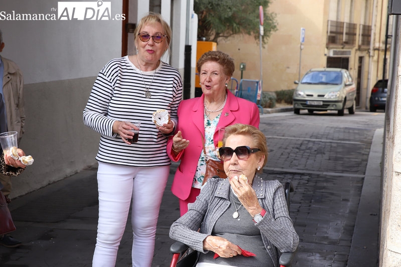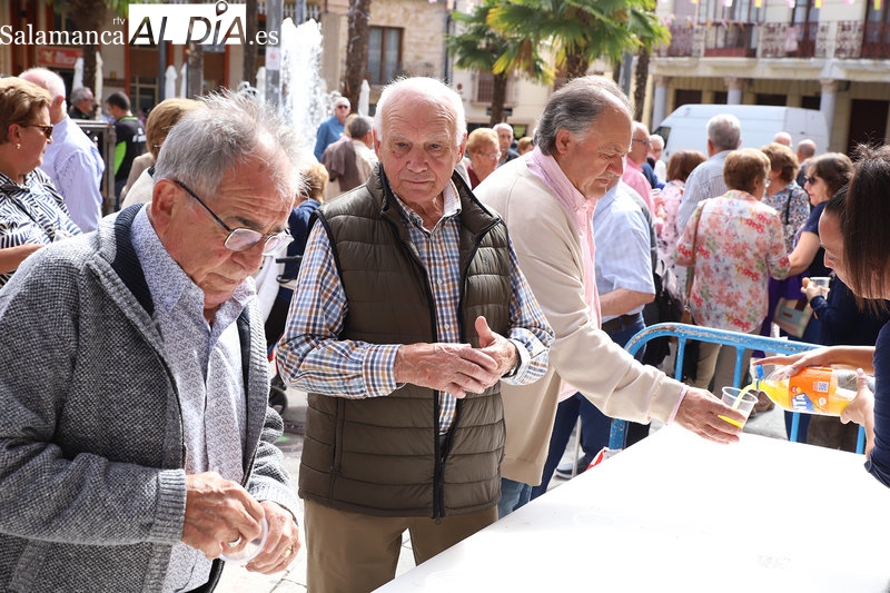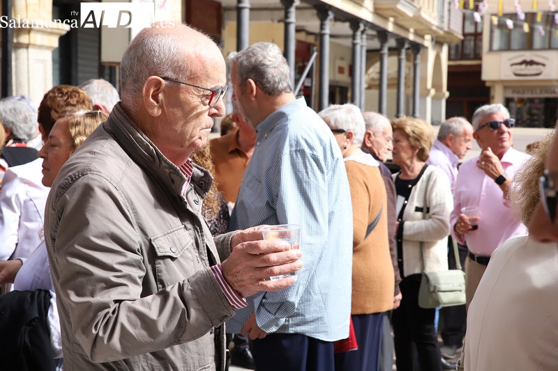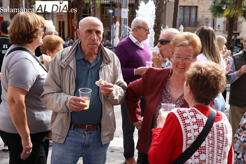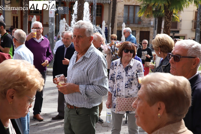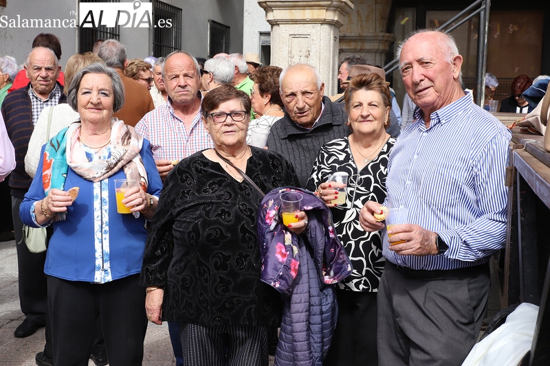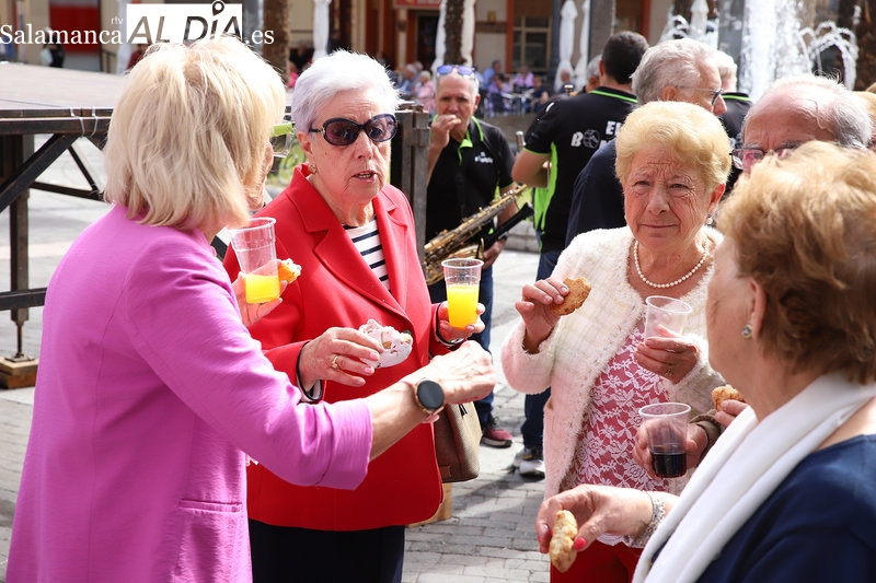 Al finalizar la misa, la fiesta se ha trasladado a la Plaza Mayor. A las 13:45 h, los mayores han podido disfrutar de dulces y pastas mientras bailaban al son de la charanga, antes de iniciar un pasacalles que los ha conducido hasta la Plaza de Toros para continuar con la celebración.