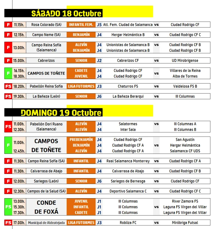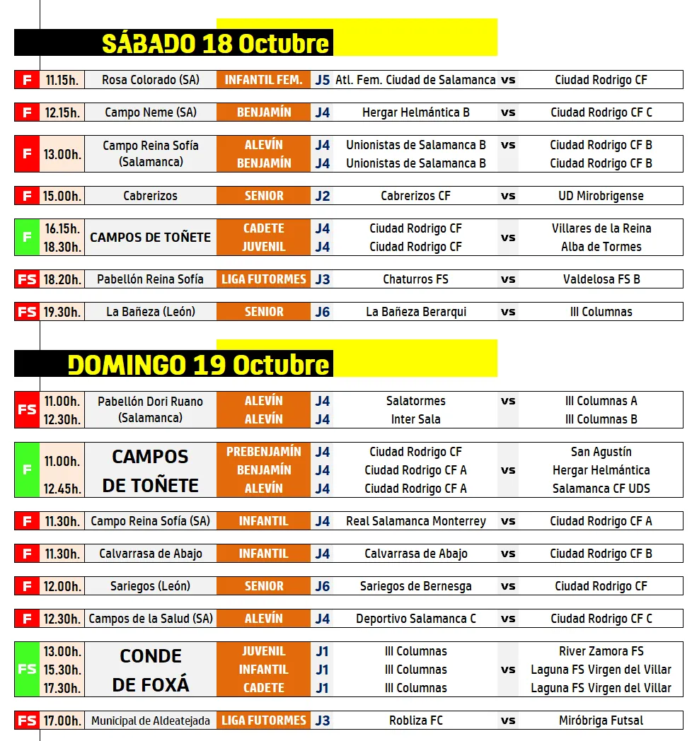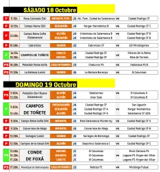 En lo que respecta a la jornada sabatina, sólo habrá dos partidos en Miróbriga, protagonizados por el Cadete y el Juvenil del Ciudad Rodrigo en la franja de tarde. Hay que apuntar que los 5 equipos del Ciudad Rodrigo que juegan en casa (que son los que militan en las primeras divisiones provinciales) lo harán en esta ocasión frente a rivales totalmente diferentes, al igual que ocurrirá con la mayoría de los que juegan fuera.