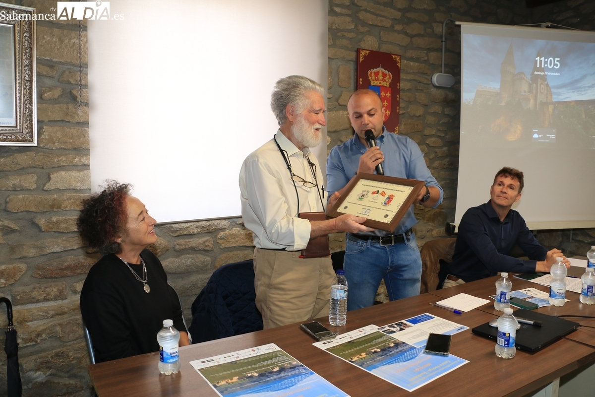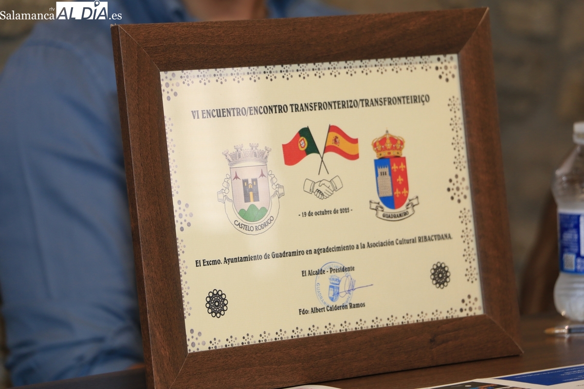 Calderón también resaltó el honor que supone para Guadramiro compartir este evento con Castelo Rodrigo, una "villa histórica medieval" de gran relevancia en la Raya. Recordó que, al igual que la localidad lusa, Guadramiro también tuvo marqueses y una historia relevante. El regidor tuvo palabras de especial reconocimiento para Carlos Vicente, a quien calificó como una "figura importante y muy relevante" por su dedicación. Como gesto de agradecimiento, el alcalde le hizo entrega de una placa conmemorativa del encuentro en nombre de la asociación.