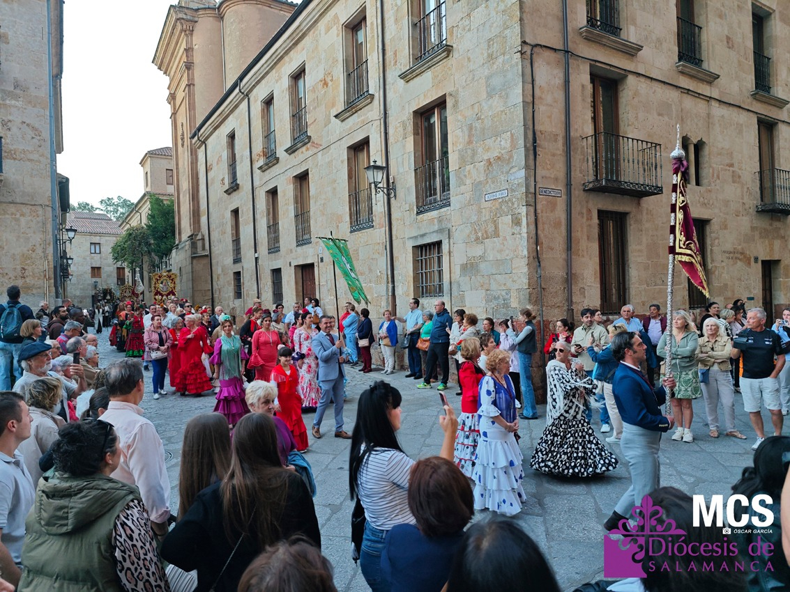 El encuentro ha reunido a cerca de treinta hermandades, con la Hermandad del Rocío de Salamanca actuando como organizadora y anfitriona. Previamente a la celebración religiosa, las cofradías participantes han protagonizado un recorrido por diferentes calles del casco histórico de la ciudad hasta su llegada al templo.