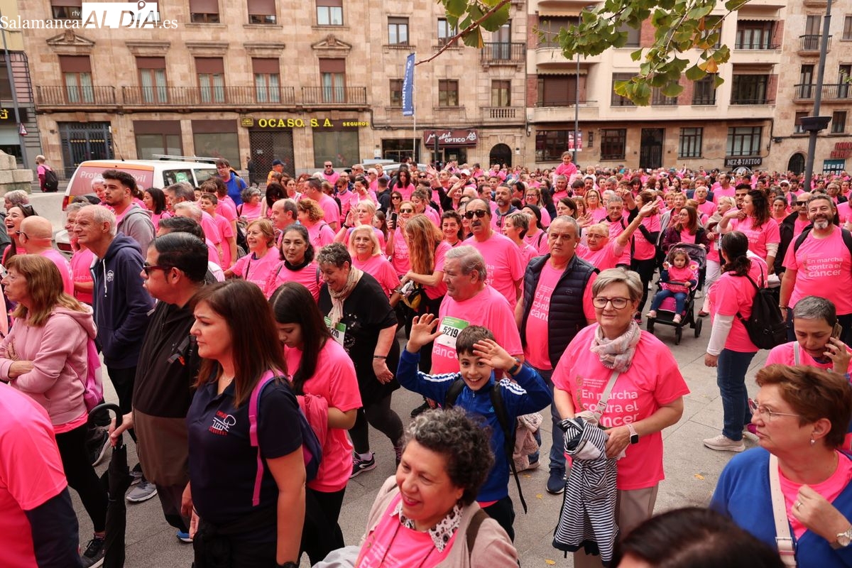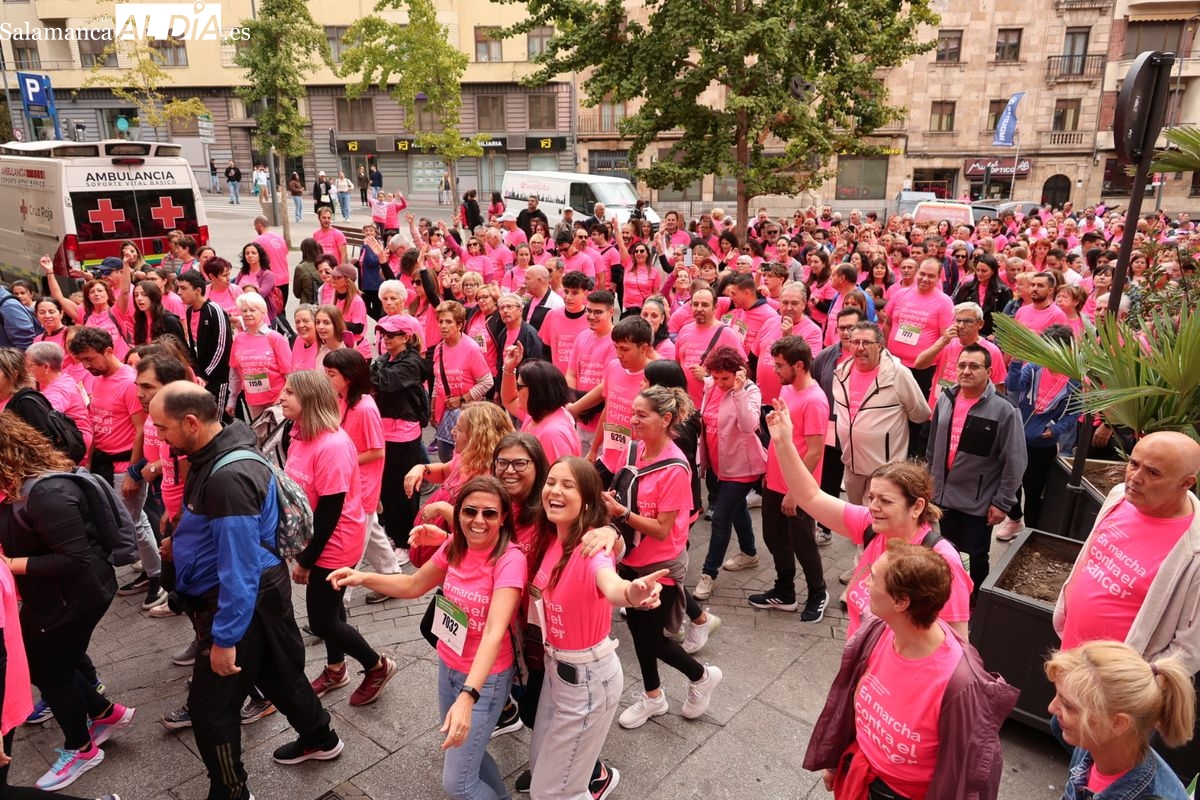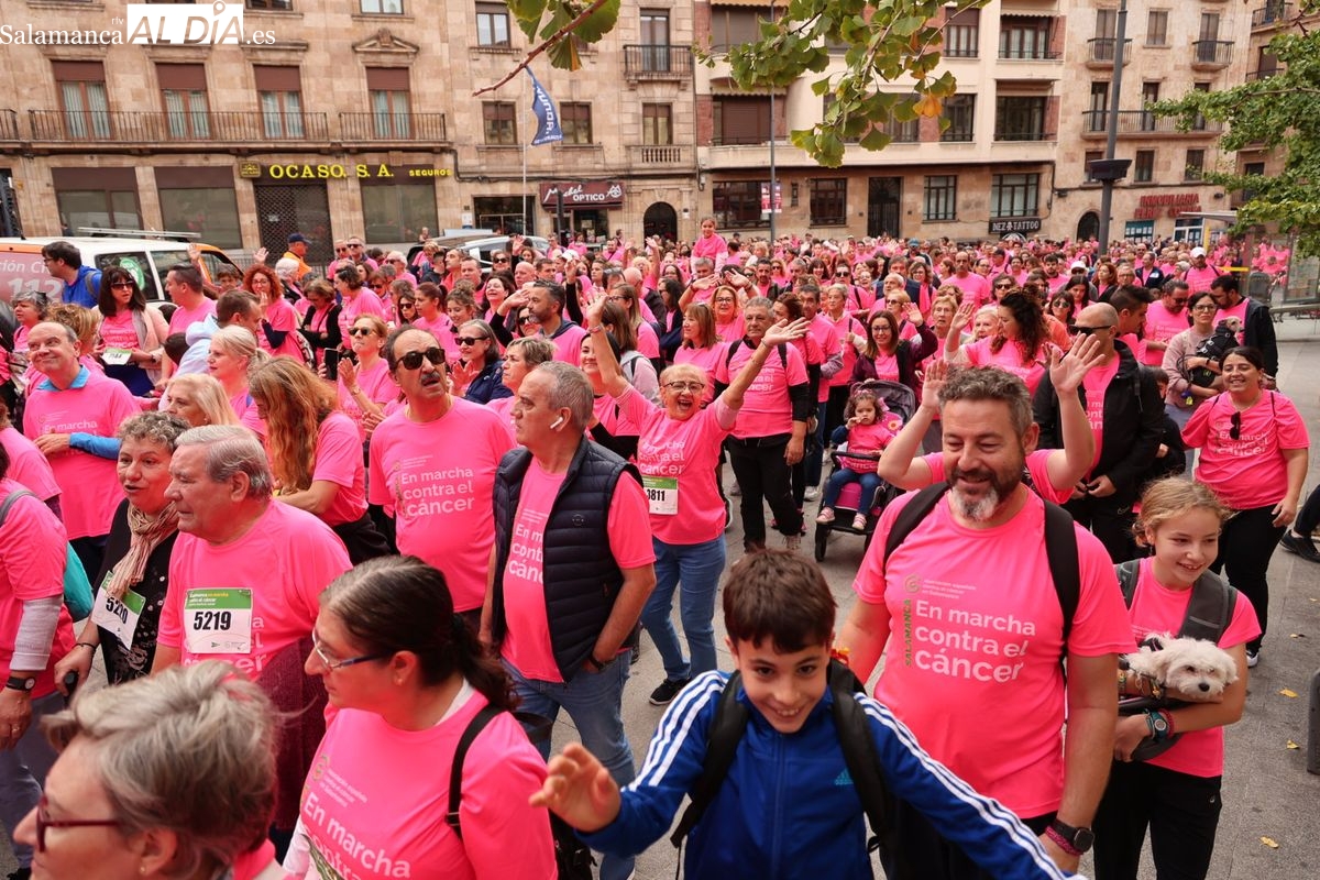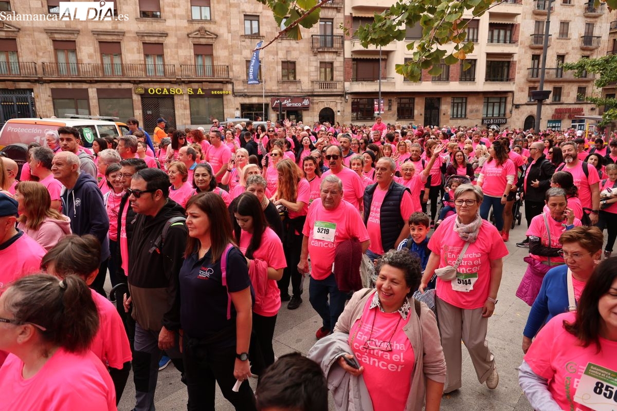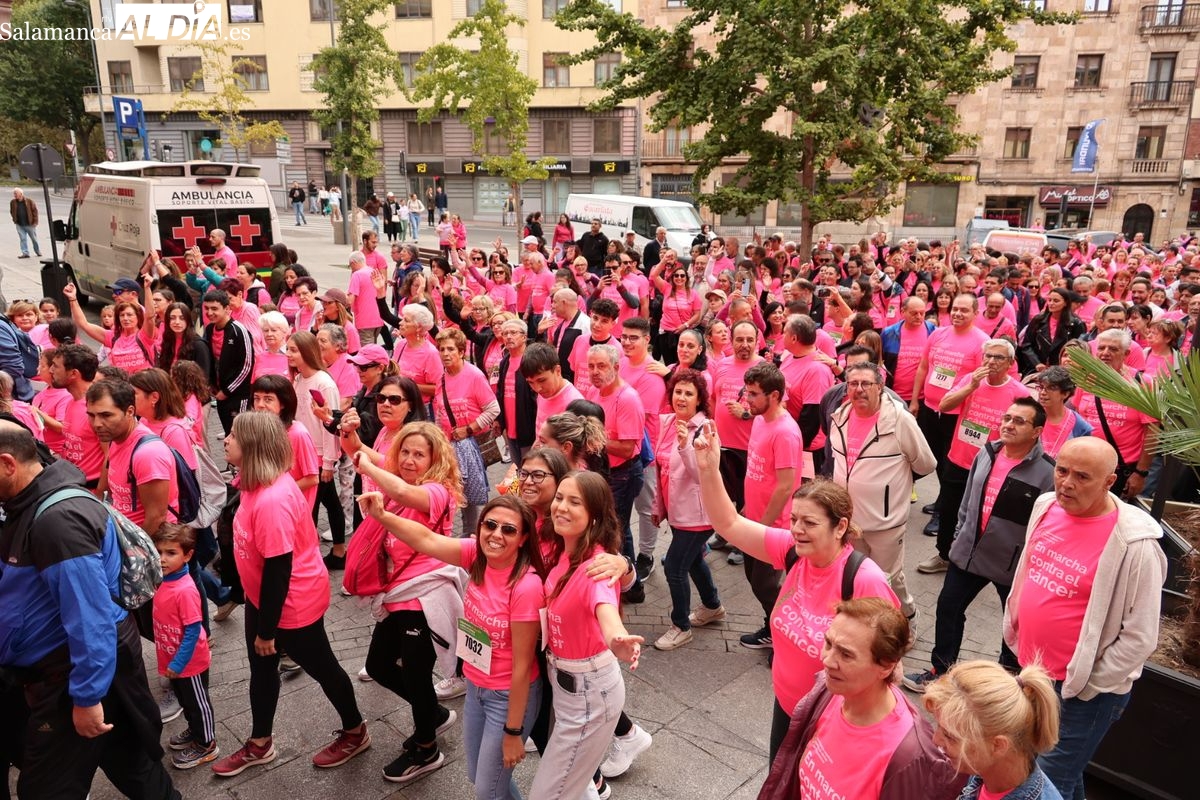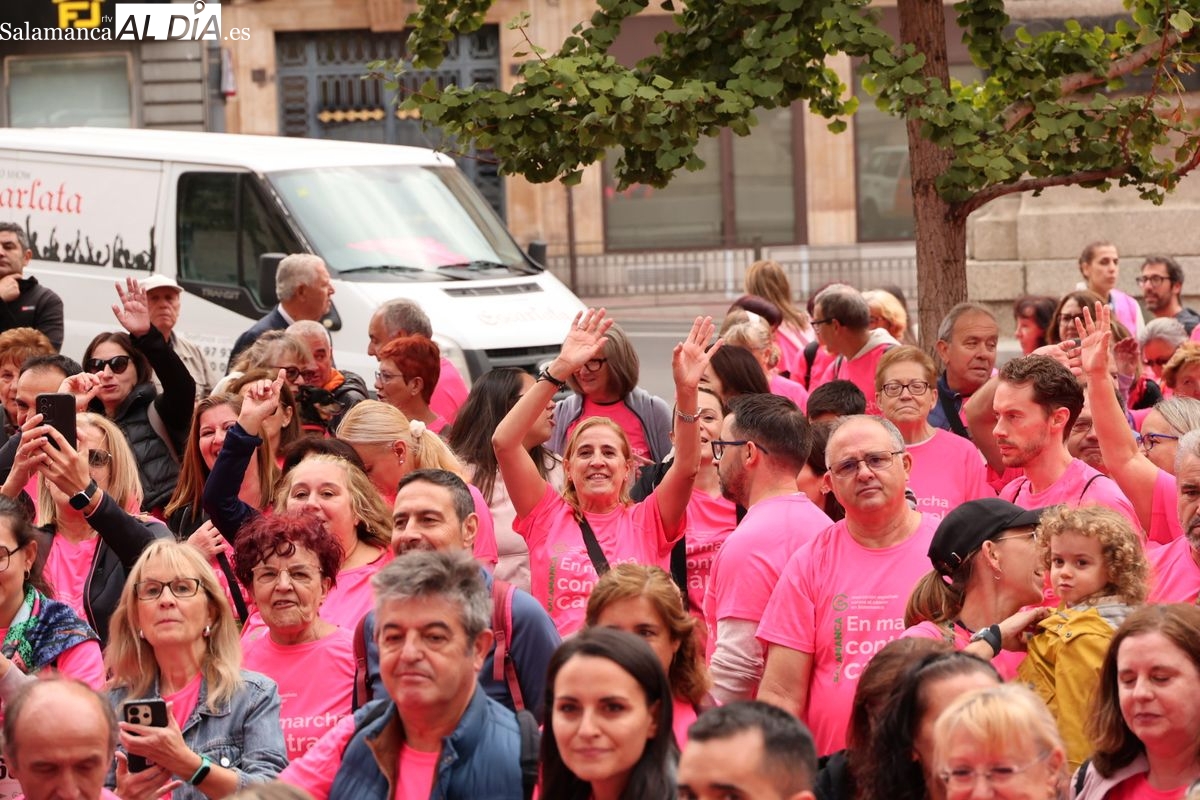 Salamanca se ha vuelto a teñir de rosa en la XI Marcha Contra el Cáncer. El evento, que ha comenzado a las 10:30 horas, ha sido un recorrido accesible de 6 kilómetros desde la iglesia del Arrabal hasta la Plaza Mayor. El objetivo es claro: sumar recursos para la investigación y contribuir a alcanzar la meta del 70% de supervivencia en cáncer para el año 2030.