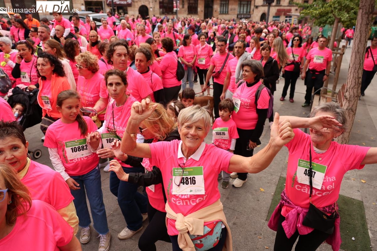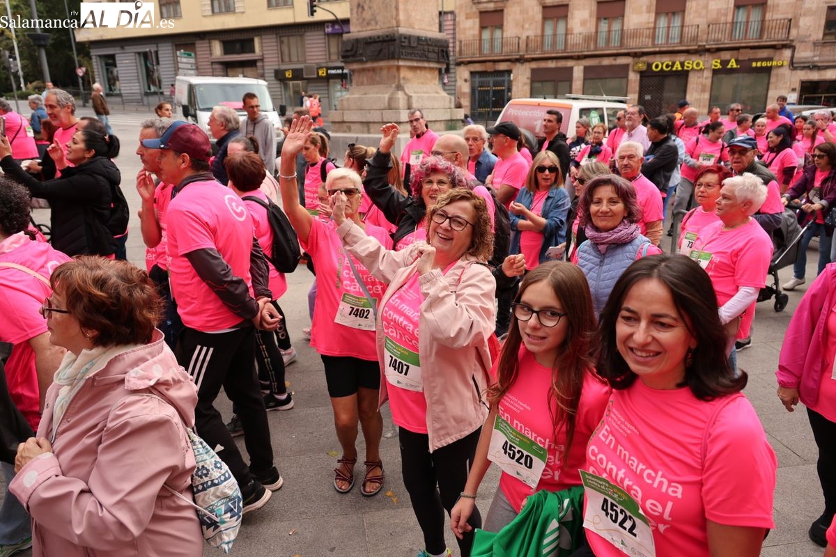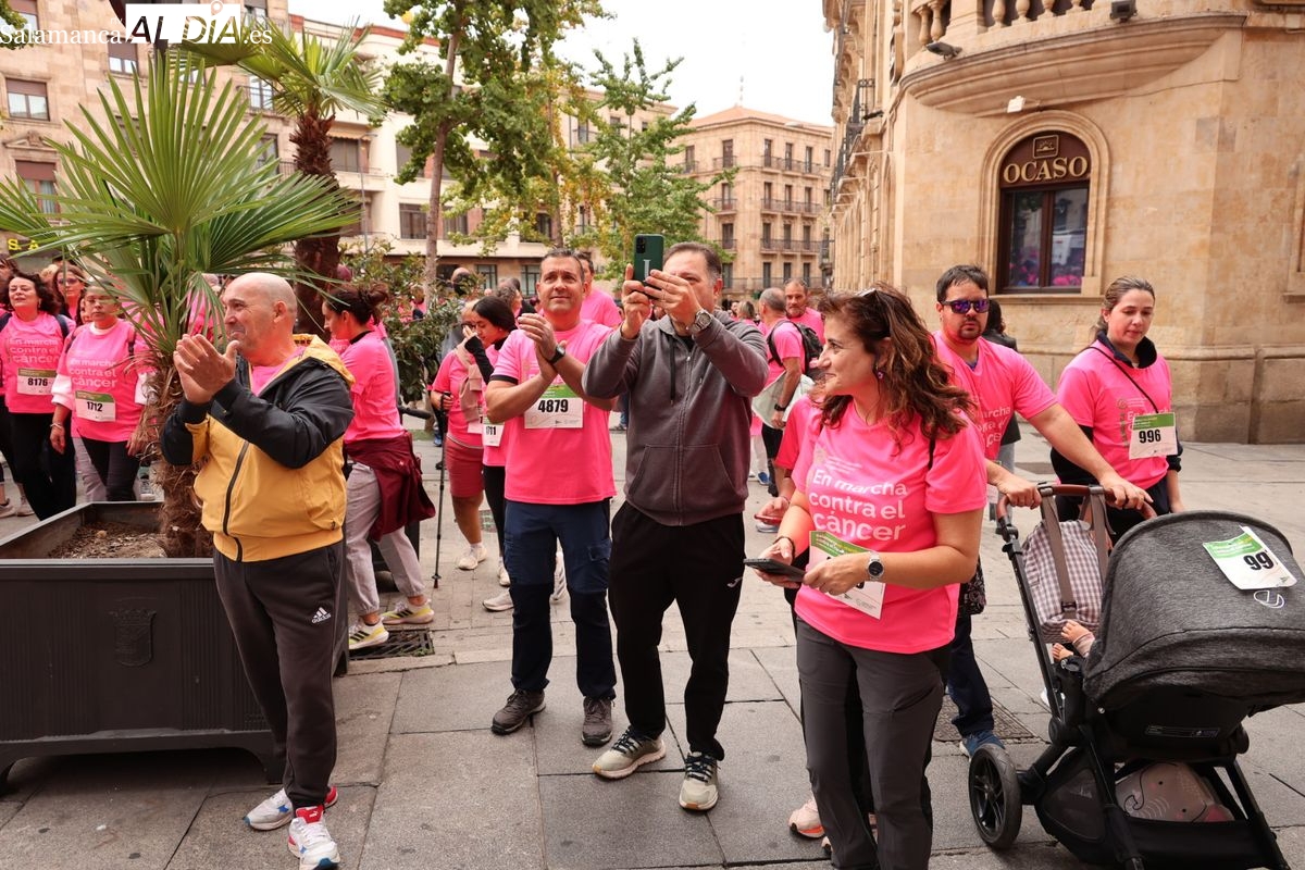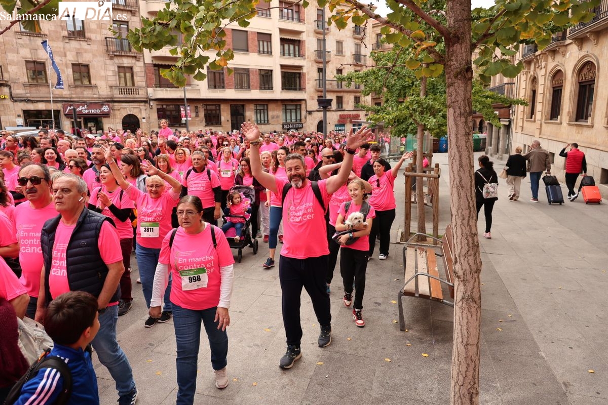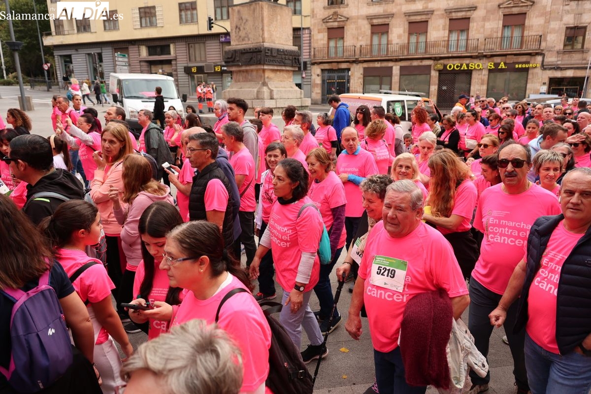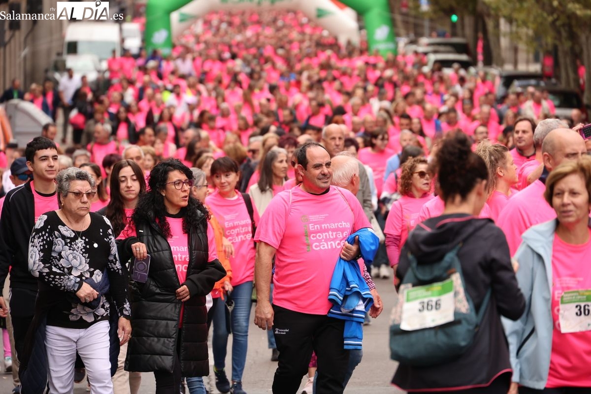 Salamanca se ha vuelto a teñir de rosa en la XI Marcha Contra el Cáncer. El evento, que ha comenzado a las 10:30 horas, ha sido un recorrido accesible de 6 kilómetros desde la iglesia del Arrabal hasta la Plaza Mayor. El objetivo es claro: sumar recursos para la investigación y contribuir a alcanzar la meta del 70% de supervivencia en cáncer para el año 2030.