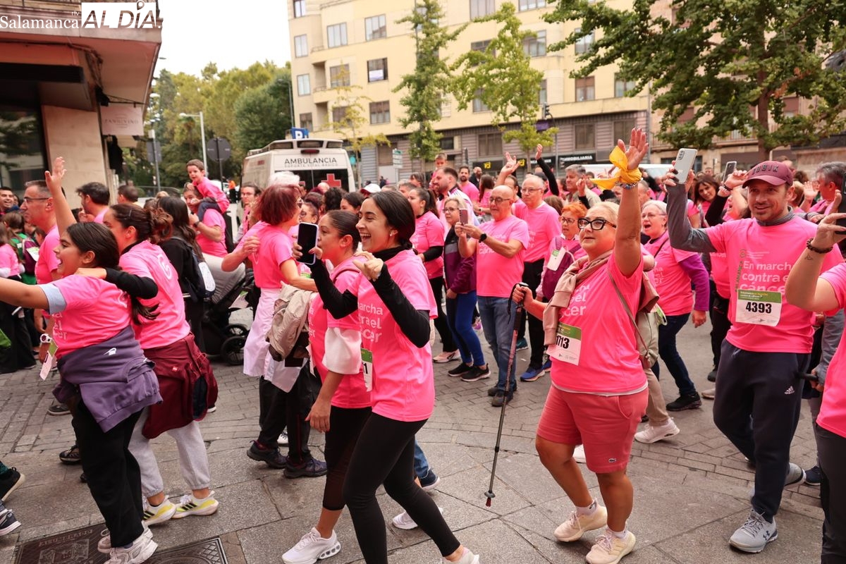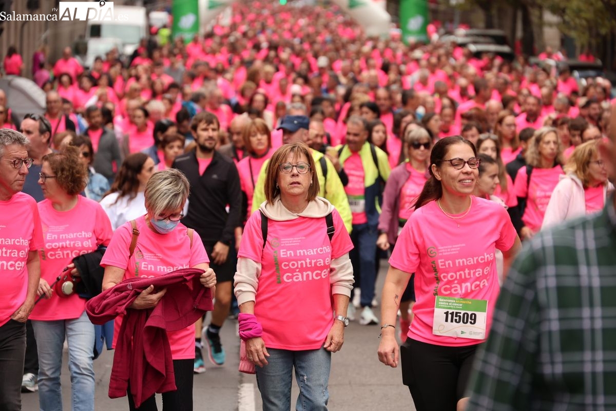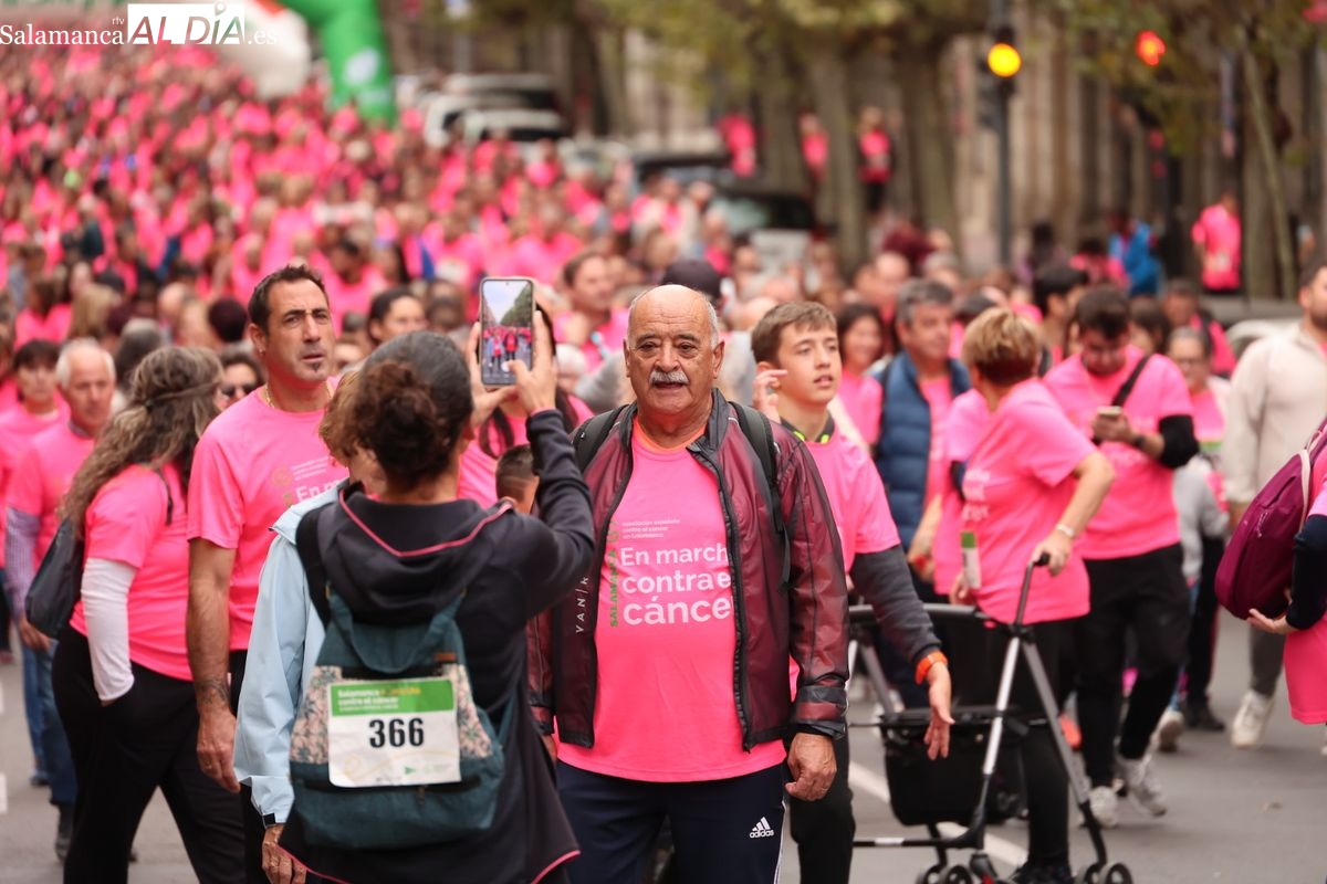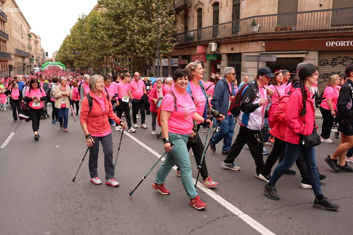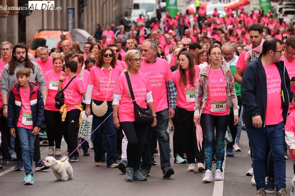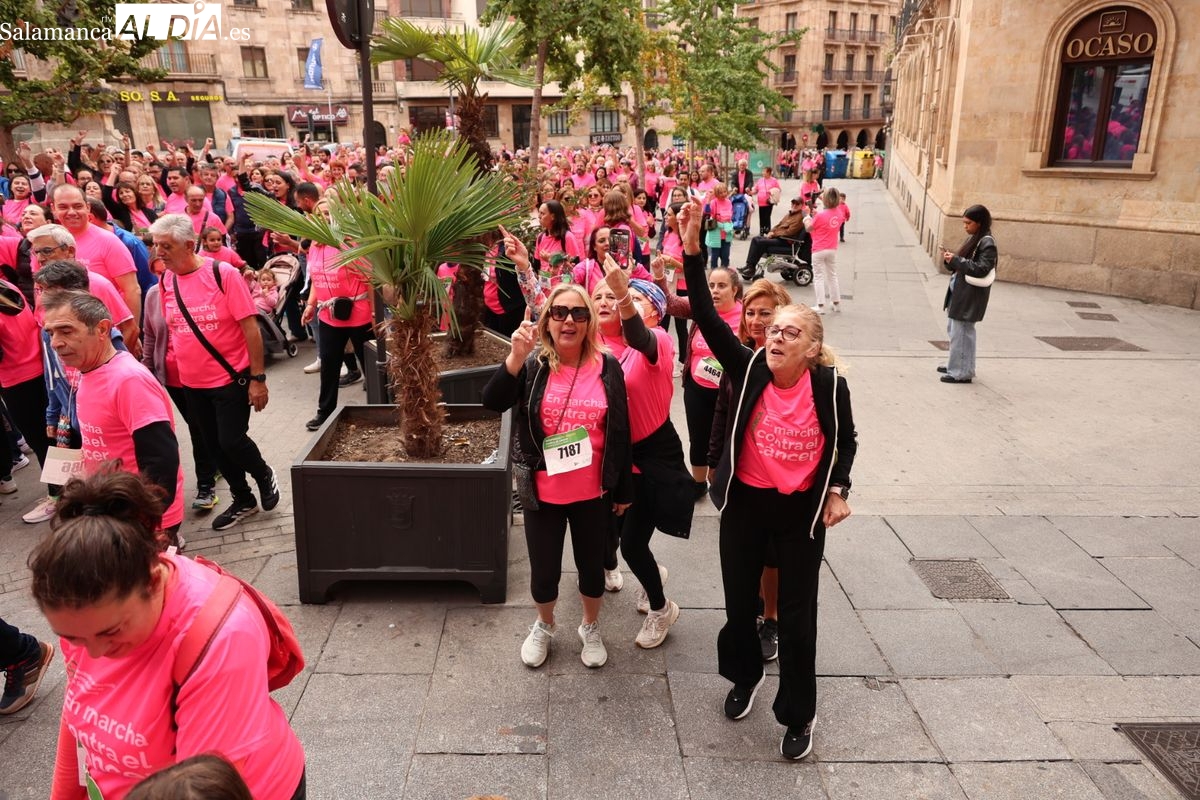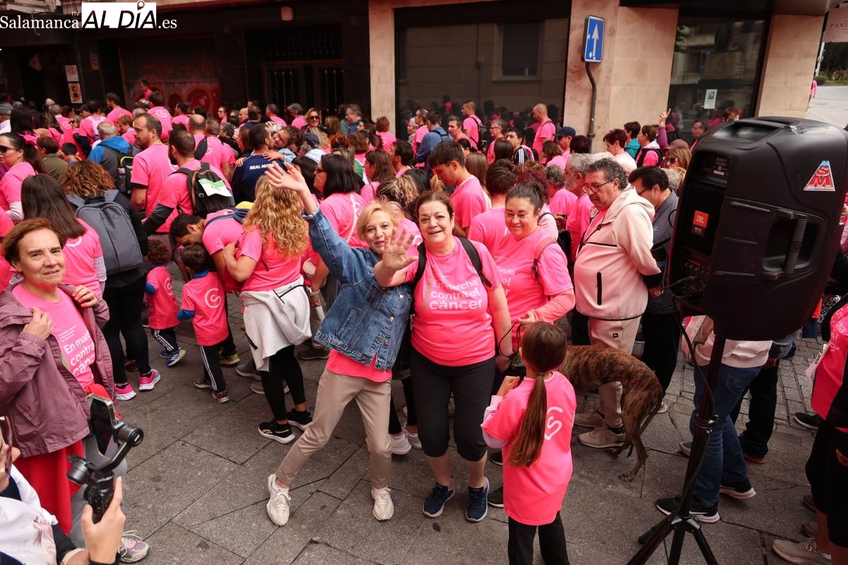 Salamanca se ha vuelto a teñir de rosa en la XI Marcha Contra el Cáncer. El evento, que ha comenzado a las 10:30 horas, ha sido un recorrido accesible de 6 kilómetros desde la iglesia del Arrabal hasta la Plaza Mayor. El objetivo es claro: sumar recursos para la investigación y contribuir a alcanzar la meta del 70% de supervivencia en cáncer para el año 2030.