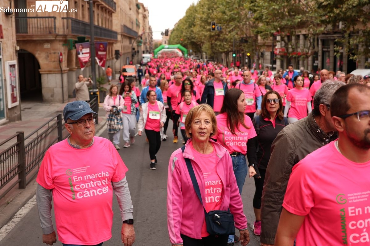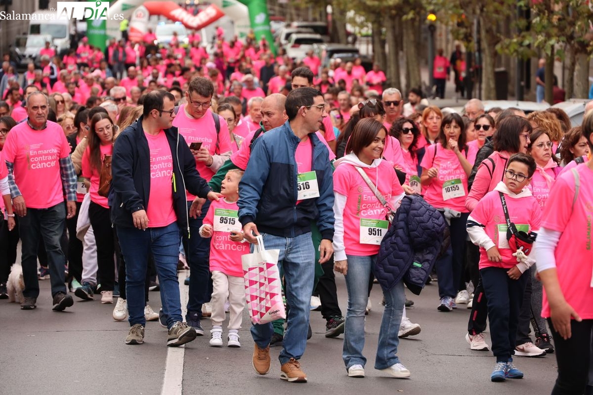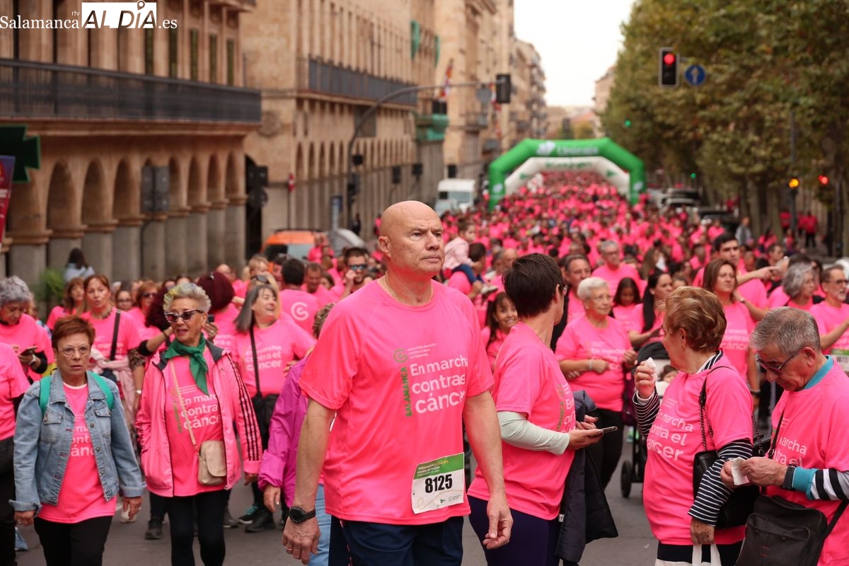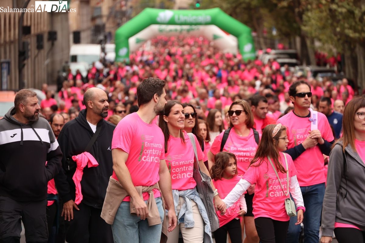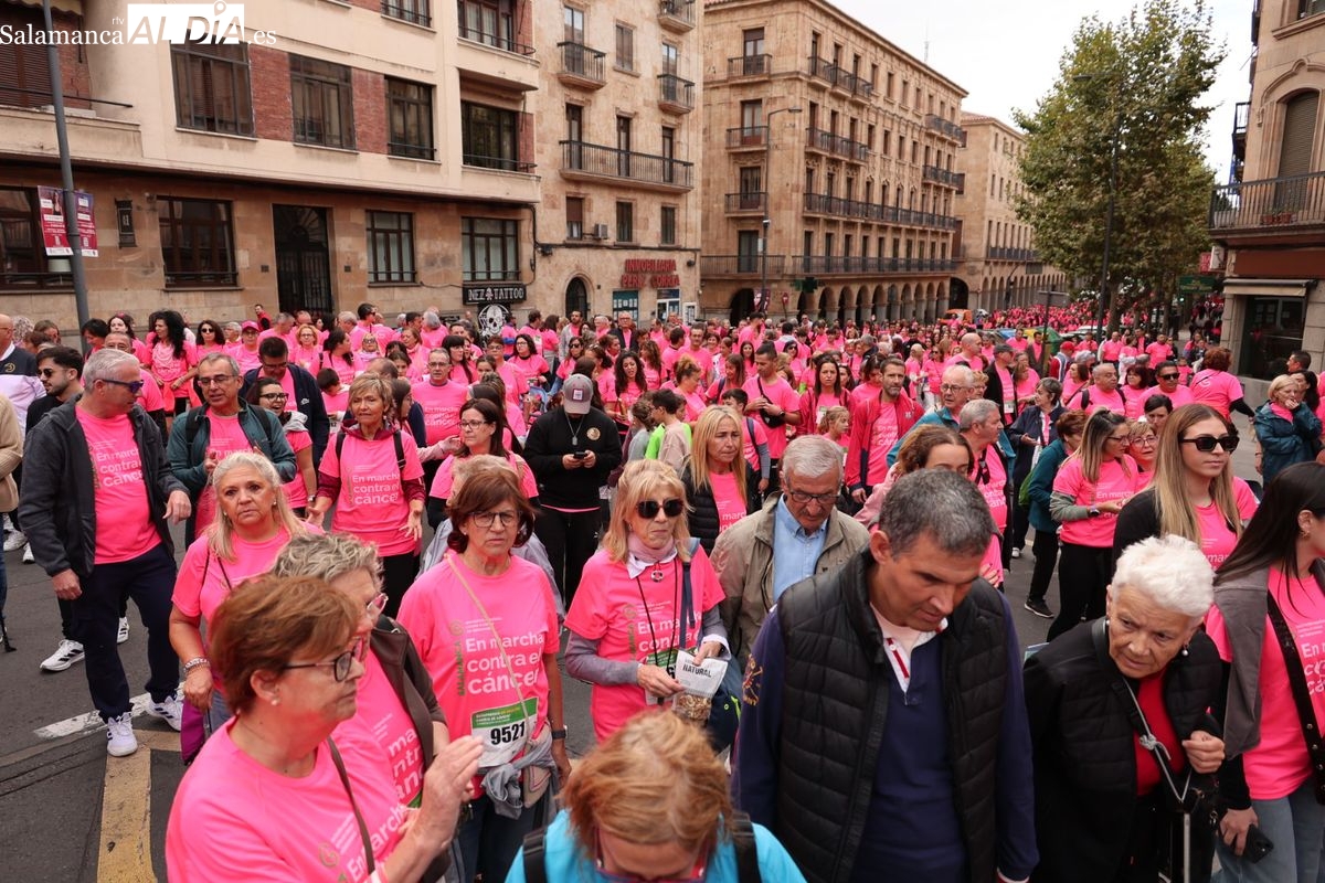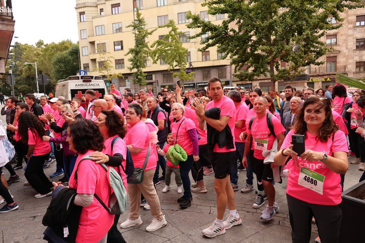 Salamanca se ha vuelto a teñir de rosa en la XI Marcha Contra el Cáncer. El evento, que ha comenzado a las 10:30 horas, ha sido un recorrido accesible de 6 kilómetros desde la iglesia del Arrabal hasta la Plaza Mayor. El objetivo es claro: sumar recursos para la investigación y contribuir a alcanzar la meta del 70% de supervivencia en cáncer para el año 2030.