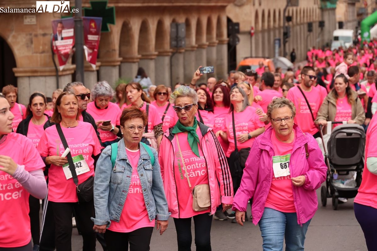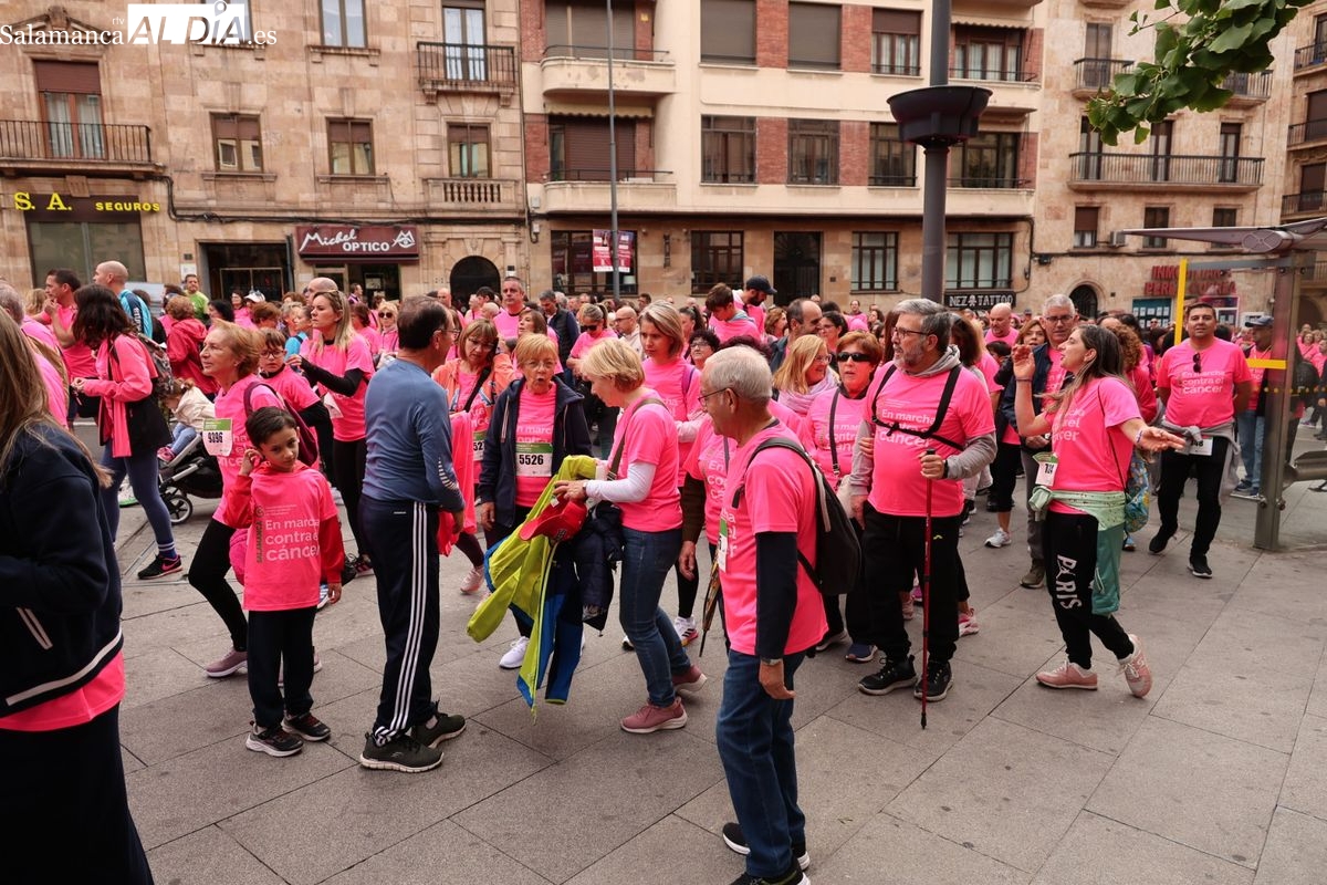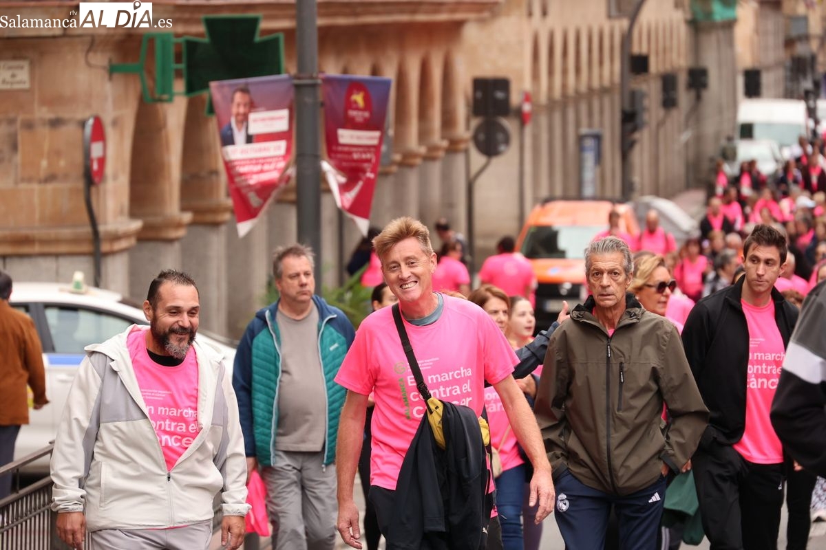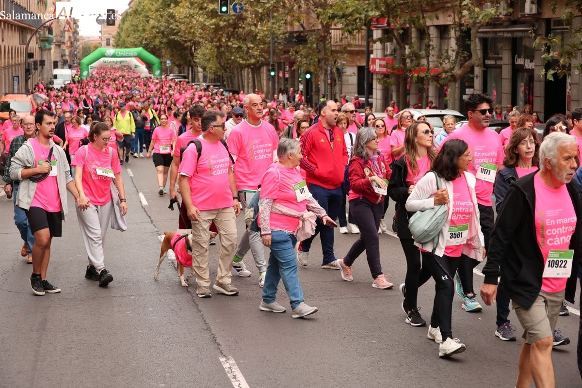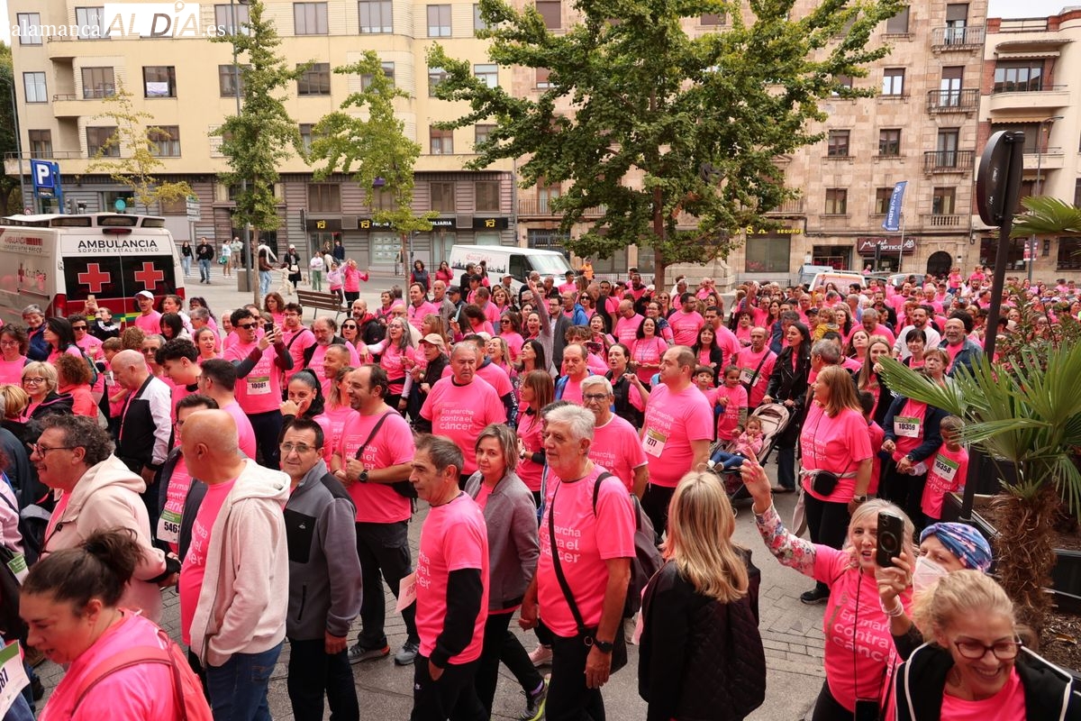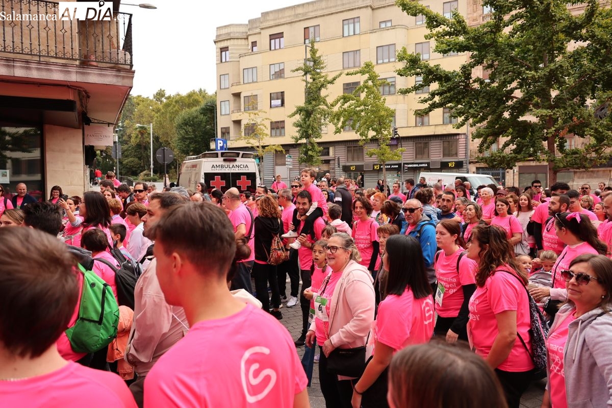 Salamanca se ha vuelto a teñir de rosa en la XI Marcha Contra el Cáncer. El evento, que ha comenzado a las 10:30 horas, ha sido un recorrido accesible de 6 kilómetros desde la iglesia del Arrabal hasta la Plaza Mayor. El objetivo es claro: sumar recursos para la investigación y contribuir a alcanzar la meta del 70% de supervivencia en cáncer para el año 2030.