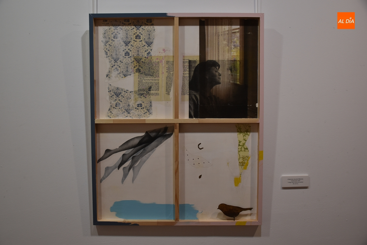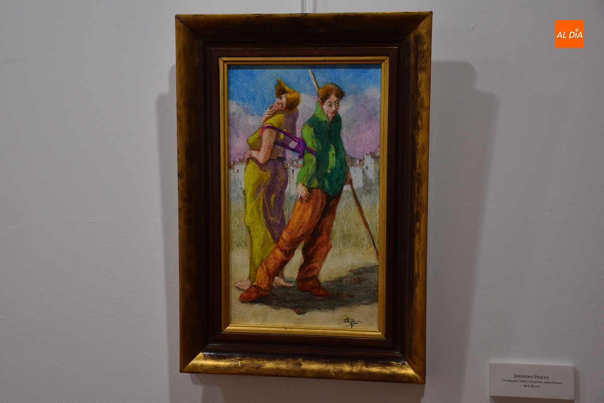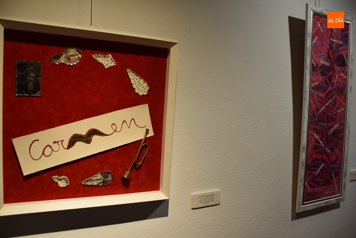 Entre esas obras hay una del mirobrigense Carlos García Medina, un collage de imágenes sobre fondo rosa en el que aparece varias veces el nombre de Carmen Martín Gaite y títulos de sus obras; y un cuadro de Jerónimo Prieto, natural de Espeja, en el que aparecen dos dagalis, denominación de los recién casados en la palra d’El Rebollal.