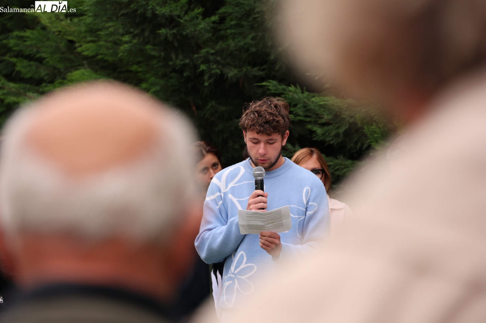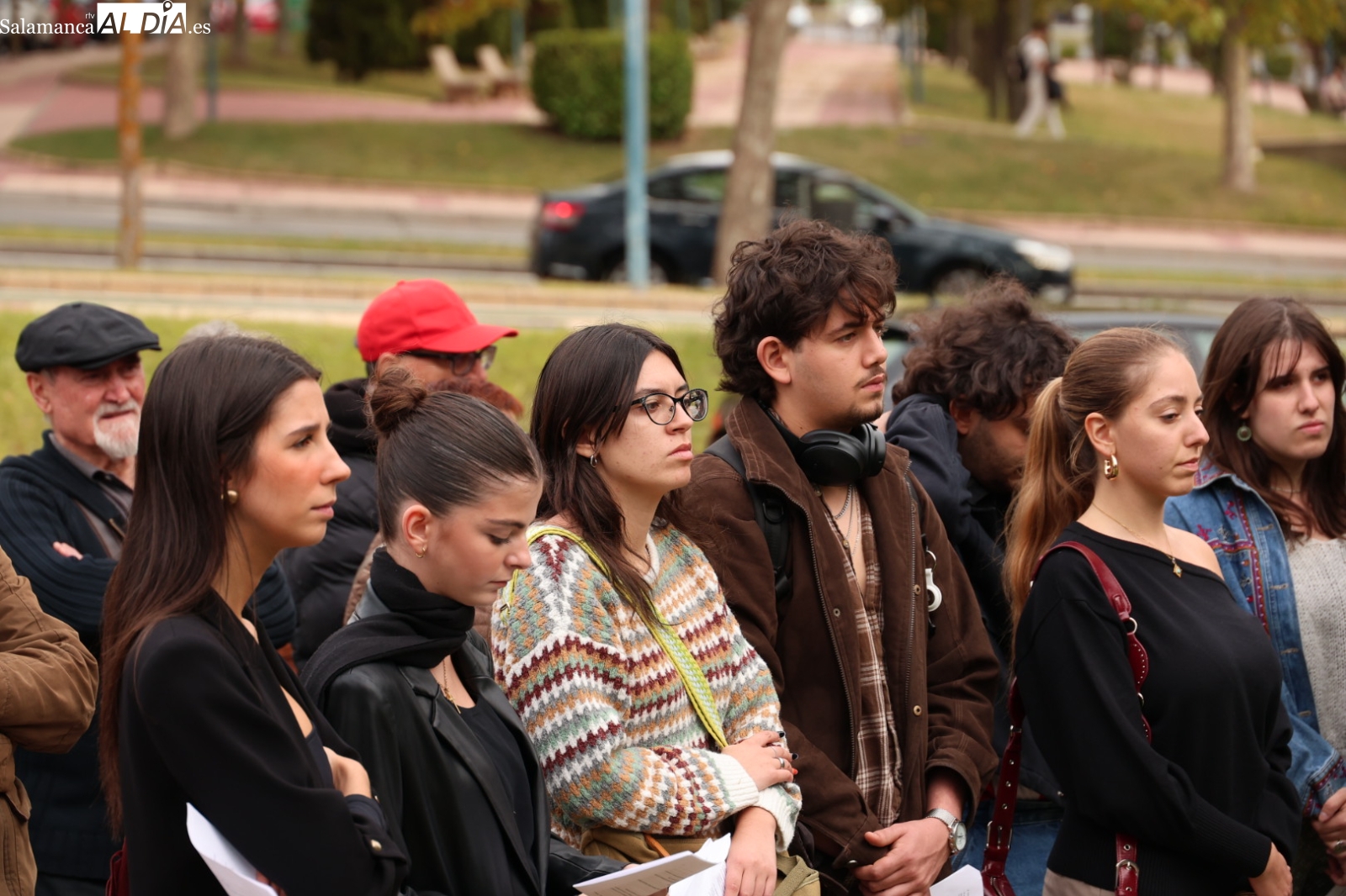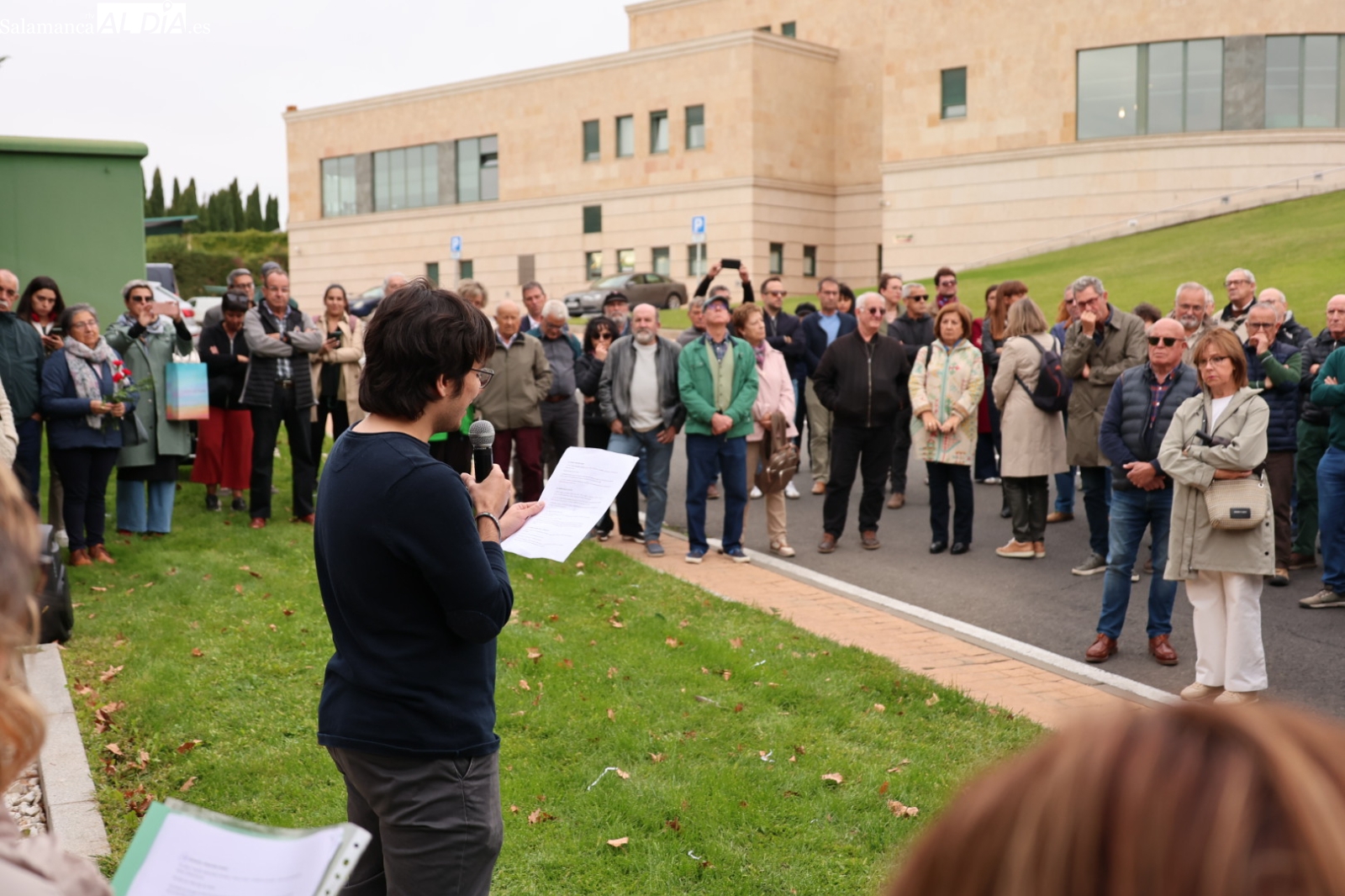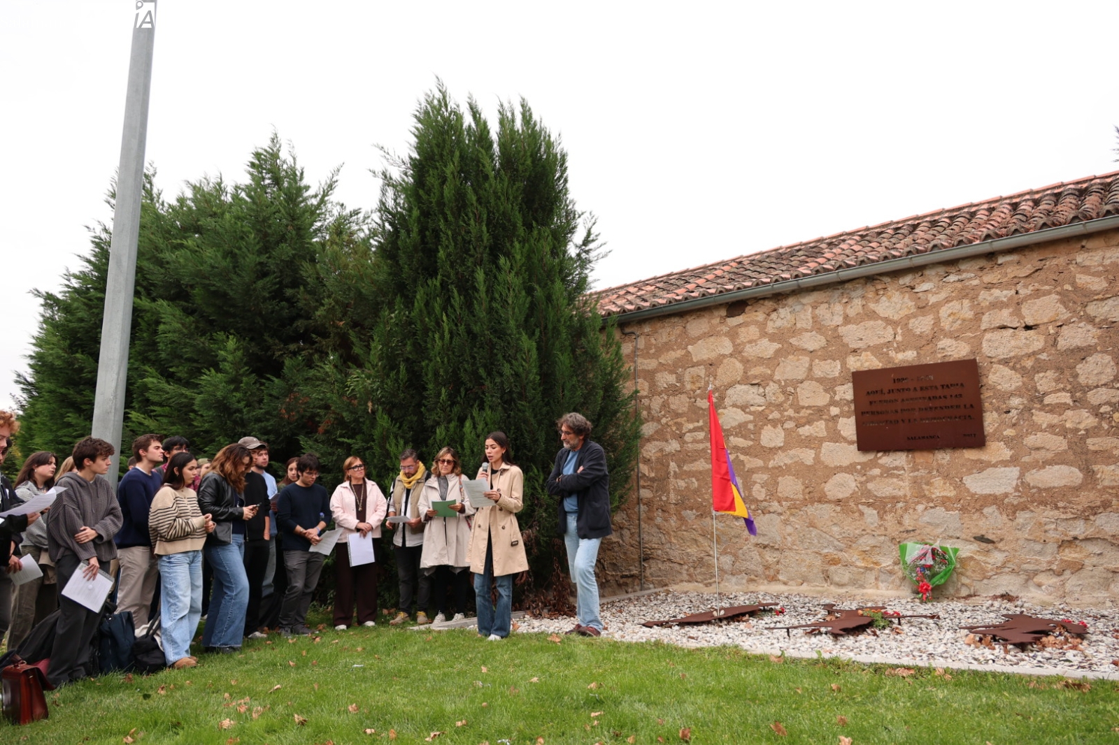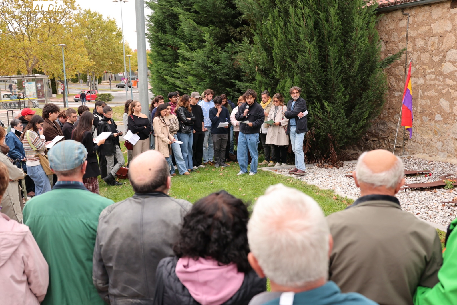 El homenaje, que se ha celebrado a las 17:00 horas frente al tanatorio, ha contado con la presencia de representantes municipales y de la subdelegada del Gobierno en Salamanca, Rosa López. Las intervenciones han corrido a cargo de Ana Vallejo, familiar de uno de los represaliados; Elena Martínez Barahona, profesora de Ciencia Política de la Universidad de Salamanca; y estudiantes de esta misma facultad, que han puesto voz a las víctimas leyendo sus biografías para evitar que caigan en el olvido.