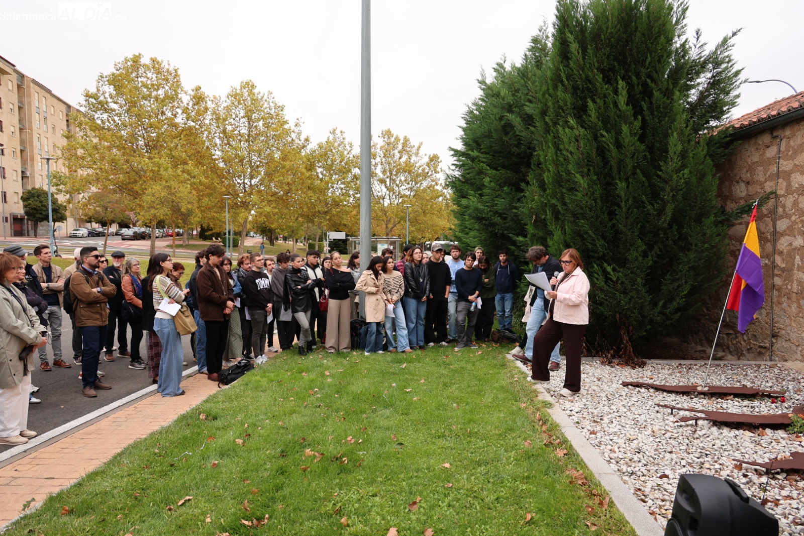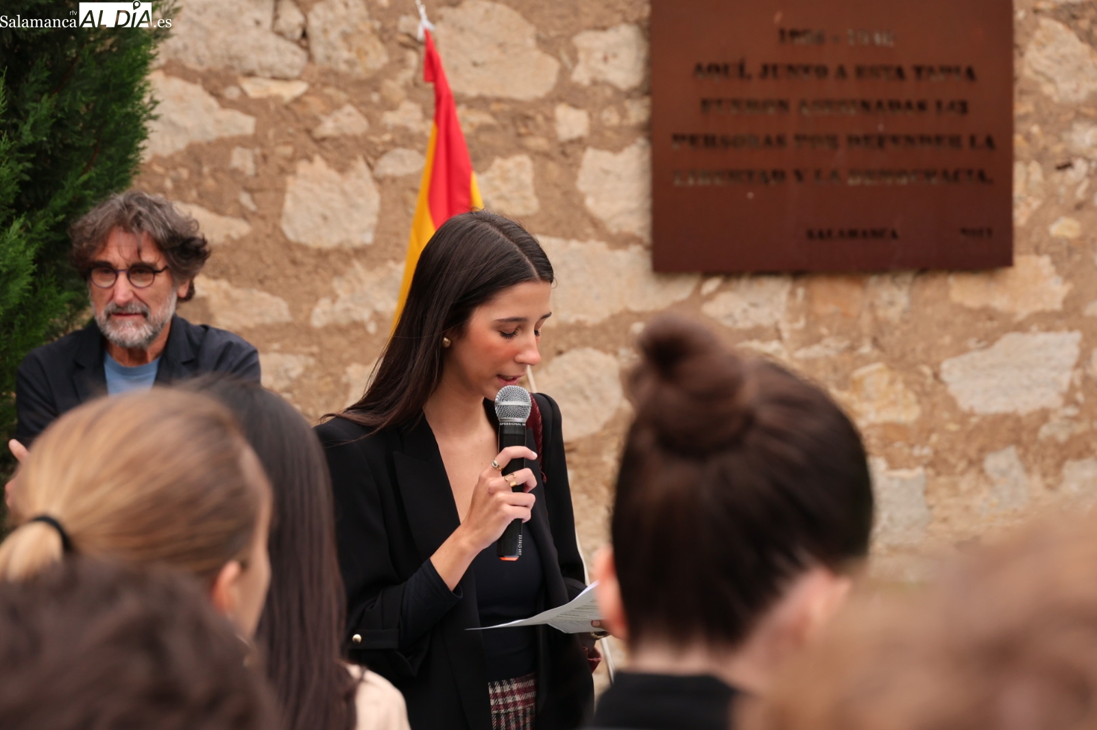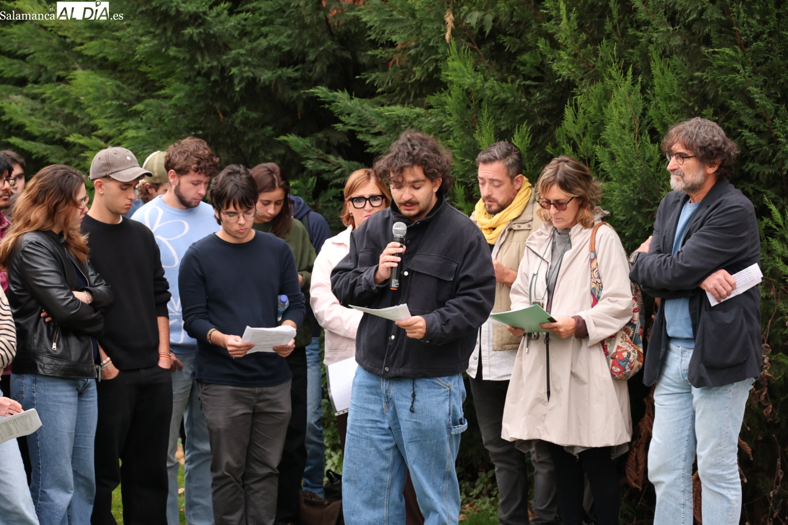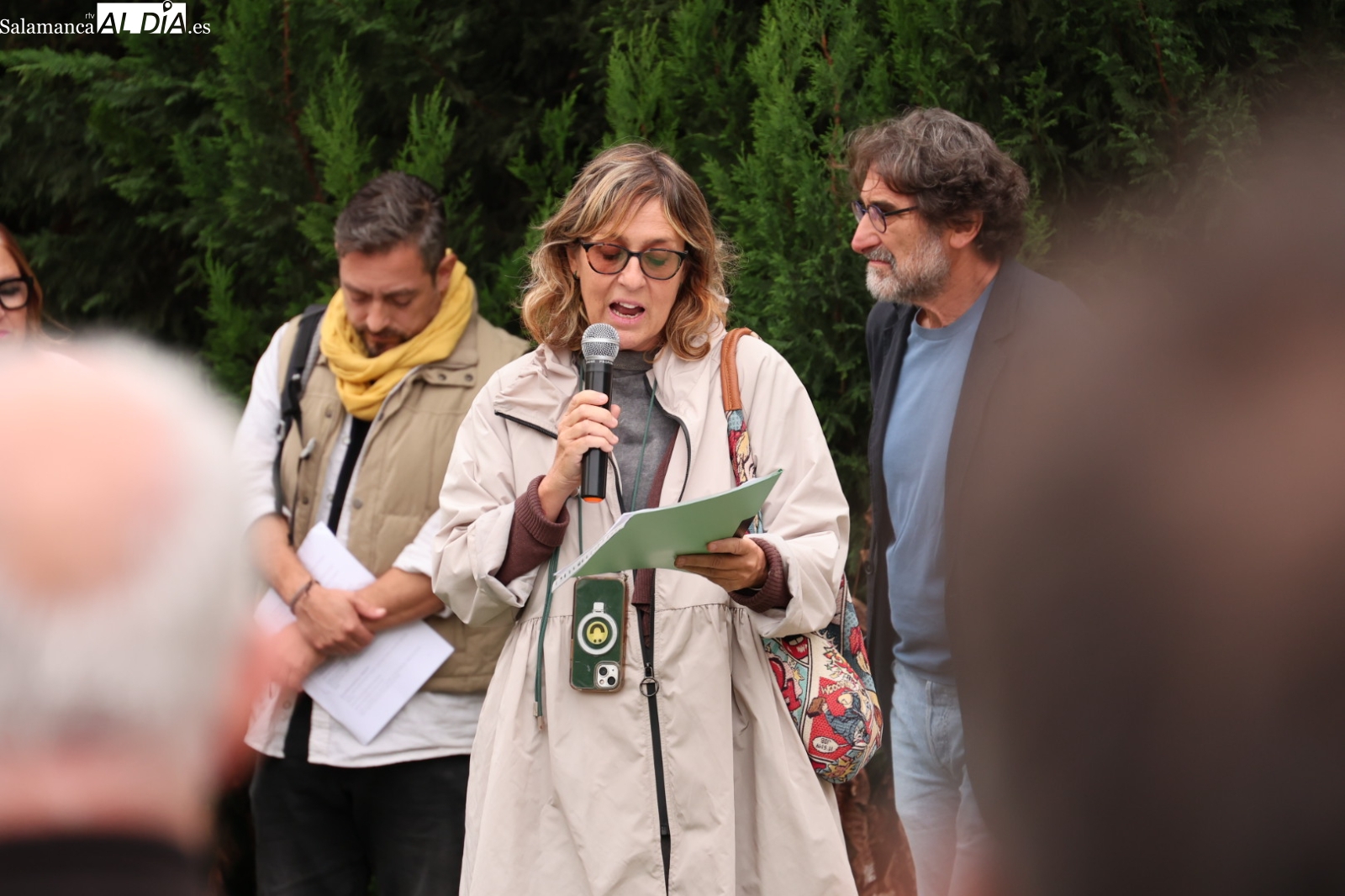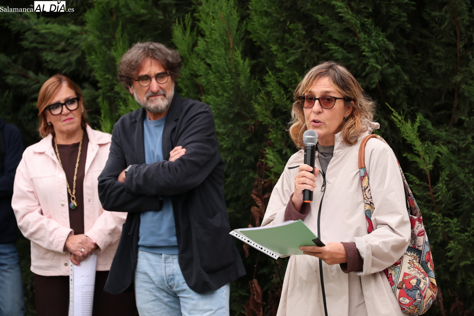 El homenaje, que se ha celebrado a las 17:00 horas frente al tanatorio, ha contado con la presencia de representantes municipales y de la subdelegada del Gobierno en Salamanca, Rosa López. Las intervenciones han corrido a cargo de Ana Vallejo, familiar de uno de los represaliados; Elena Martínez Barahona, profesora de Ciencia Política de la Universidad de Salamanca; y estudiantes de esta misma facultad, que han puesto voz a las víctimas leyendo sus biografías para evitar que caigan en el olvido.