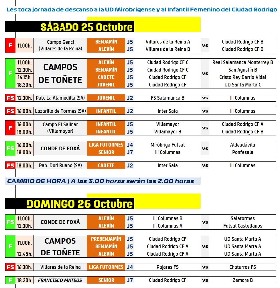 El último fin de semana deportivo de octubre, en el que se producirá el cambio de hora en la madrugada del sábado al domingo, trae dos duelos por sendos lideratos en las tardes del sábado y el domingo en Ciudad Rodrigo. Para empezar, este sábado juega su 1º partido de la temporada en Ciudad Rodrigo el Miróbriga Futsal, que se mide a Aldeadávila, que está empatado a 7 puntos con los mirobrigenses en lo alto de la 1ª División Futormes (también tiene esa puntuación el Tari Team).