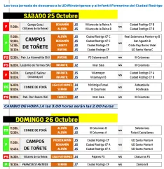 Esas serán las últimas citas de un fin de semana con bastante deporte en Ciudad Rodrigo. Por un lado, vuelven a jugar por 2ª semana consecutiva en casa los 5 equipos del Ciudad Rodrigo CF que militan en sus respectivas primeras divisiones provinciales, a los que se suman el Benjamín C y el Alevín C, cuyas categorías tienen un ritmo diferente al no contar con el numero estándar de equipos (14).