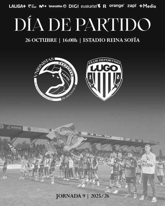 ¡Saludos y bienvenidos a la retransmisión en directo del Unionistas - Lugo! Desde SALAMANCArtv AL DÍA te contamos todo lo que pase en el partido y así no te pierdes absolutamente nada gracias a nuestro minuto a minuto. El balón comenzará a rodar en el Reina Sofía a partir de las 16:00 horas en la jornada 9 de Liga de Primera Federación.