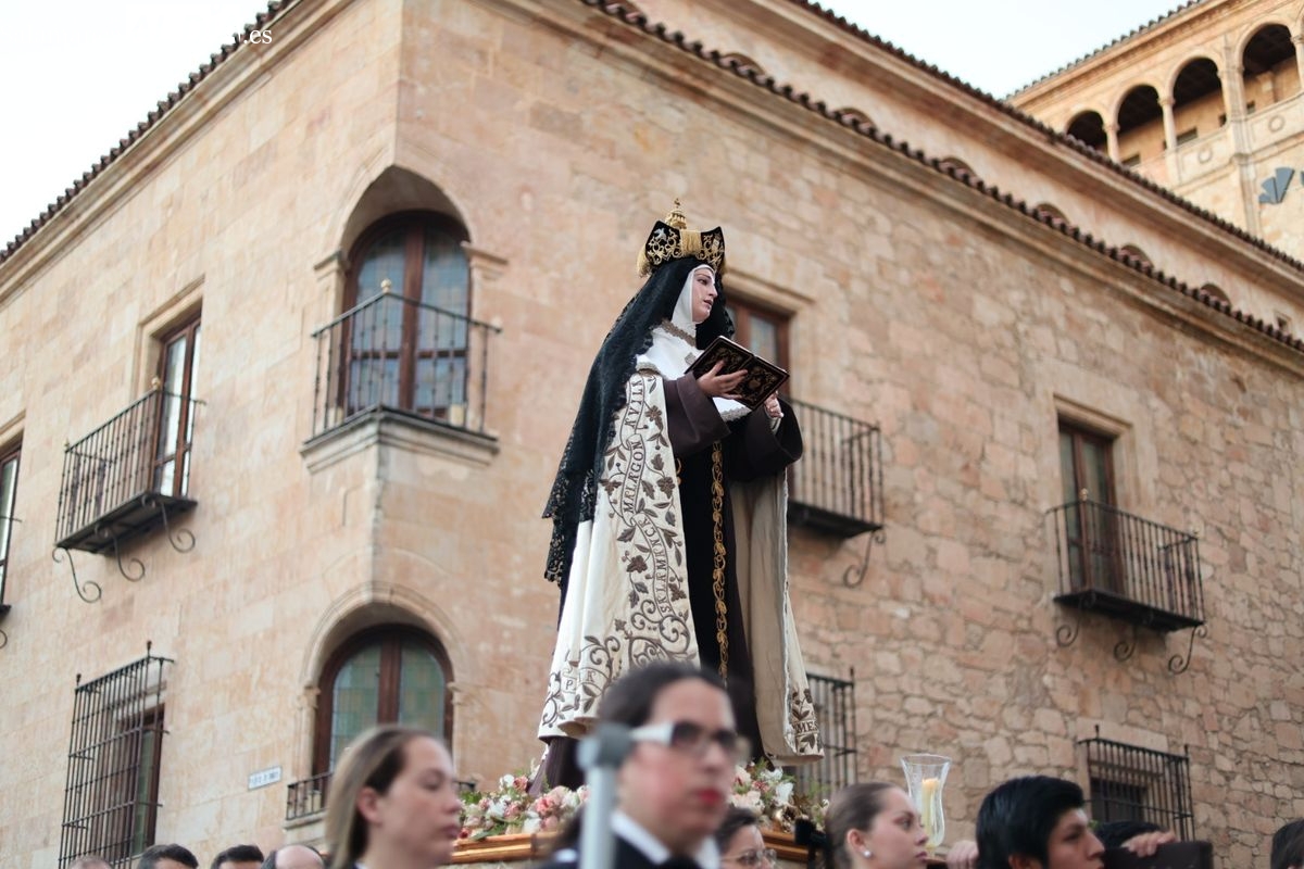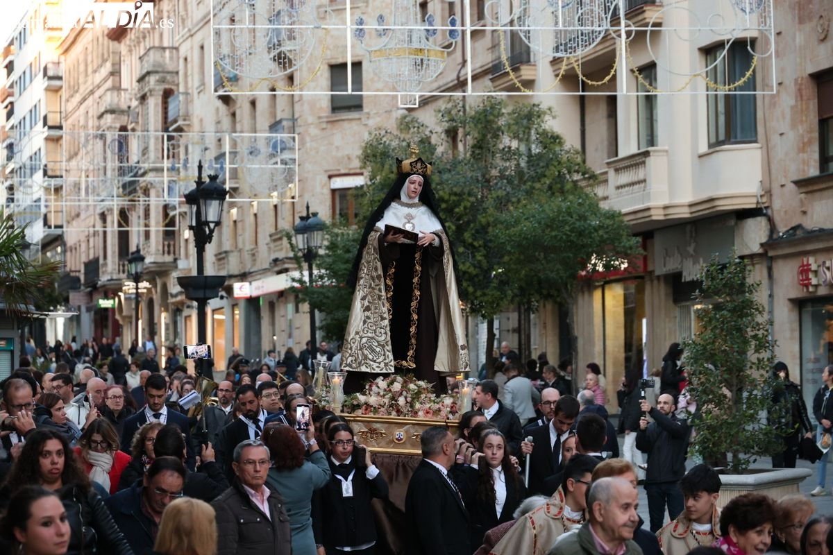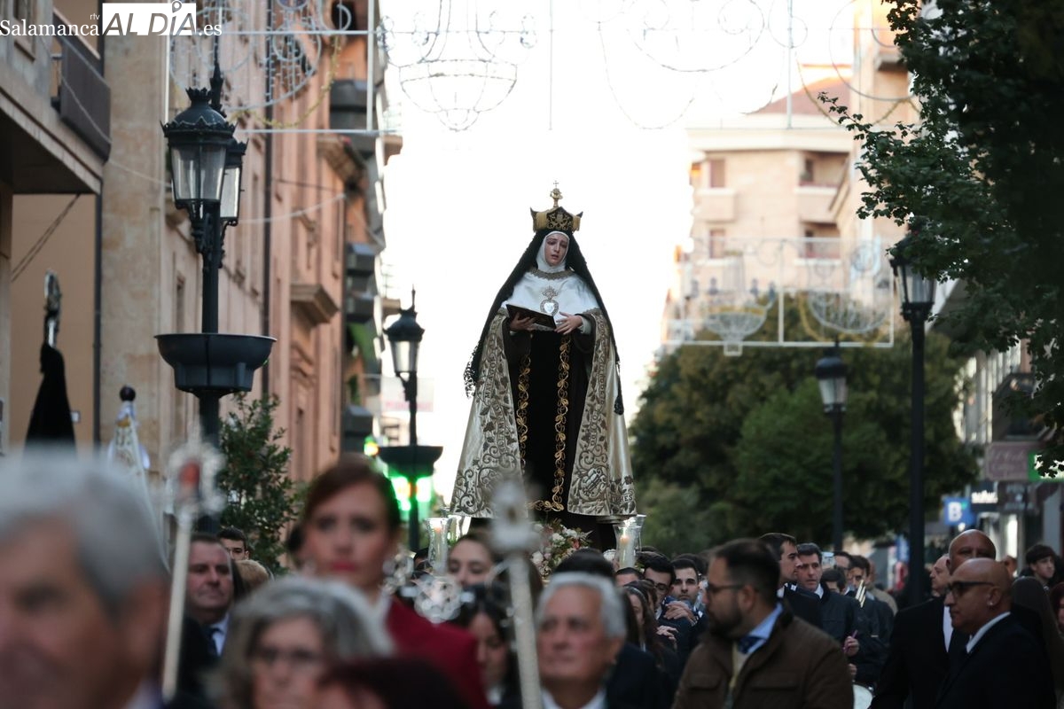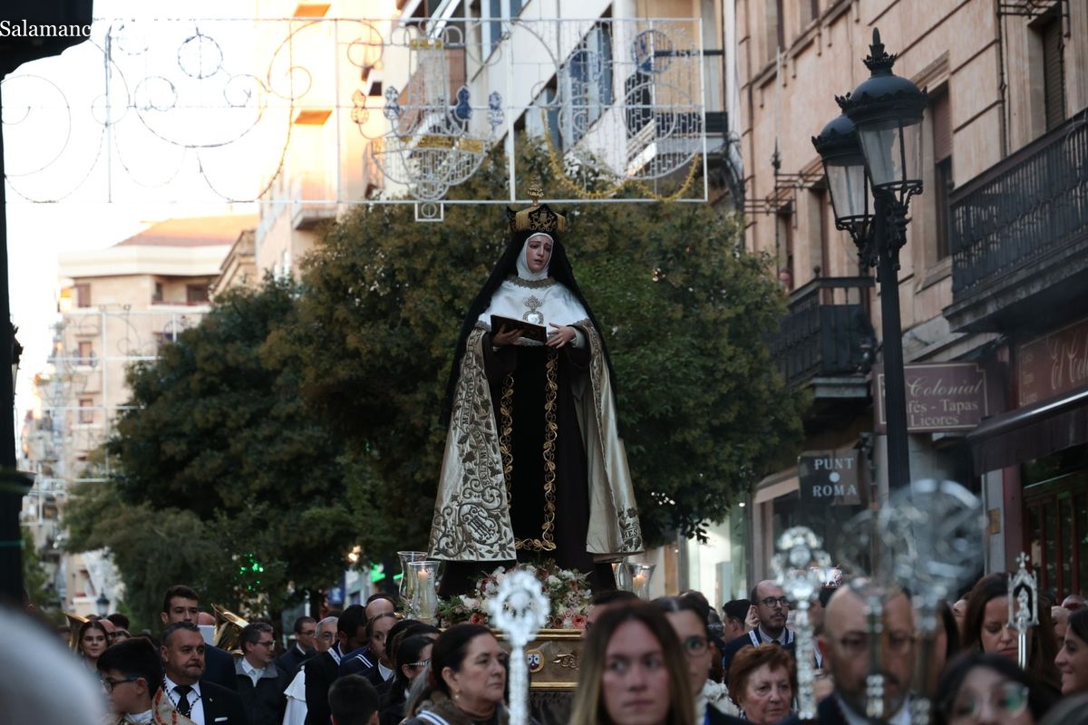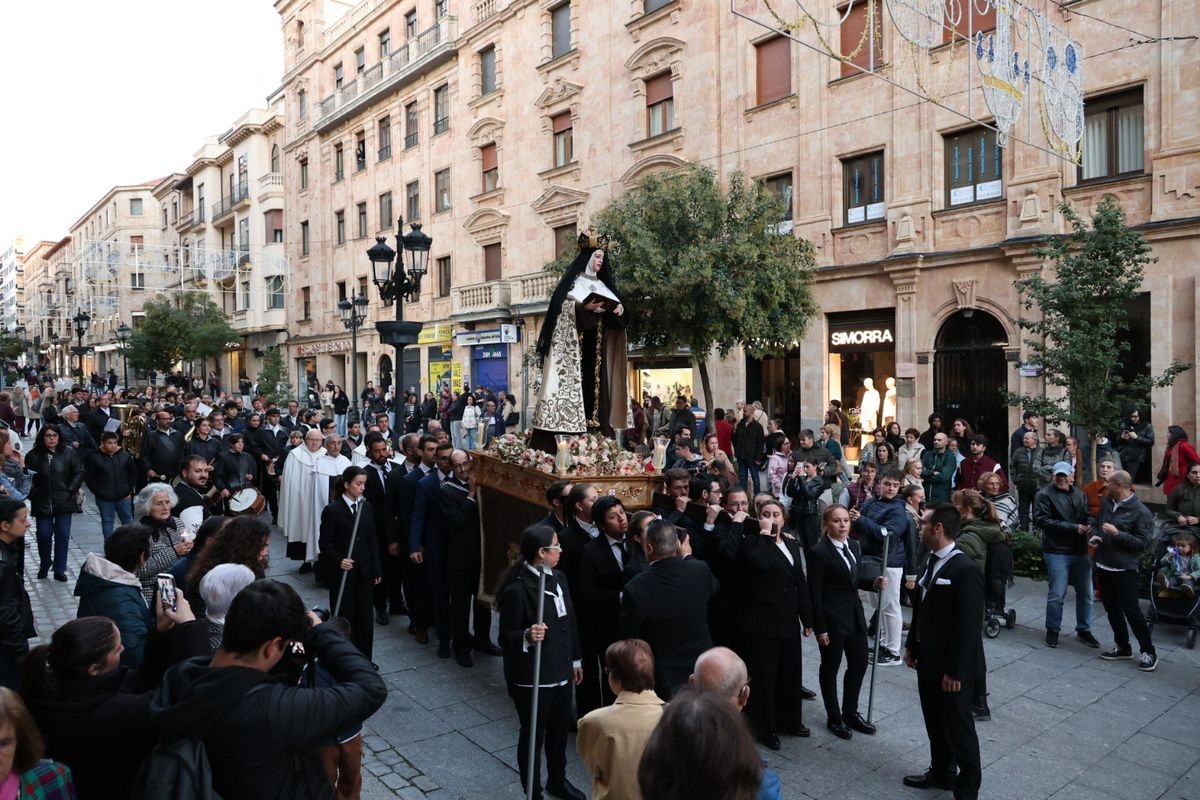 Las calles del centro de Salamanca han sido el escenario este domingo de la procesión en honor a Santa Teresa de Jesús. La imagen de la santa ha estado acompañada por numerosos fieles, en un emotivo acto de homenaje organizado por la Orden de Carmelitas Descalzos de Salamanca y Alba de Tormes.