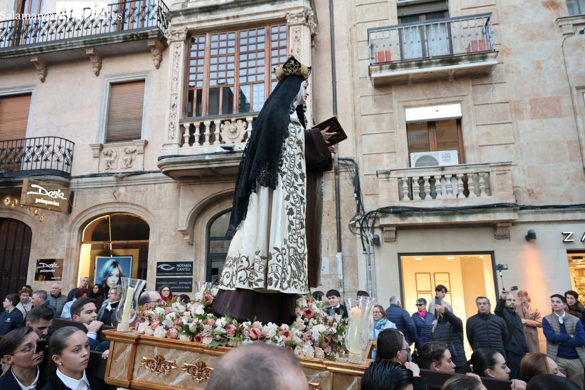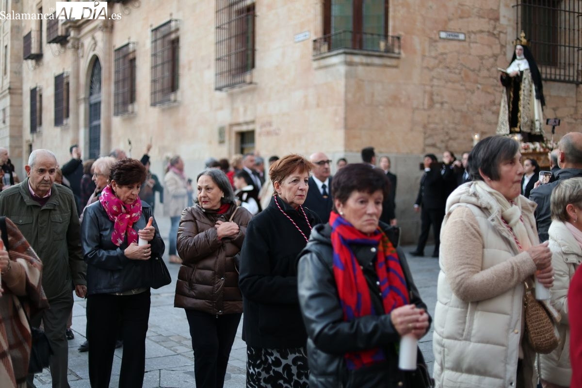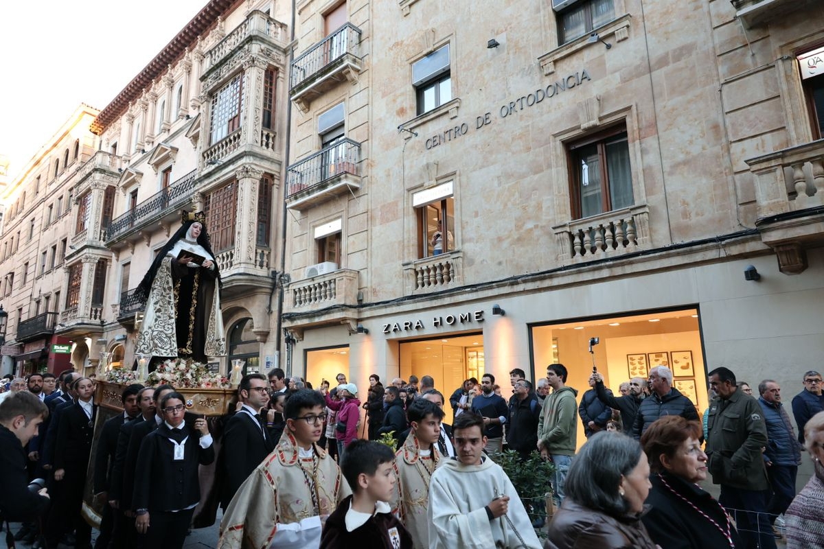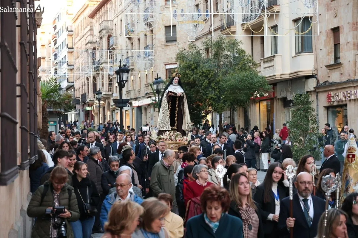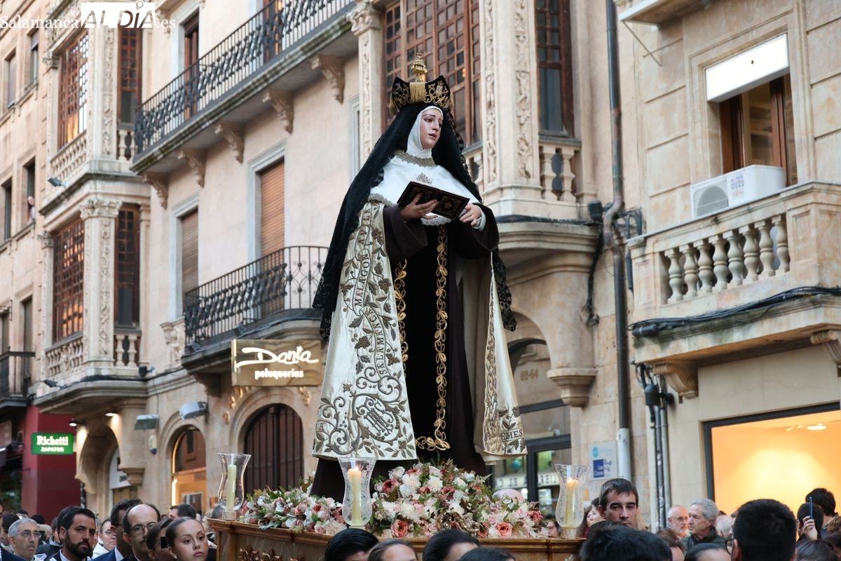 Las calles del centro de Salamanca han sido el escenario este domingo de la procesión en honor a Santa Teresa de Jesús. La imagen de la santa ha estado acompañada por numerosos fieles, en un emotivo acto de homenaje organizado por la Orden de Carmelitas Descalzos de Salamanca y Alba de Tormes.