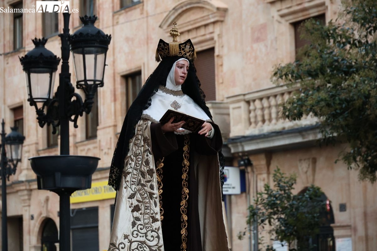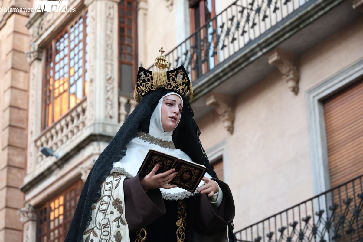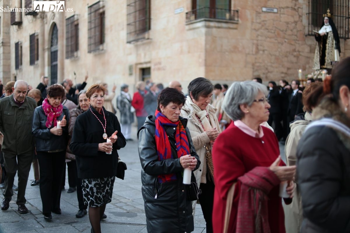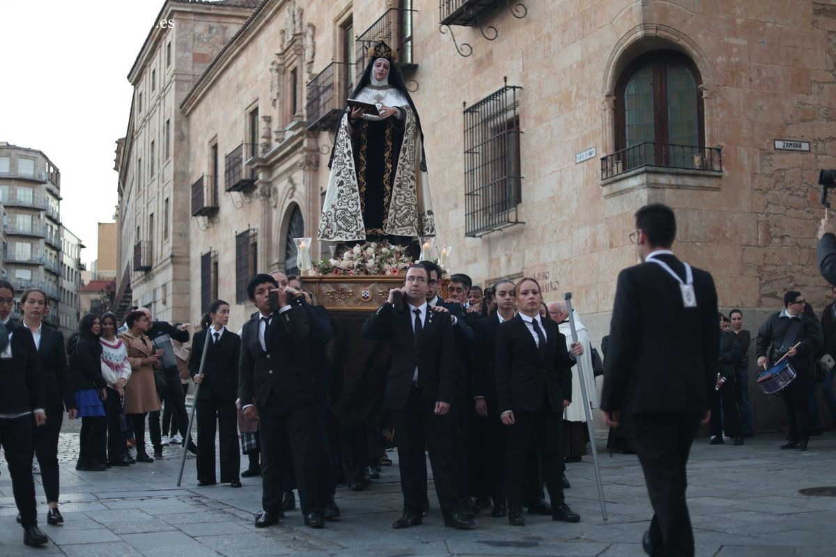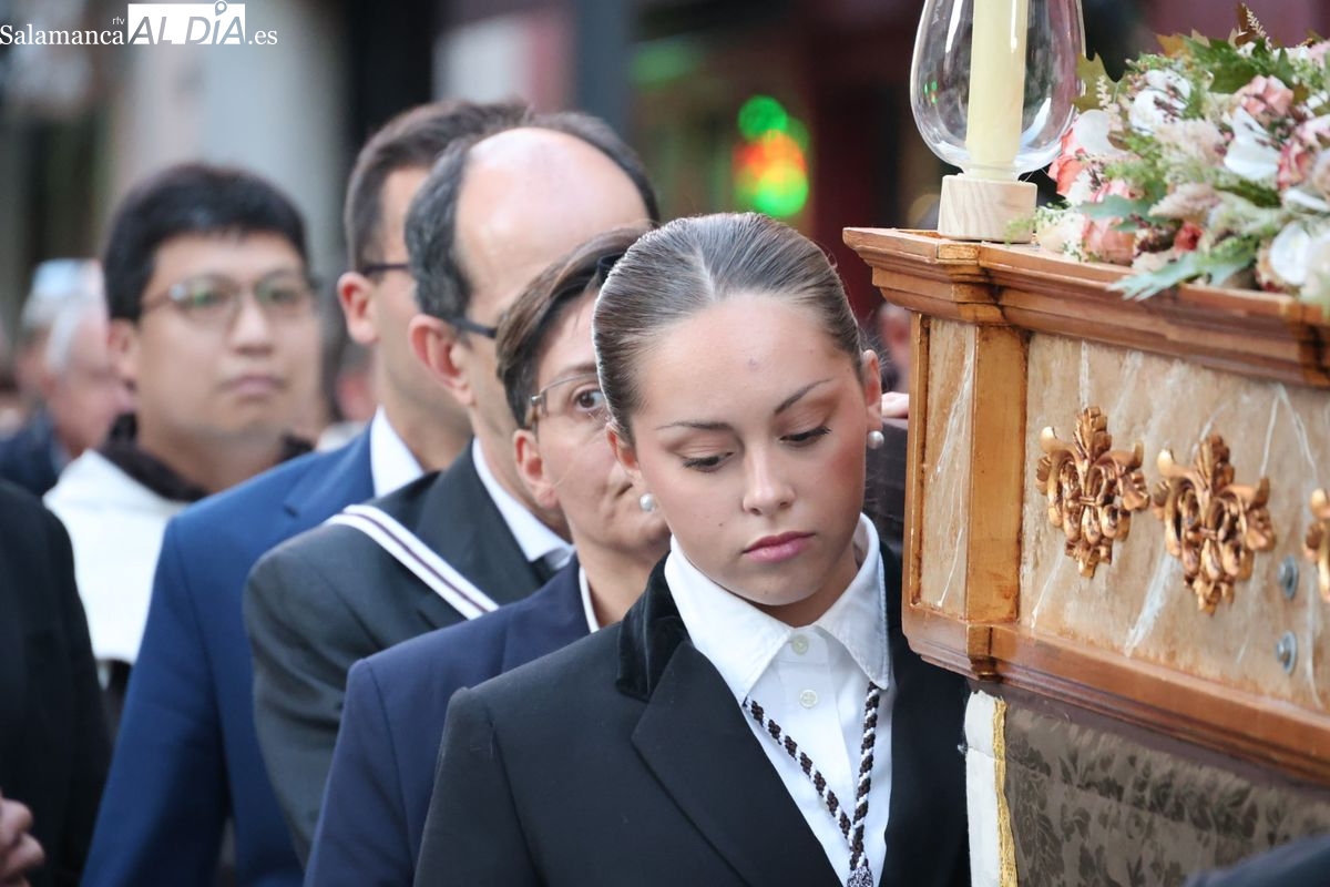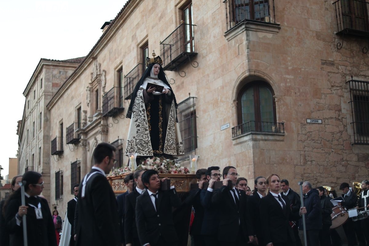 Las calles del centro de Salamanca han sido el escenario este domingo de la procesión en honor a Santa Teresa de Jesús. La imagen de la santa ha estado acompañada por numerosos fieles, en un emotivo acto de homenaje organizado por la Orden de Carmelitas Descalzos de Salamanca y Alba de Tormes.