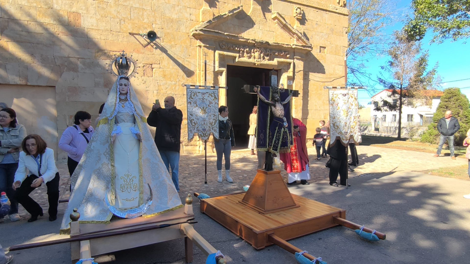 Durante el recorrido, el Cristo de Hornillos y la Virgen fueron portados a hombros por los fieles, en un itinerario breve alrededor de la ermita. La emoción y el fervor marcaron el paso de las imágenes, mientras vecinos y visitantes aprovechaban para tomar las tradicionales fotografías y para que los más pequeños pudieran subirse al Cristo, cumpliendo con una costumbre muy arraigada en el pueblo.