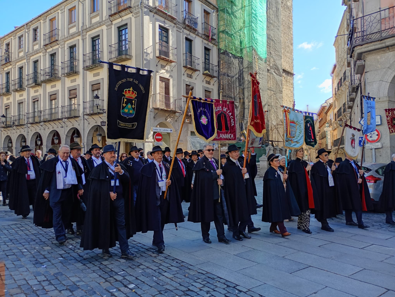 Ataviados con la tradicional capa charra y portando con orgullo el estandarte del municipio, los participantes recorrieron las calles segovianas junto a representantes de otras localidades españolas que comparten esta emblemática prenda como símbolo de identidad y tradición.