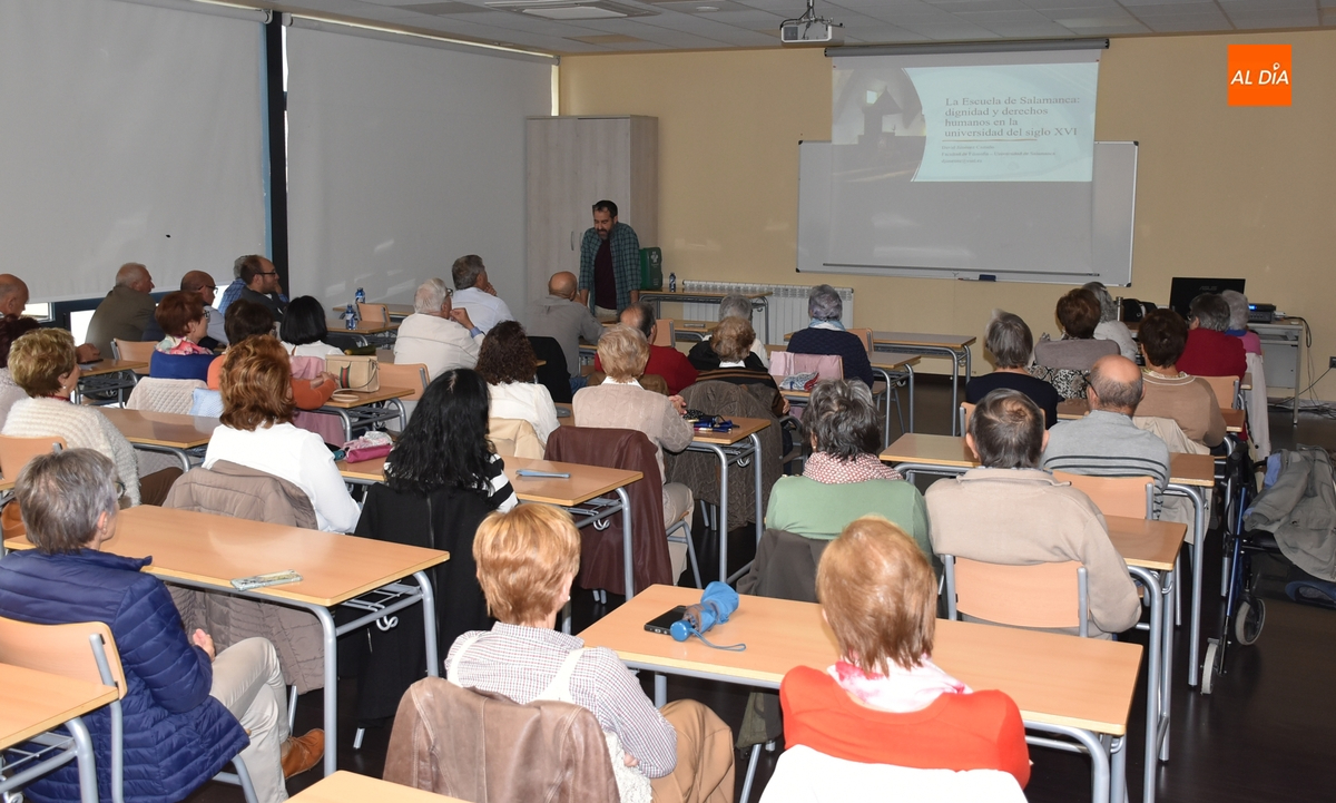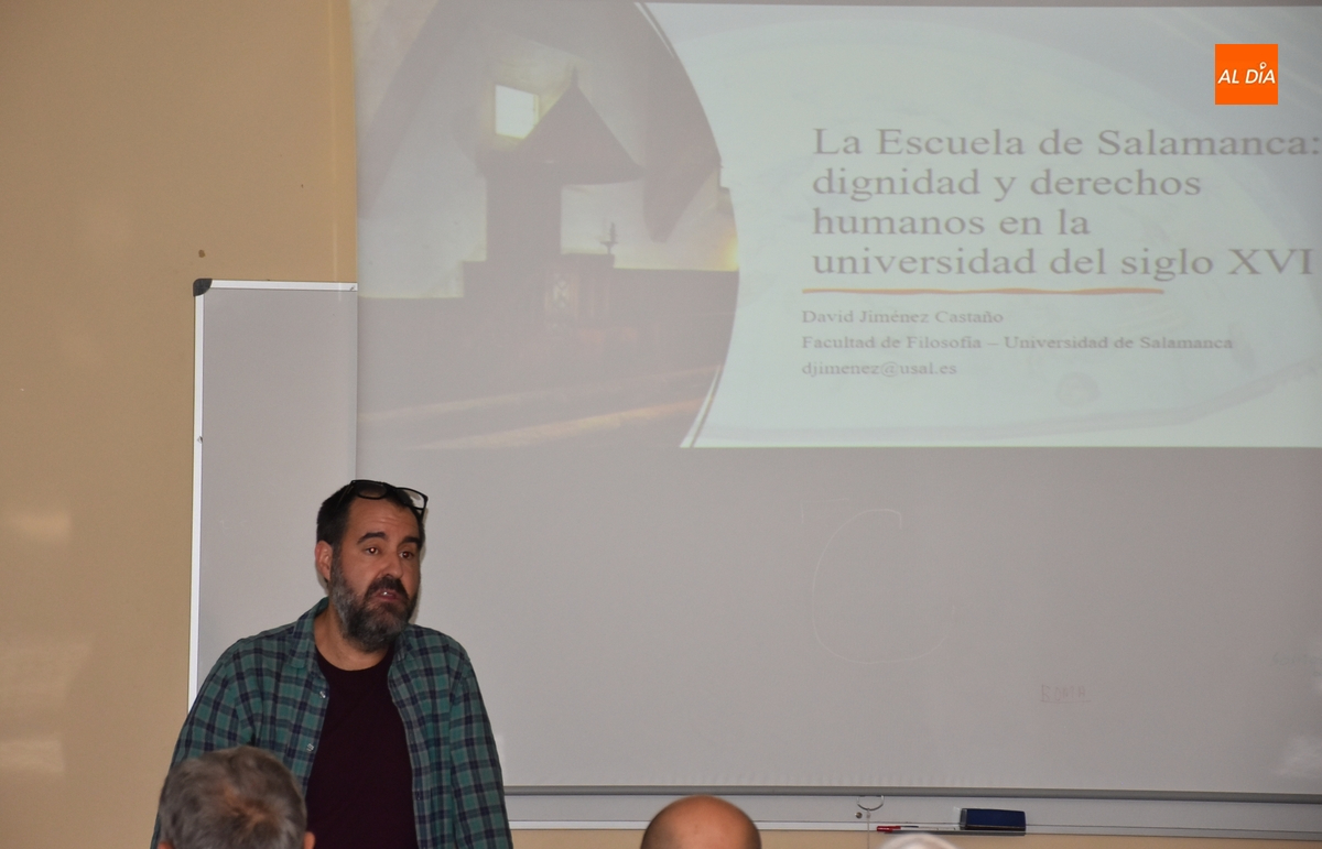 David Jiménez Castaño disertó sobre la Escuela de Salamanca (de cuya fundación se cumplirá el año que viene el quinto centenario), resaltando el importante papel que jugó en el nacimiento de los derechos humanos y del derecho internacional moderno, “un tema candente” hoy en día, incidiendo en la figura de Francisco de Vitoria, fundador de la Escuela, y sus trabajos Relecciones sobre los indios y el derecho de guerra.